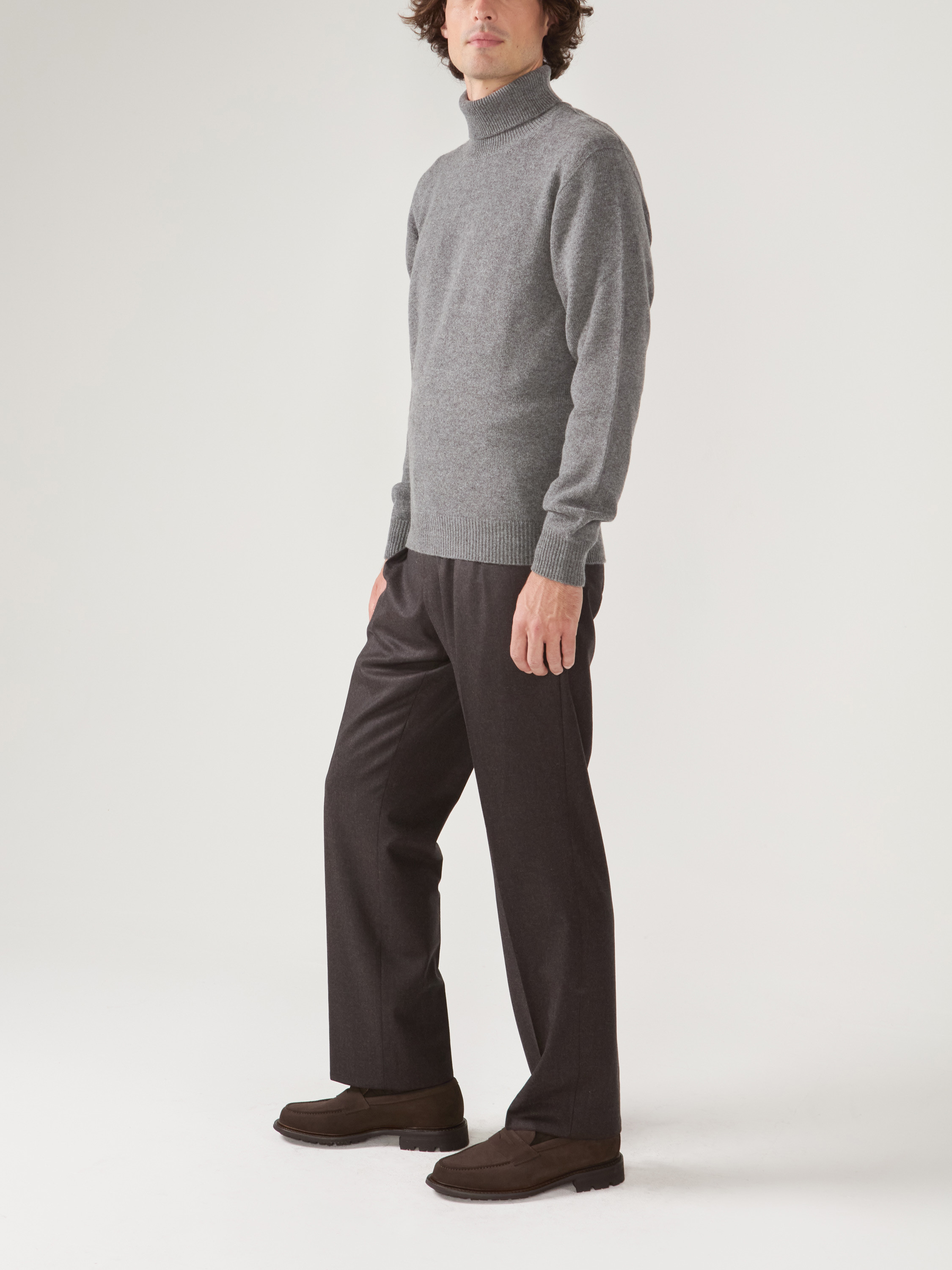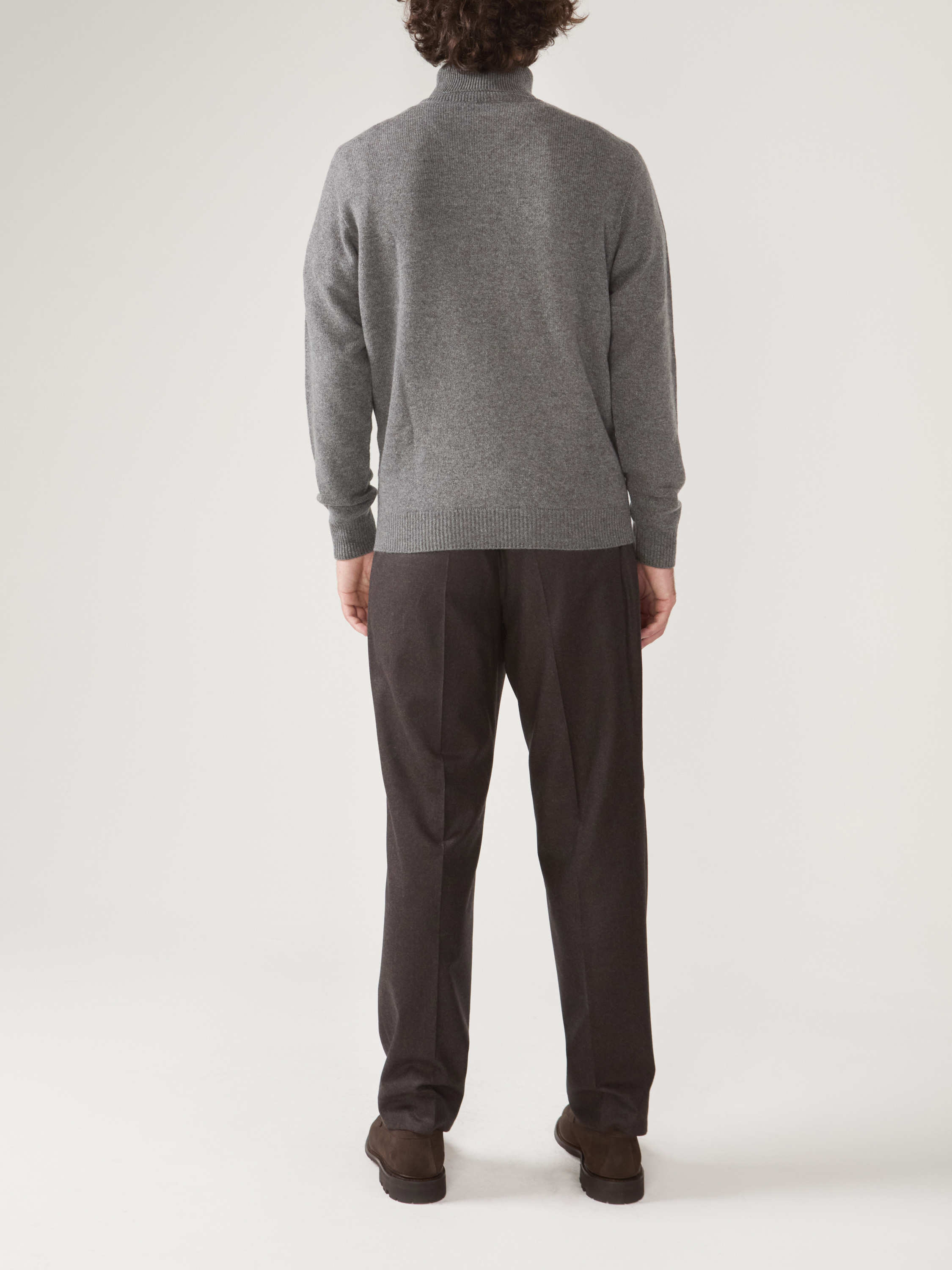 Medium-gray cashmere turtleneck pullover, long sleeves.