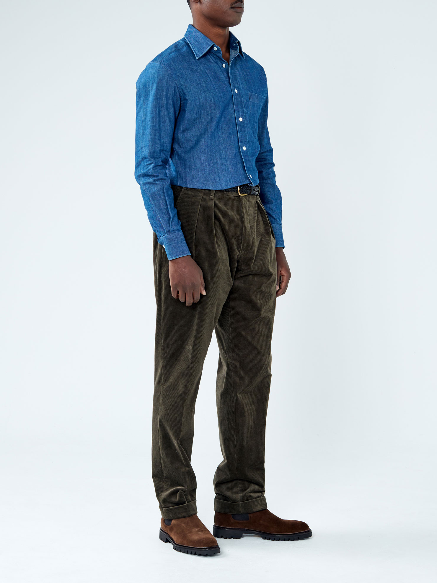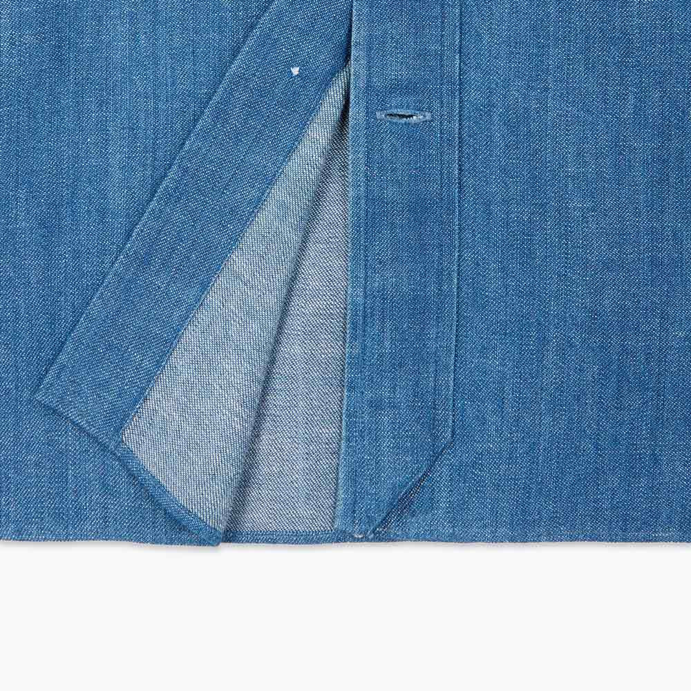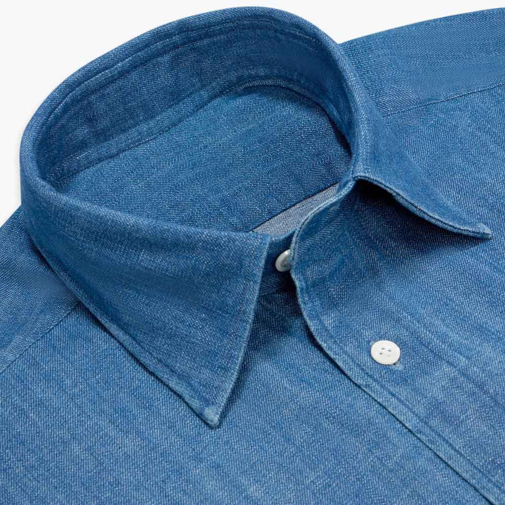 Denim shirt cut from our wearable Japanese thick denim. Soft pointed collar, mother-of-pearl buttons, single pocket. The shirt has been assembled before being washed to give it a vintage look. Washing made-to-measure shirts with shrinkage in mind is a complex technique that our workshop has mastered to perfection.