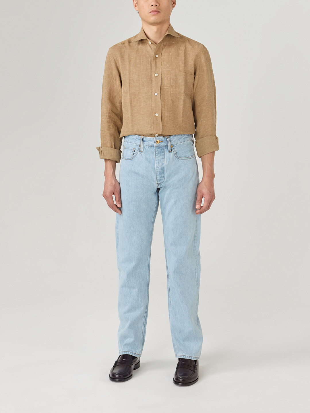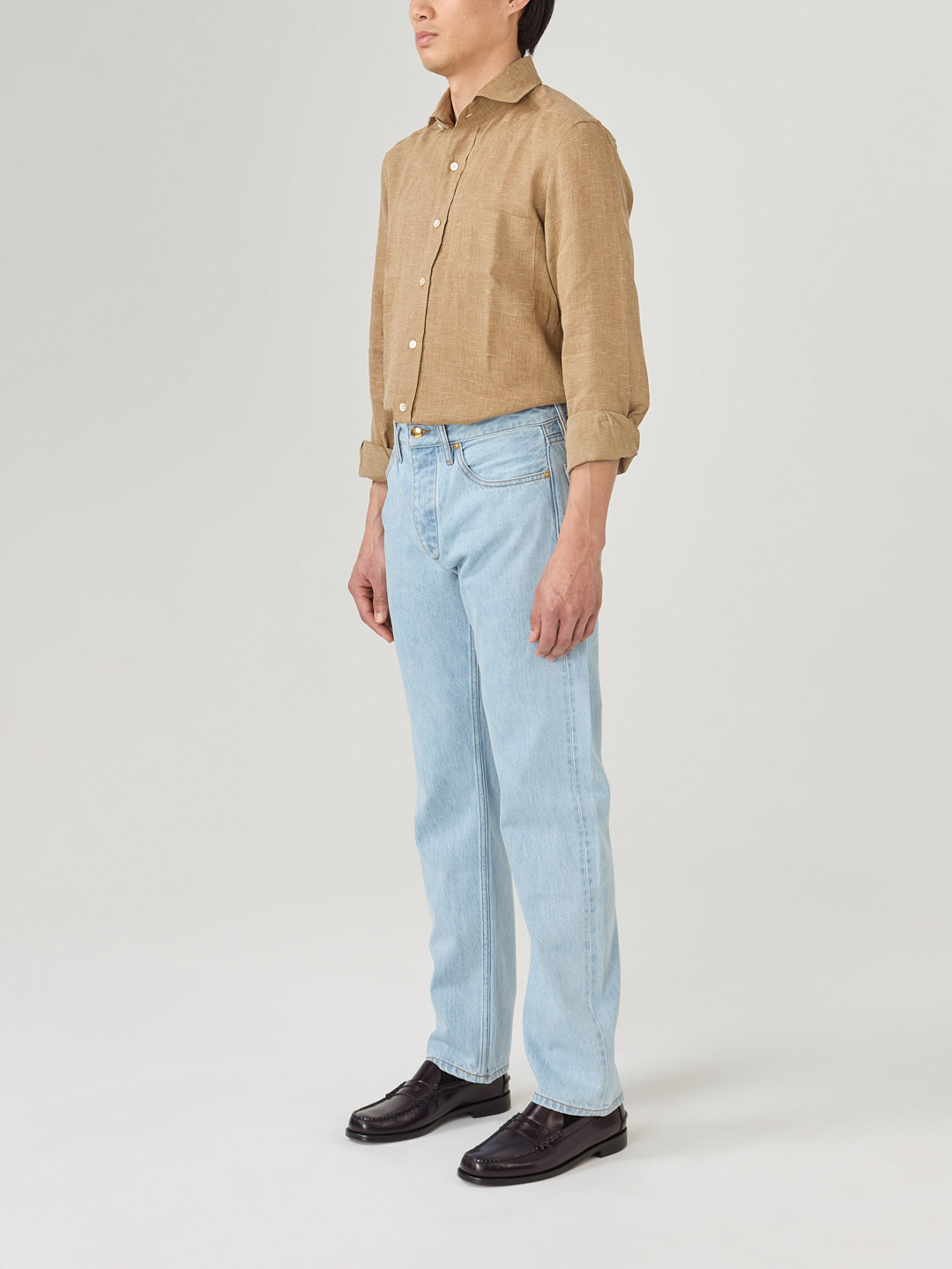 Our standard shirt is put together with a single, continuous movement encapsulating both the side seams and the seam along the sleeves.