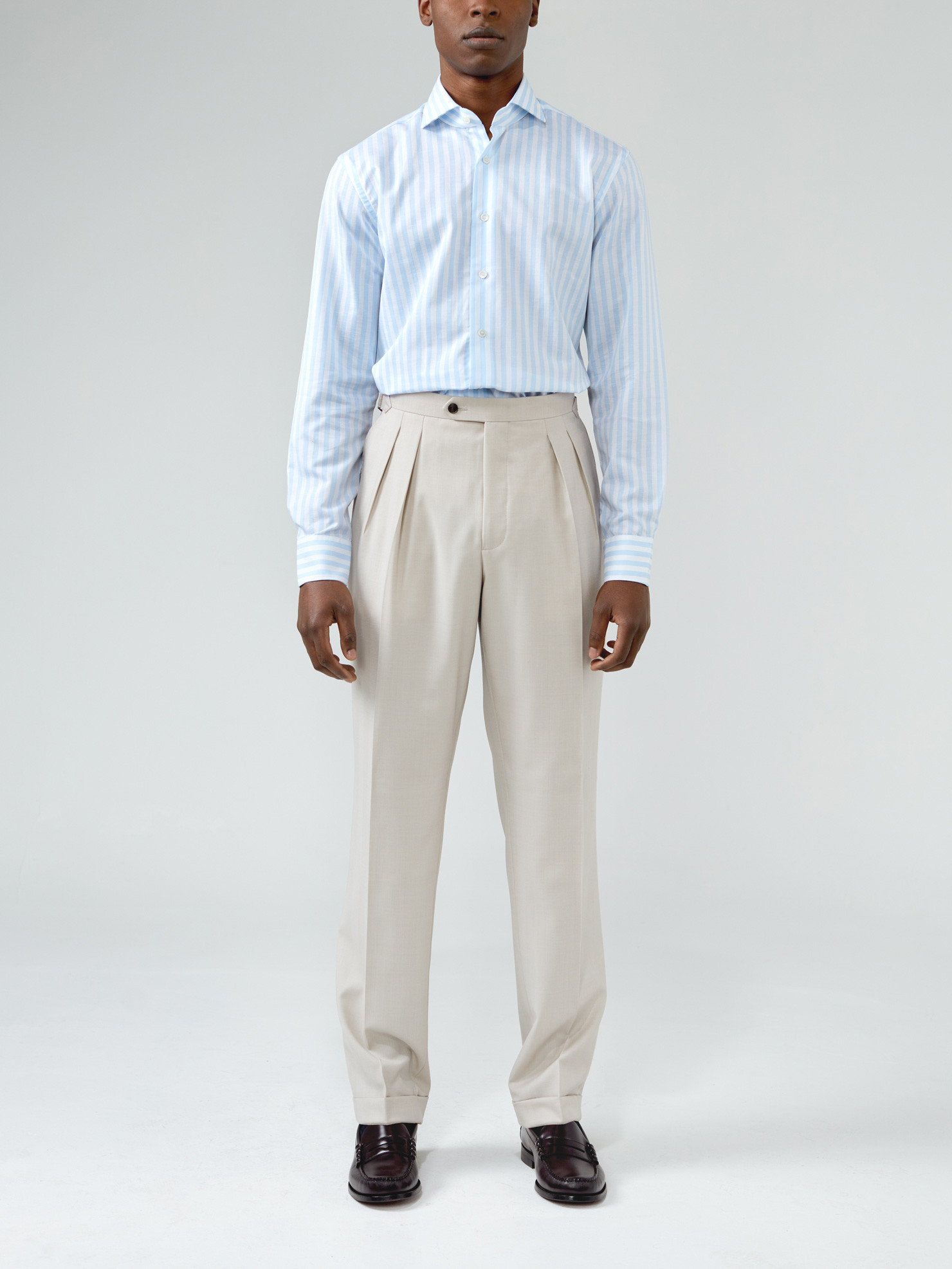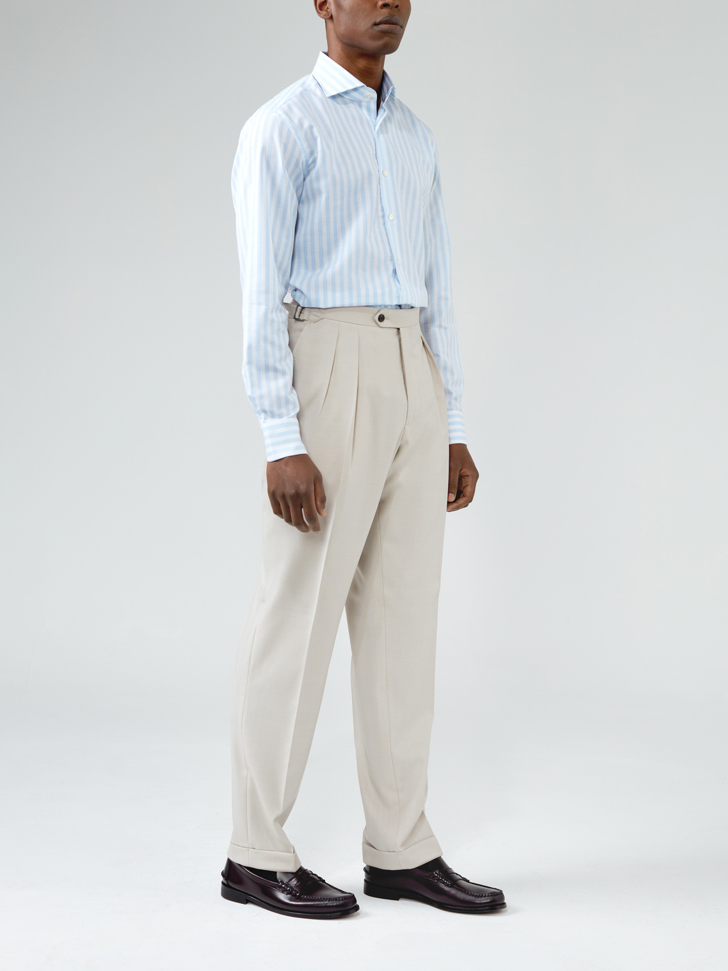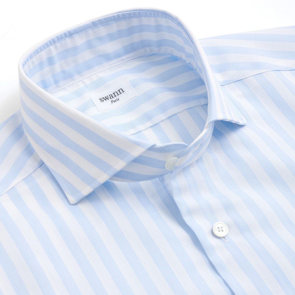 Thomas Mason cotton and linen poplin, two ply blue stripes. The ideal fabric for summer: a high proportion of cotton for a nice fit and a neat look, 29% linen for a cool shirt and very pleasant to wear in high heat.