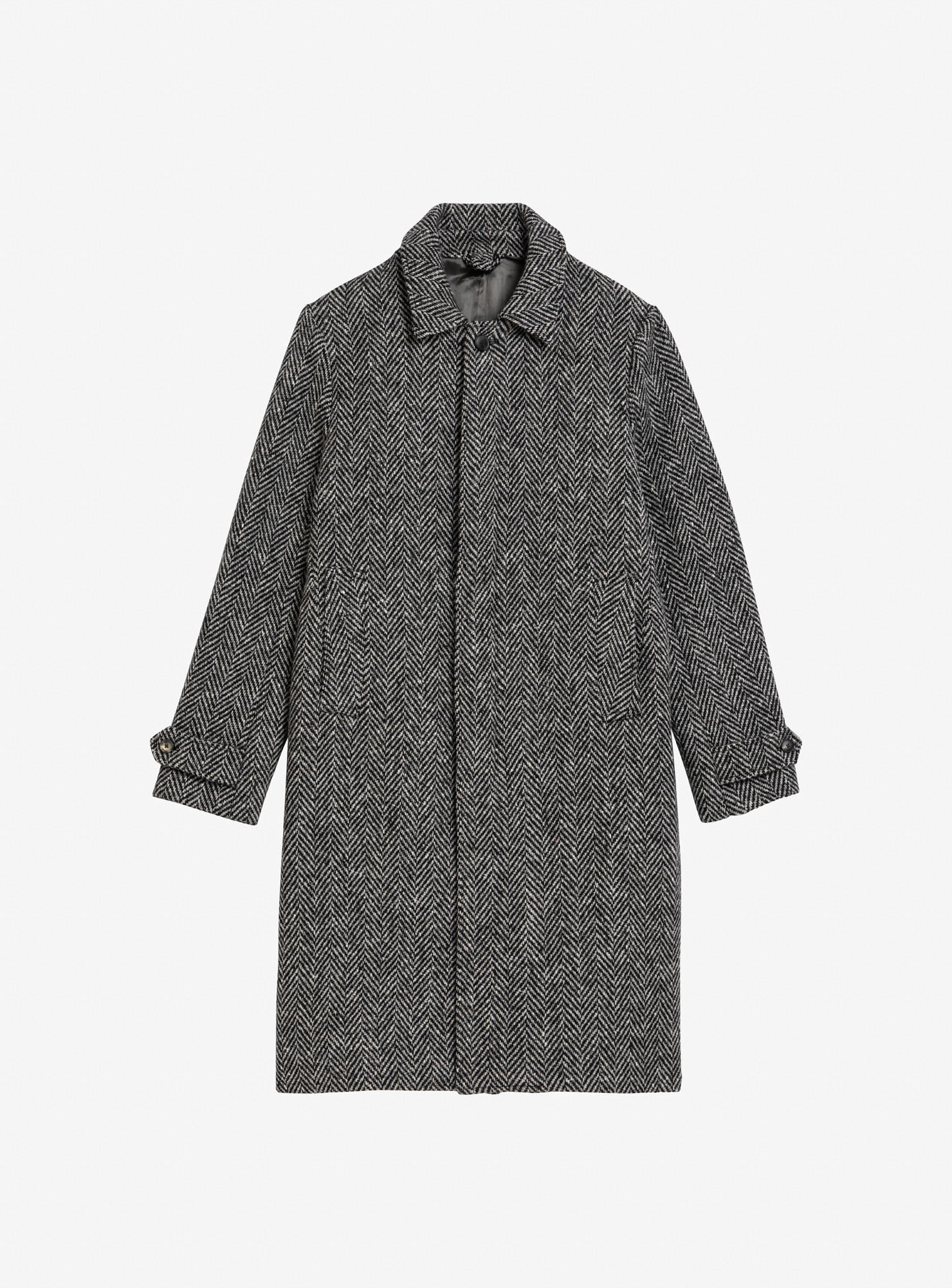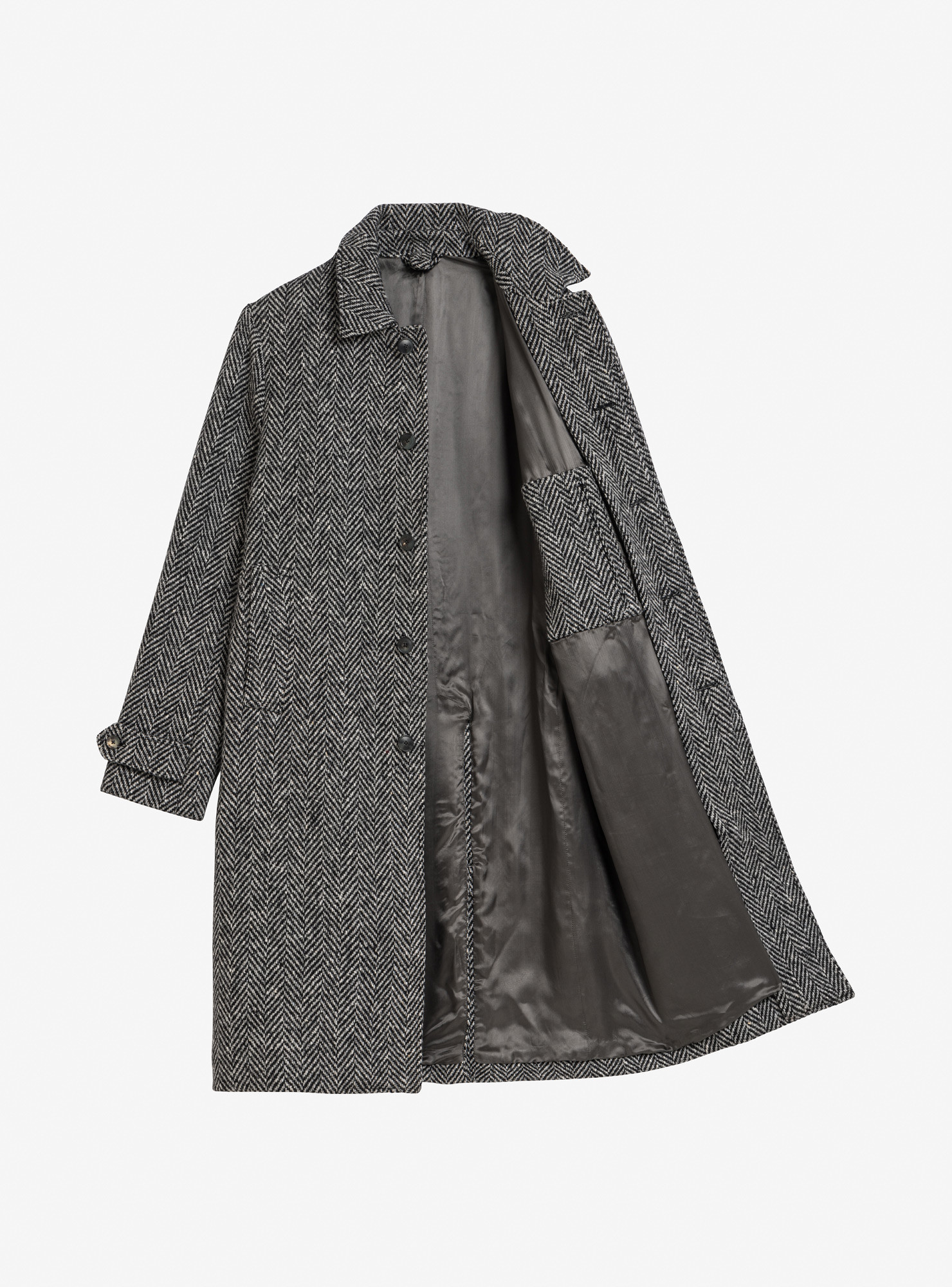 Car Coat in Grey Herringbone Tweed, must-have buttoning with 5 concealed buttons, traditional construction, unconstructed shoulders, two slanted side pockets, 1 back vent, full inner lining and buttoned sleeve tabs.