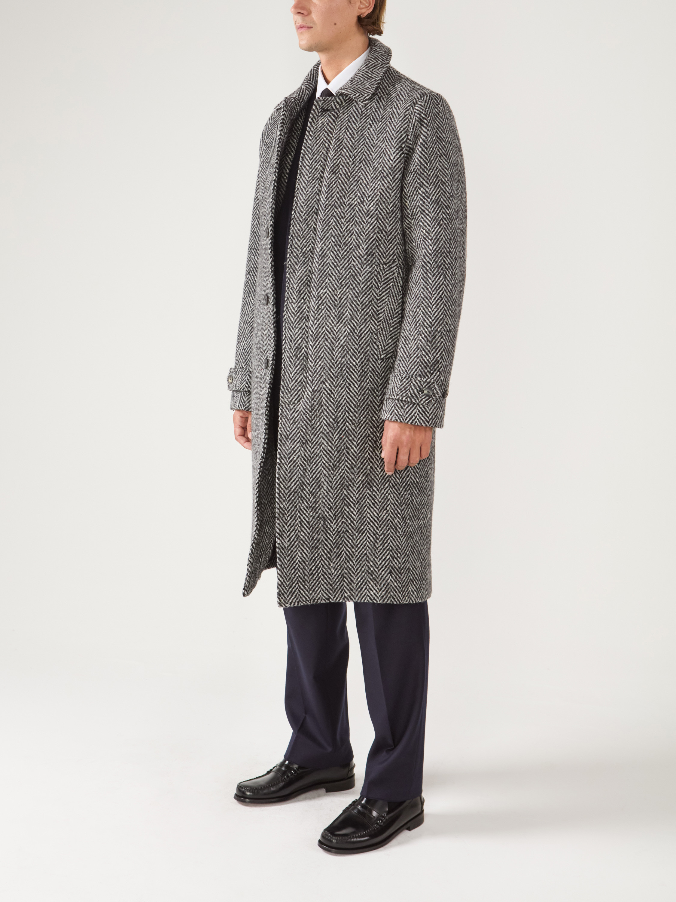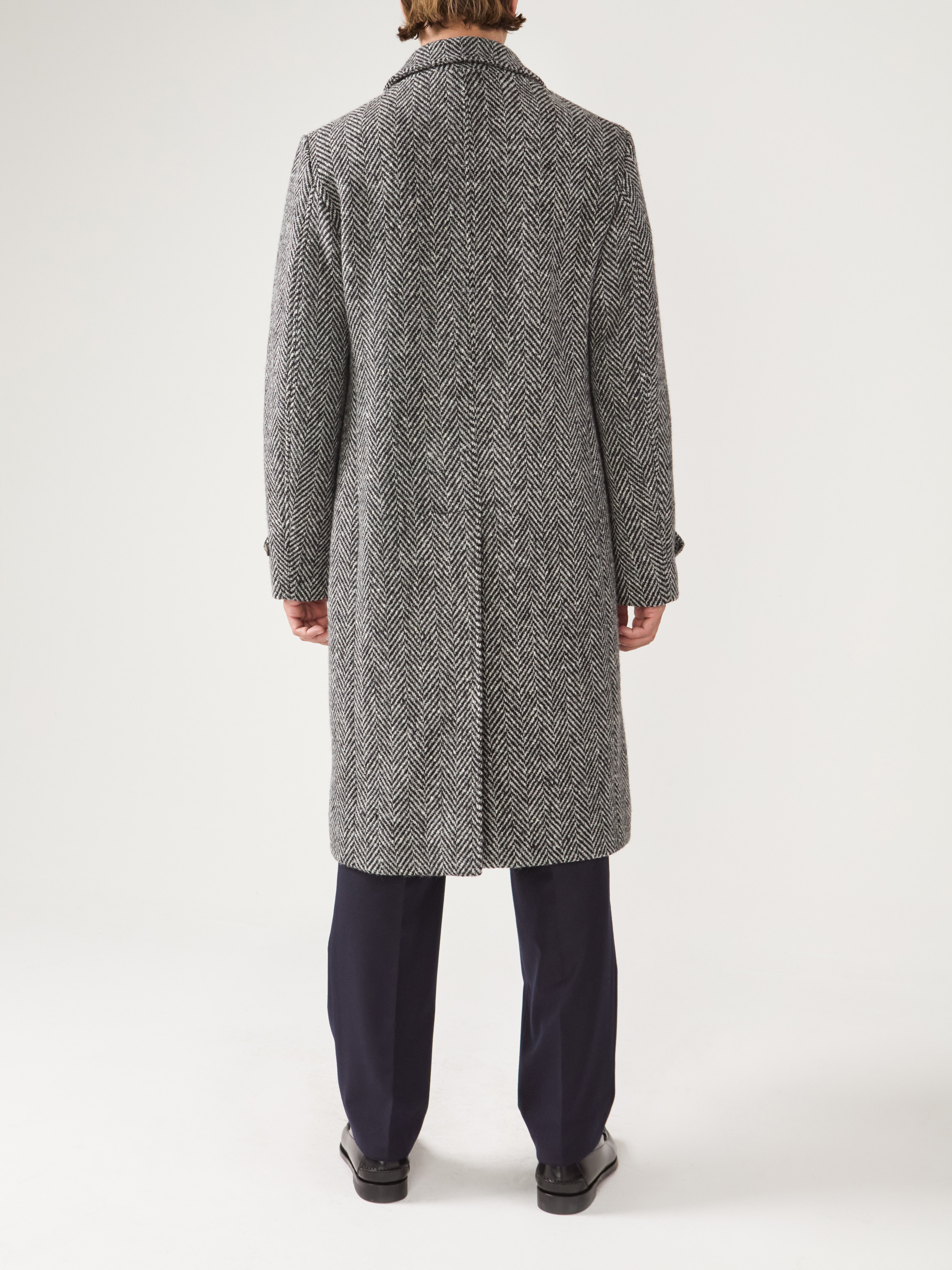 The coat in our winter collection is a car coat in gray Herringbone Donegal fabric. This warm, hard-wearing fabric is the fruit of a century-old Irish tradition, recognizable by its Herringbone pattern dotted with colored dots.