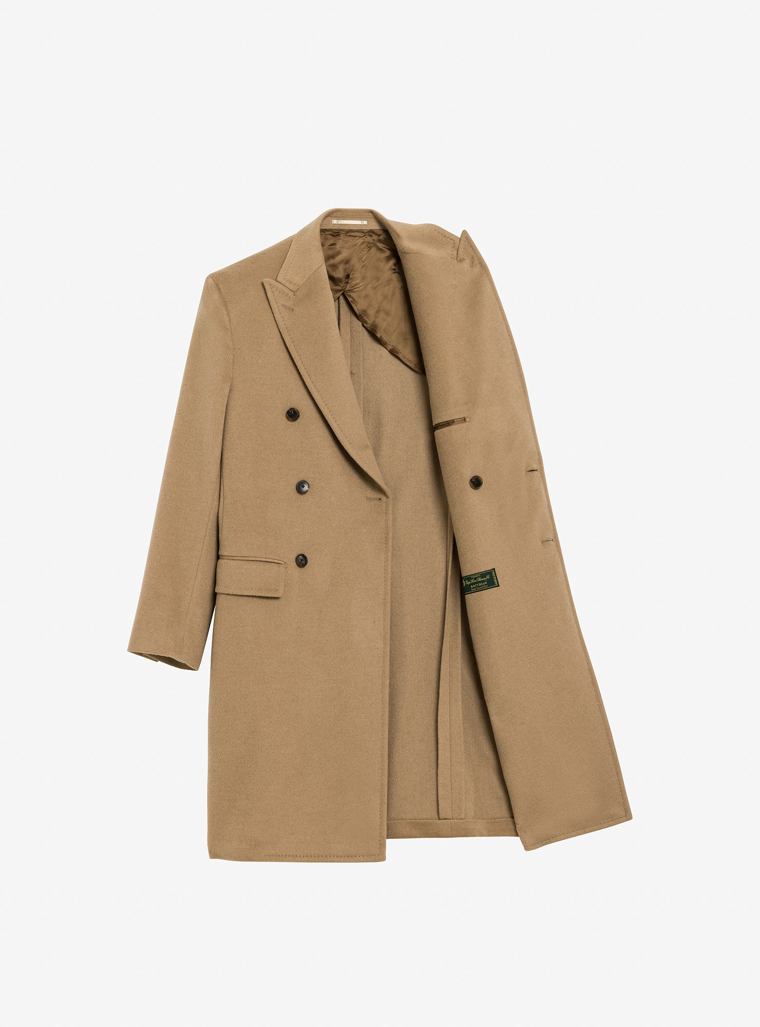 Wool coat, 6-button double breasted, unconstructed assembly, shoulders with unconstructed shoulders, two side pockets with flaps, one classic breast pocket, one back slit, full inner lining.