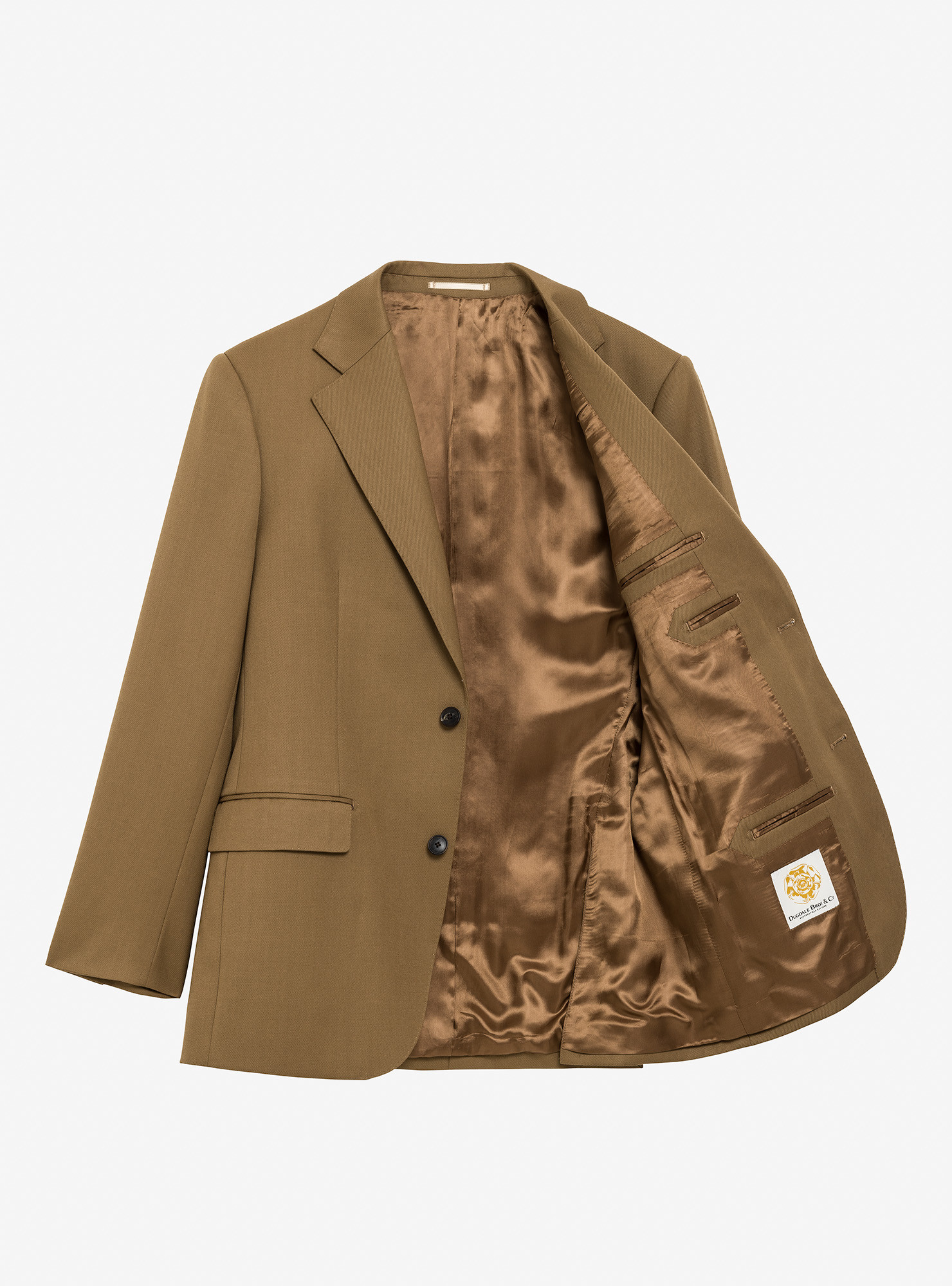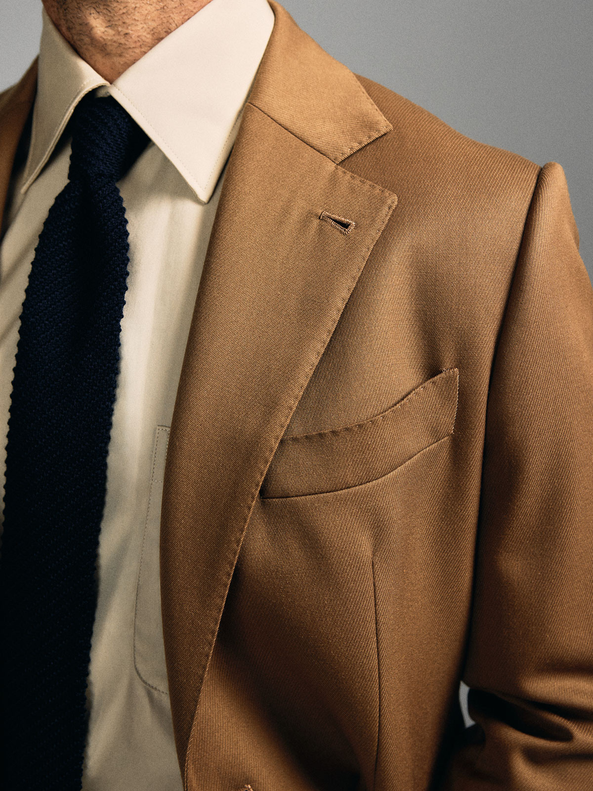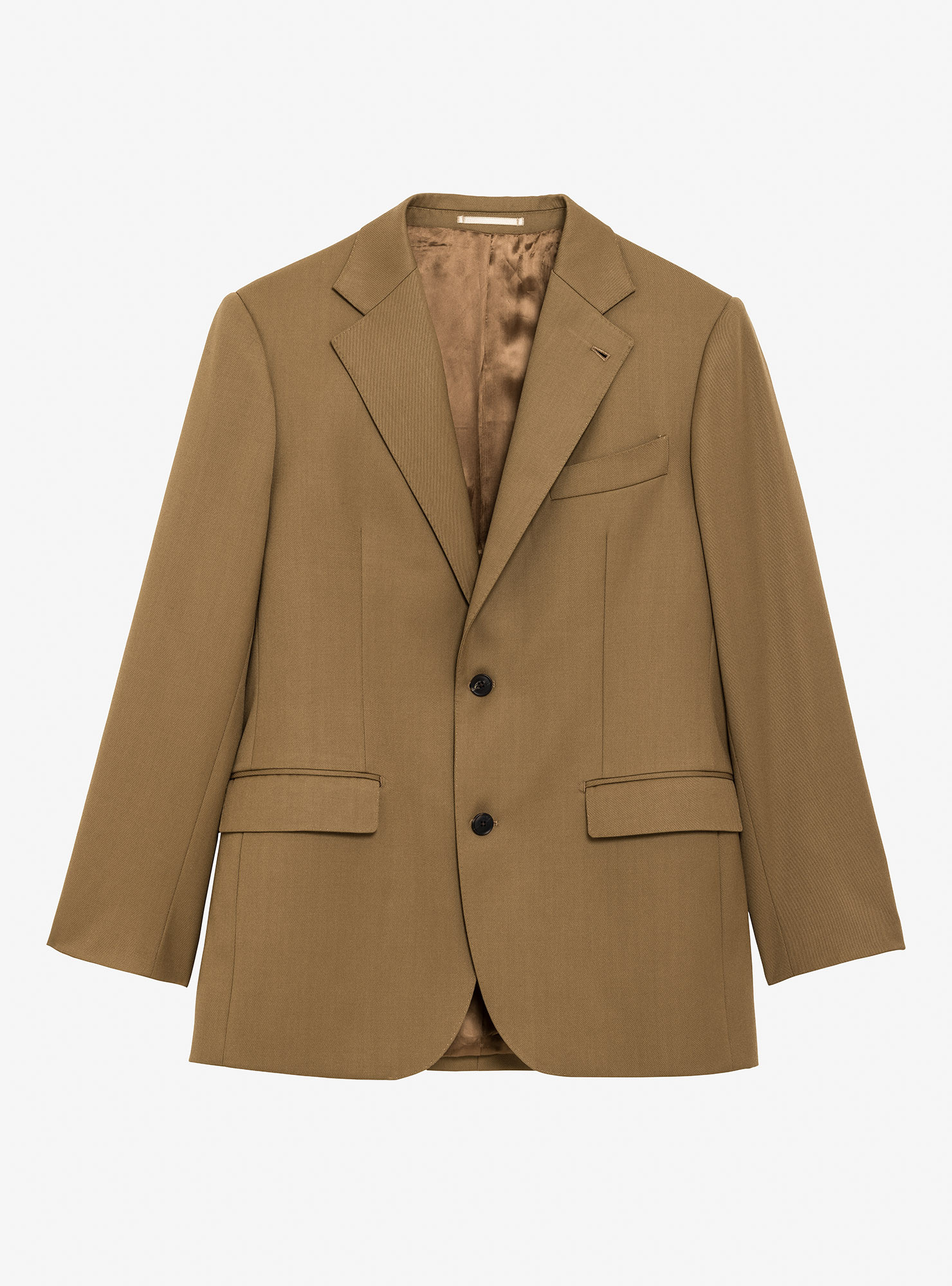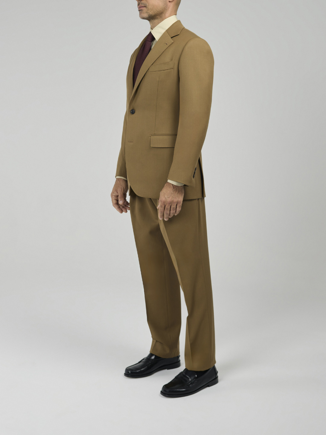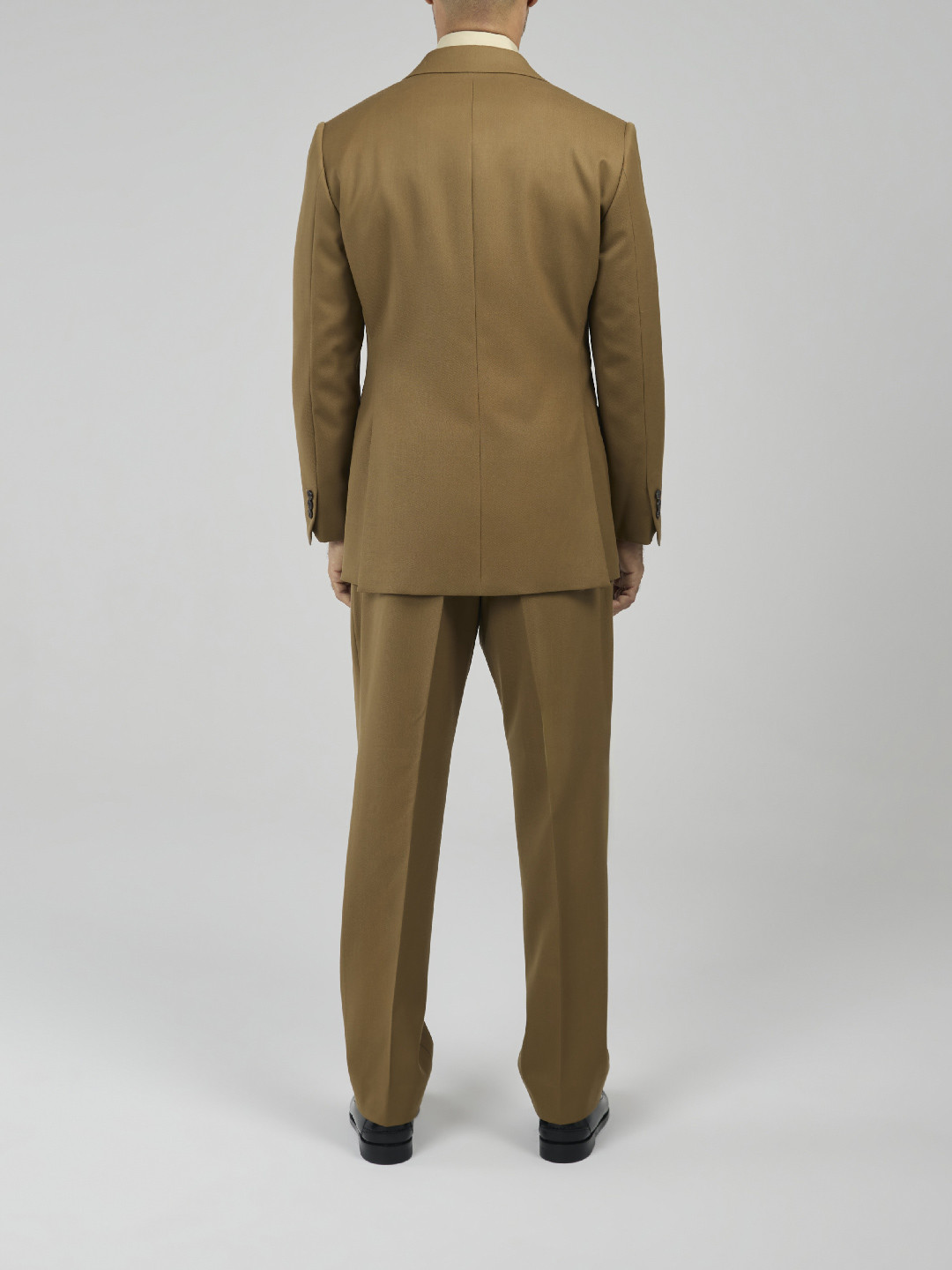 Single-Breasted 2-Button Beige Cavalry Twill Suit. Traditional construction with structured shoulders and shoulder pads, straight-flap side pockets, double rear vents, and a fully lined interior. Trousers with side adjusters, two inward pleats, plain hem without turn-ups.
