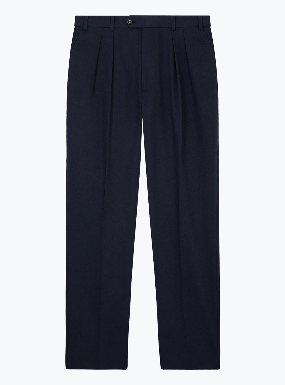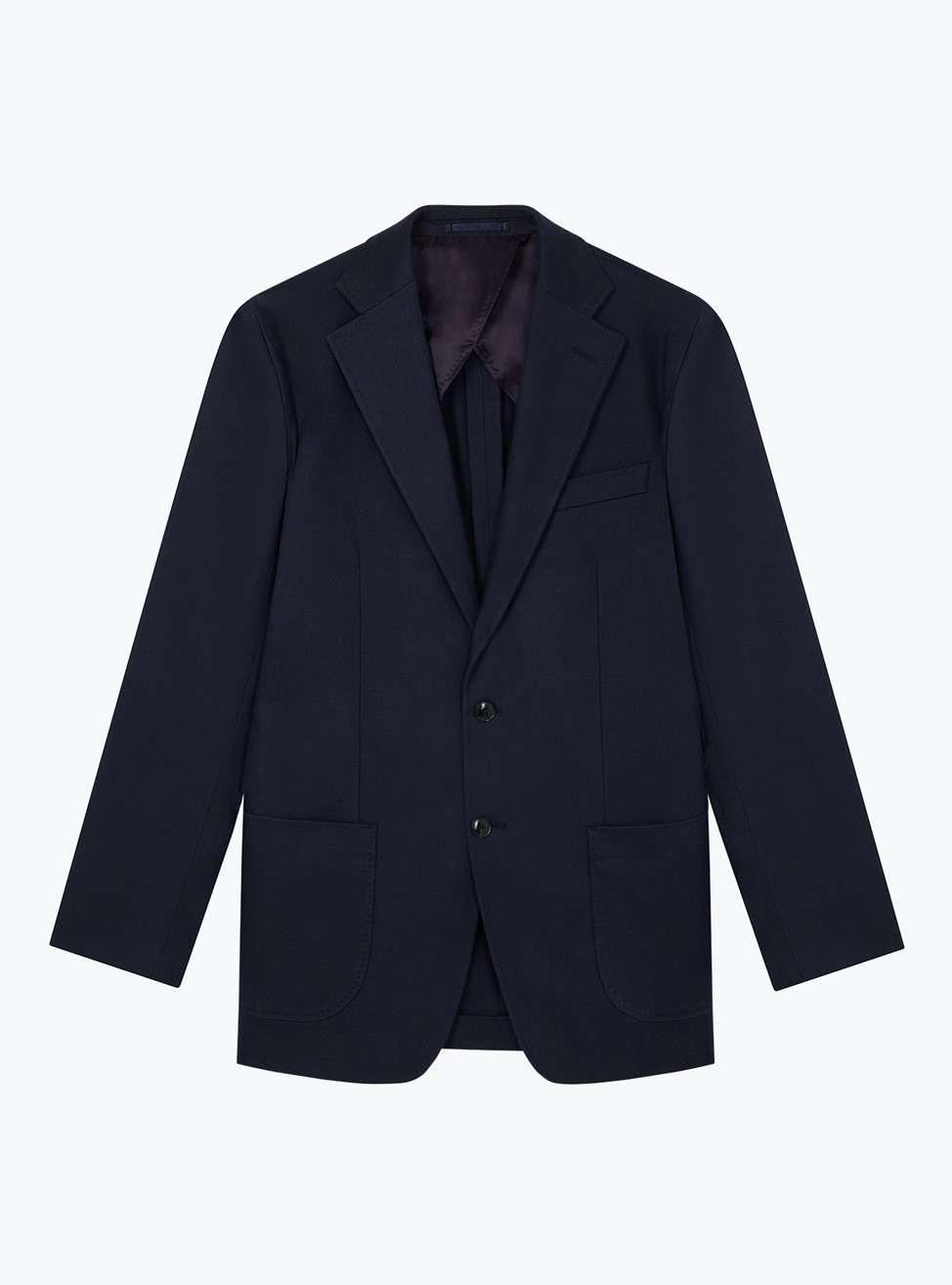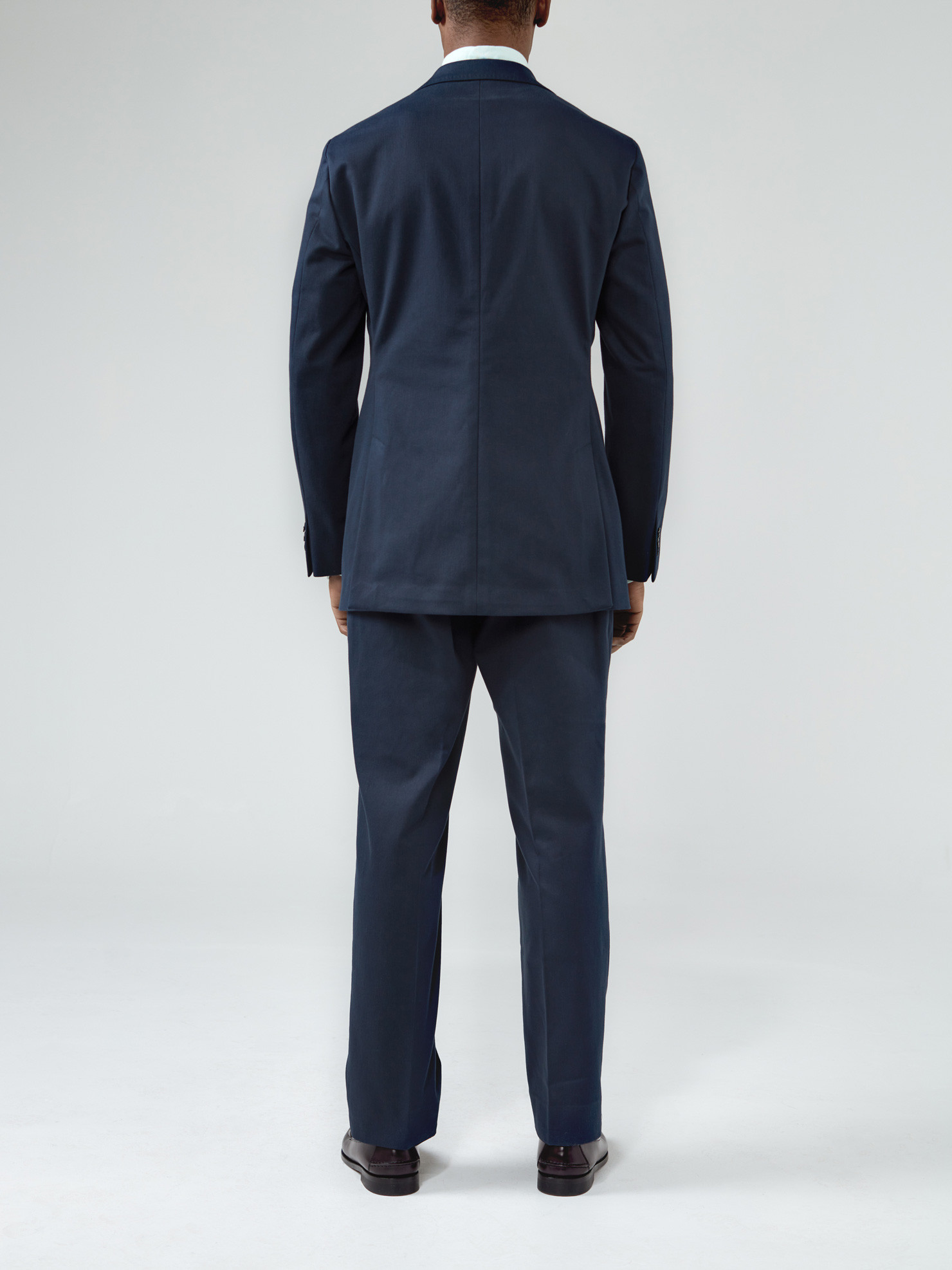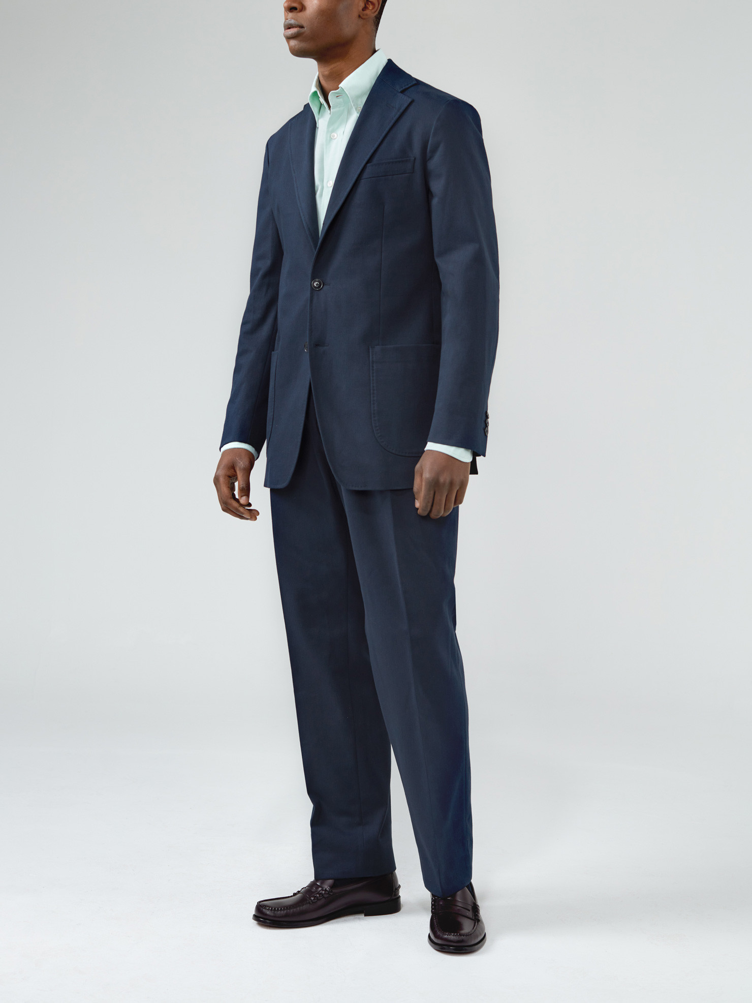 Navy Cotton Suit - Unconstructed jacket, classic notch lapel, 2.5 button closure, classic chest pocket, patch side pockets, AMF topstitching, unconstructed shoulders - Belt loops pants, double inside pleats, slanted side pockets, single right back pocket, plain hem.