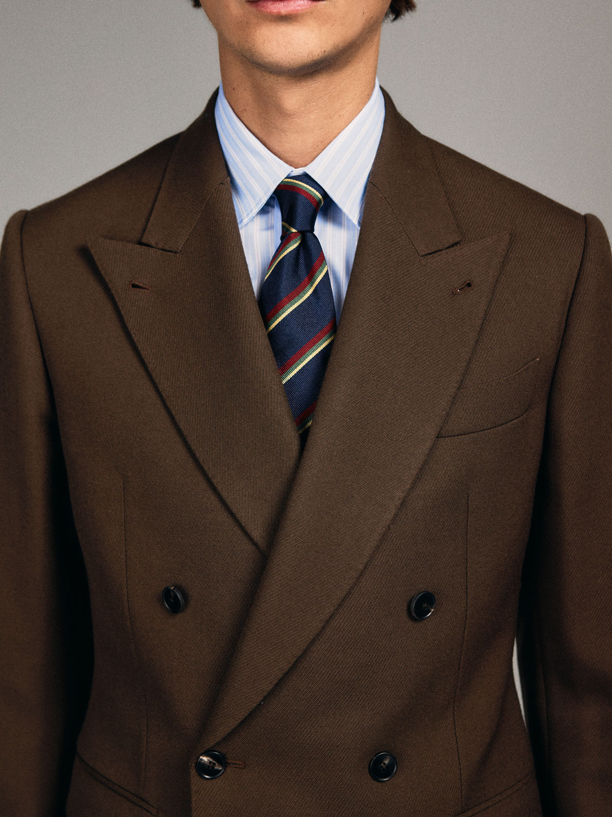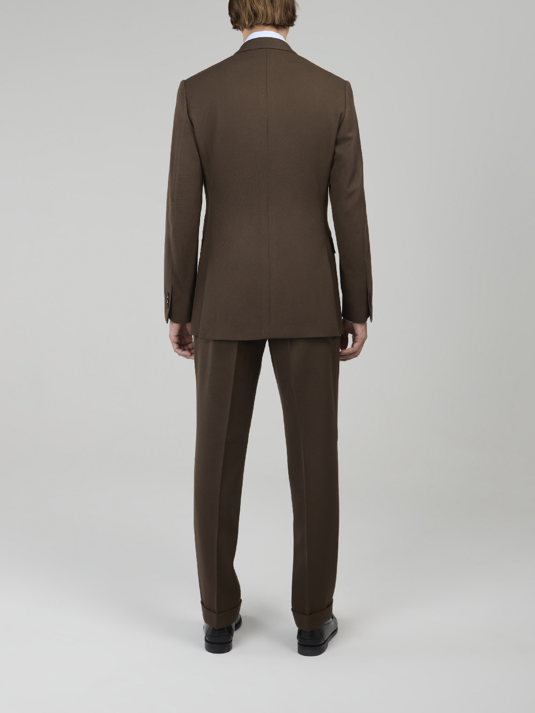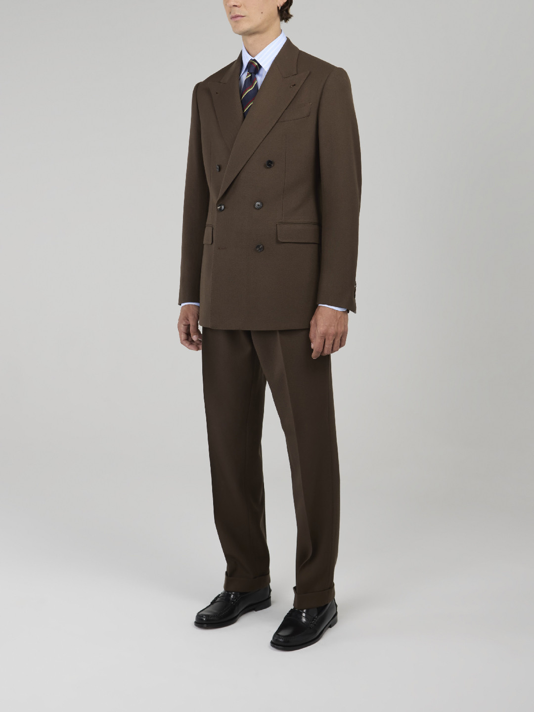 Double-Breasted 6-Button Brown Cavalry Twill Suit. Traditional construction with structured shoulders and formed shoulder pads, straight-flap side pockets, double rear vents, and a fully lined interior. Trousers with belt loops, two inward pleats, and 4 cm turn-ups.