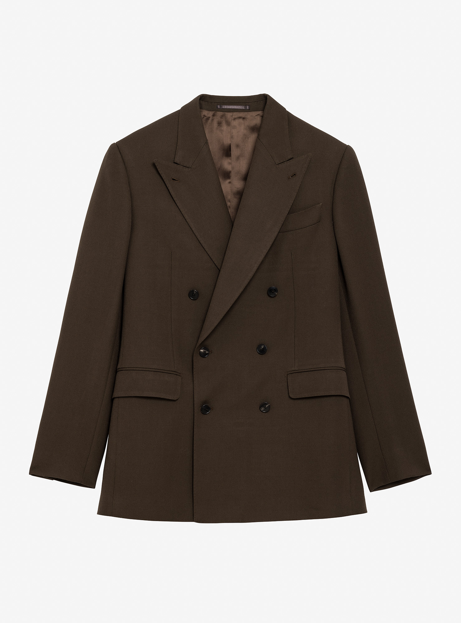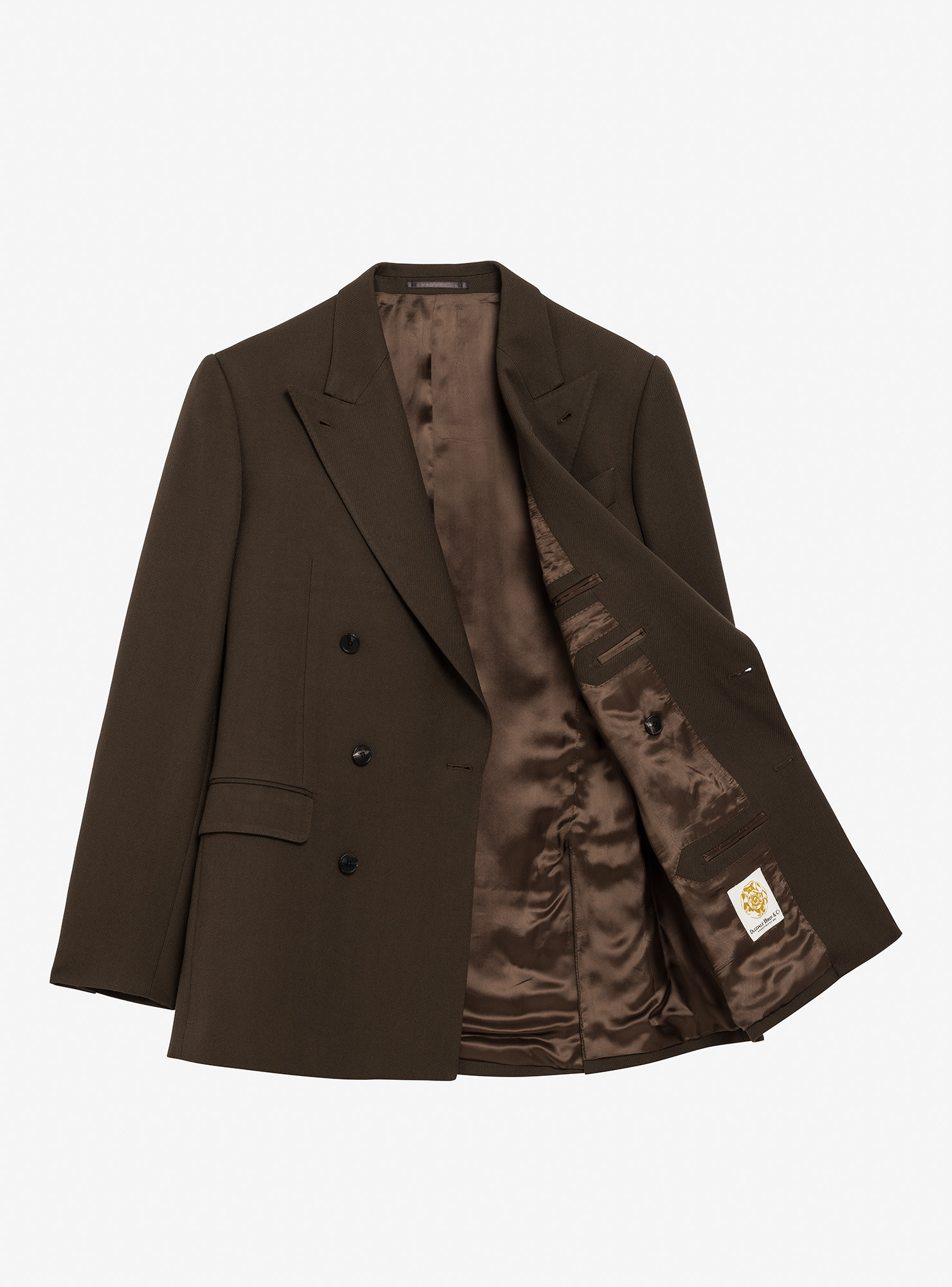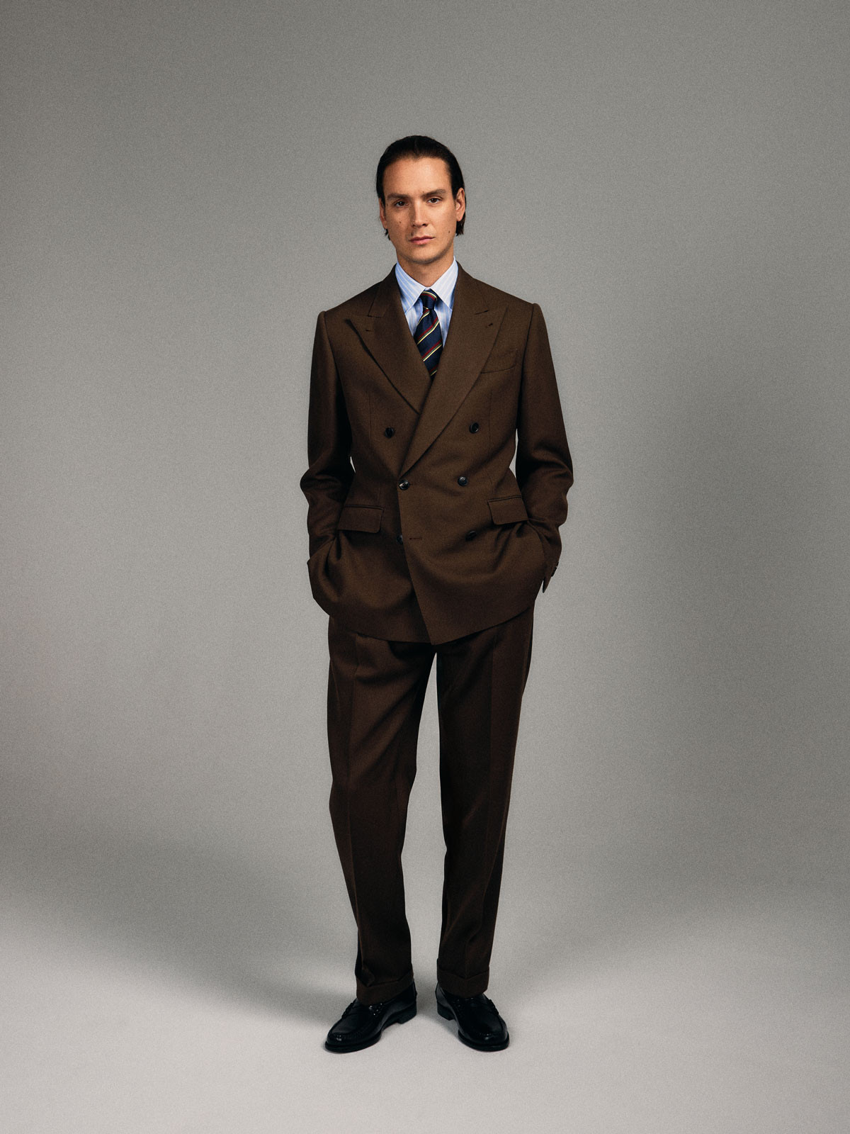 Double-Breasted 6-Button Brown Cavalry Twill Suit. Traditional construction with structured shoulders and formed shoulder pads, straight-flap side pockets, double rear vents, and a fully lined interior. Trousers with belt loops, two inward pleats, and 4 cm turn-ups.