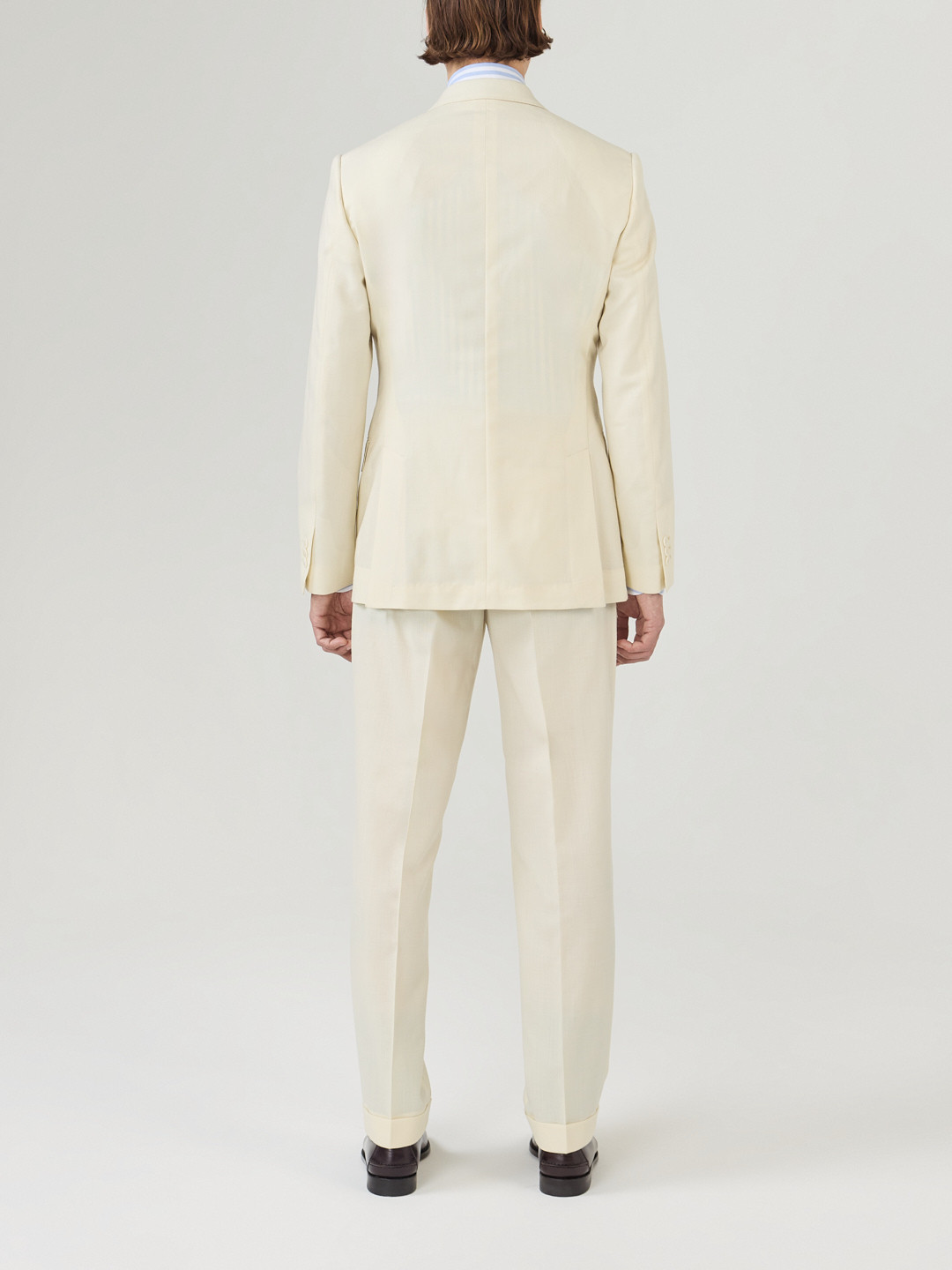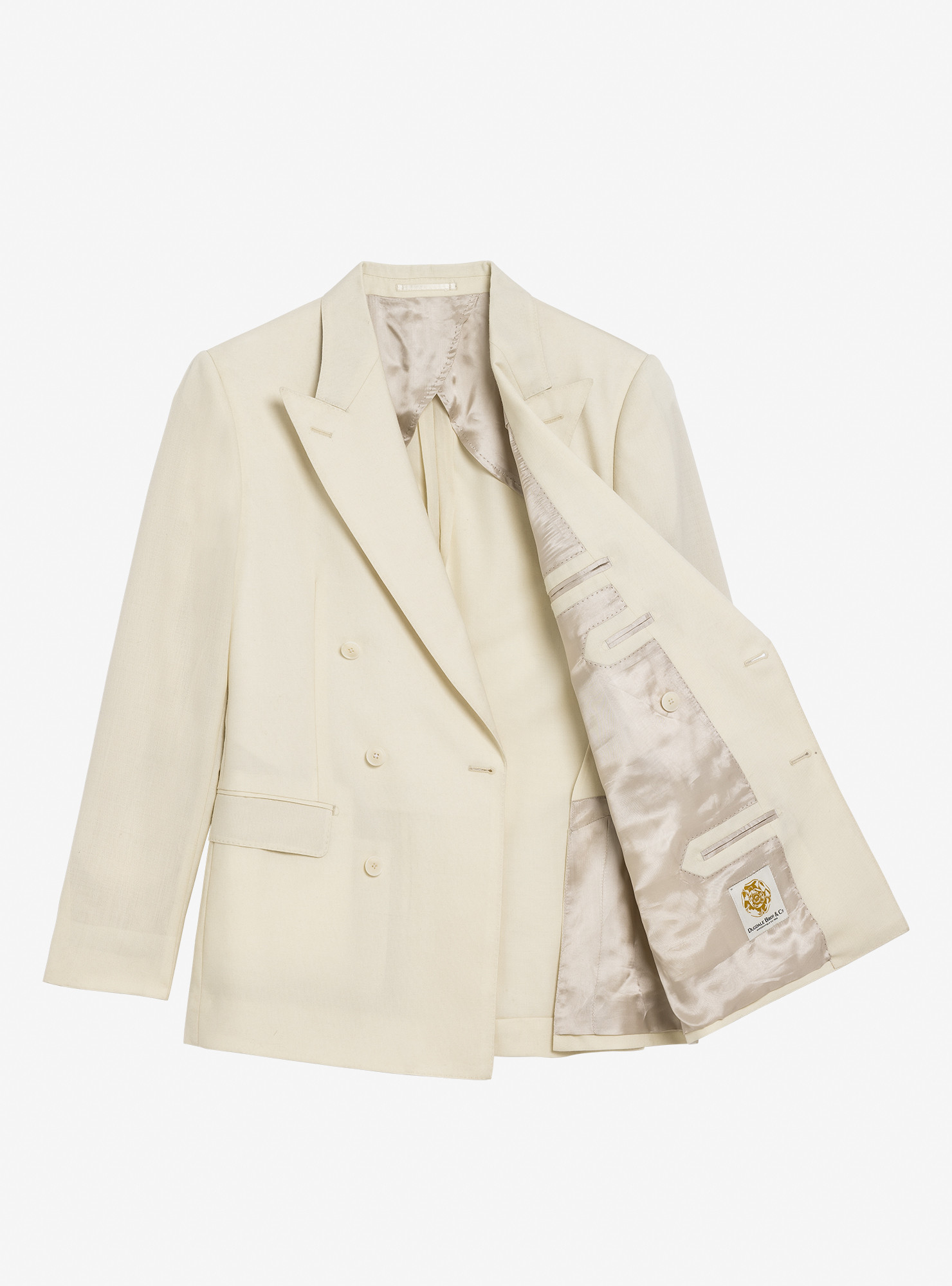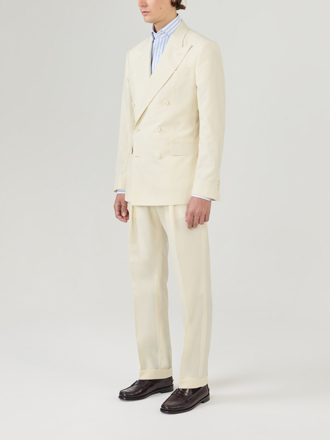6-button double-breasted suit in cream wool. Traditional construction, structured shoulders, straight flap side pockets, 2 side vents on back, half lined inside. Pants with belt loops, double inside pleats, 4cm turn-up.
