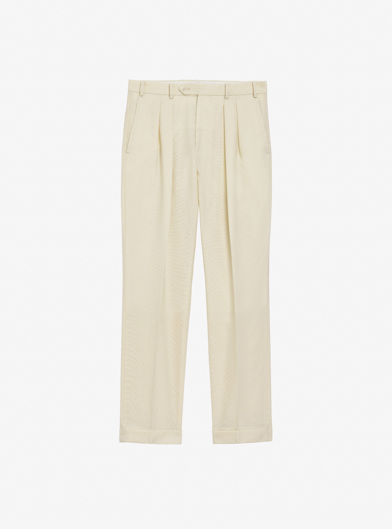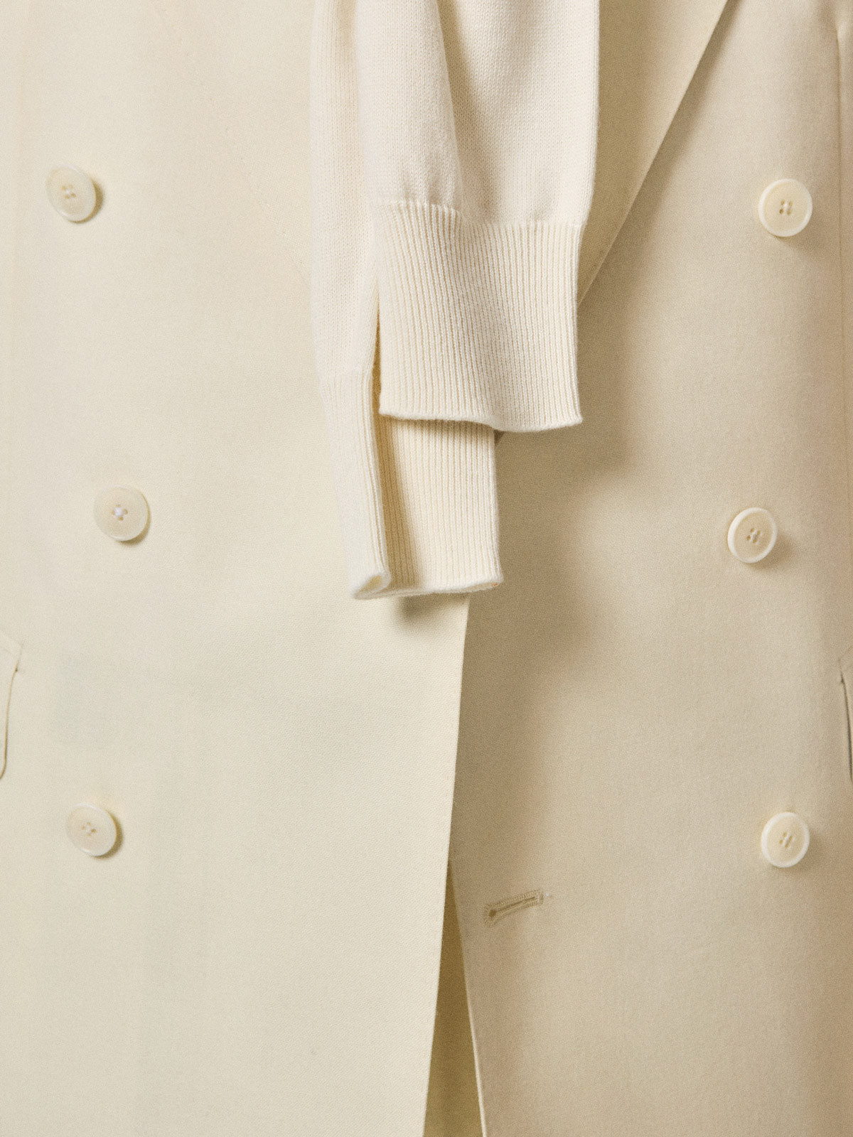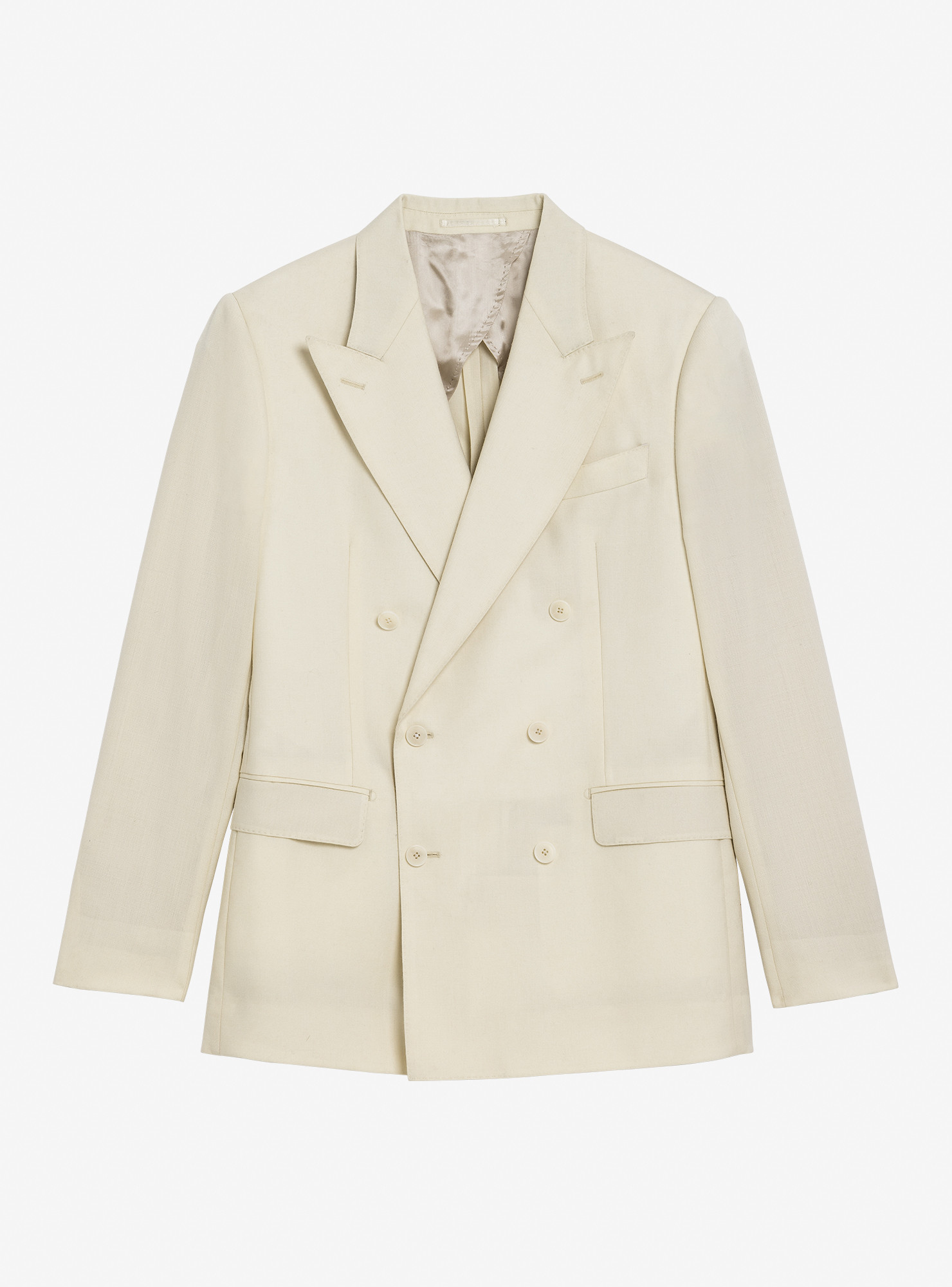 6-button double-breasted suit in cream wool. Traditional construction, structured shoulders, straight flap side pockets, 2 side vents on back, half lined inside. Pants with belt loops, double inside pleats, 4cm turn-up.