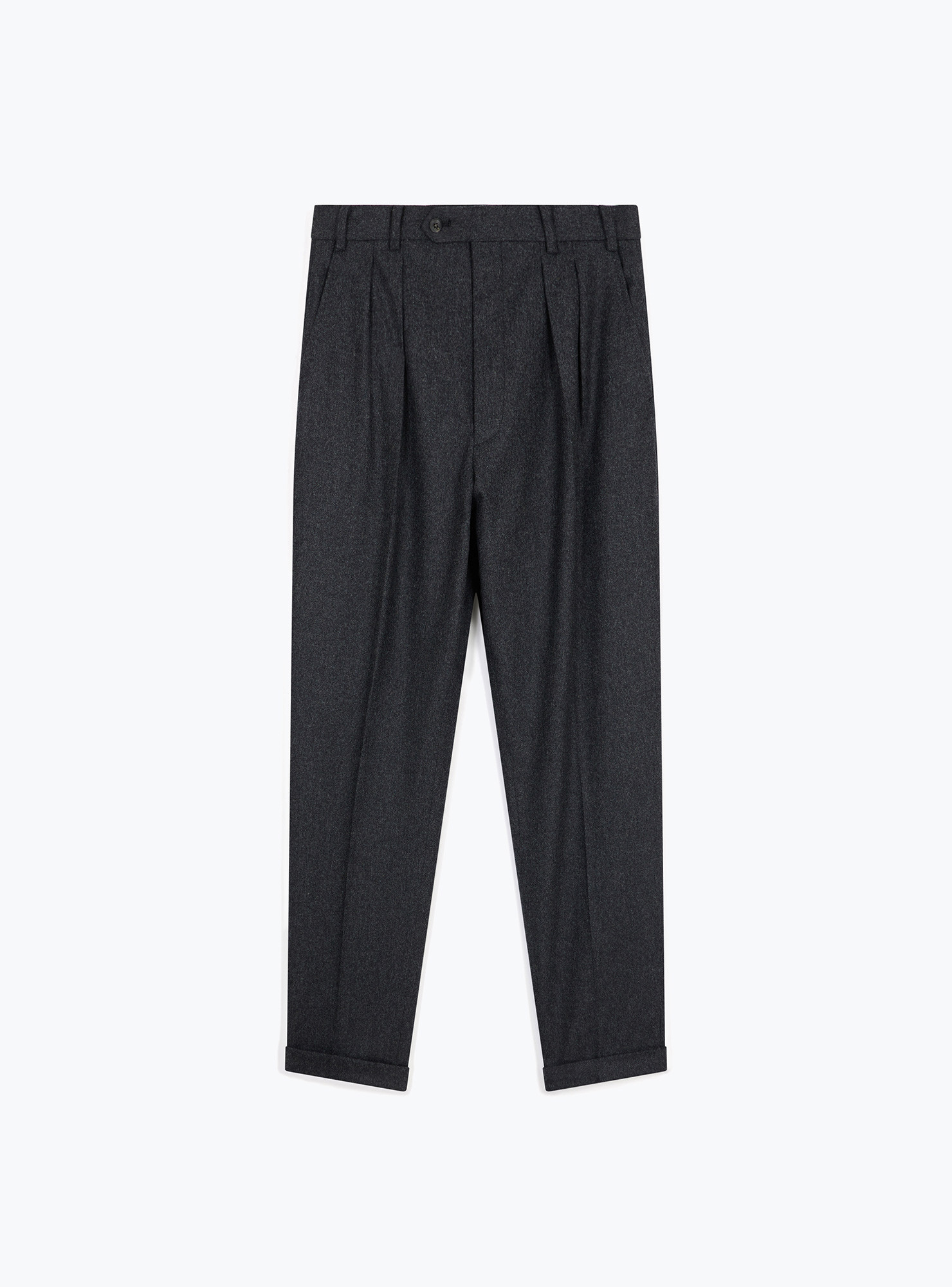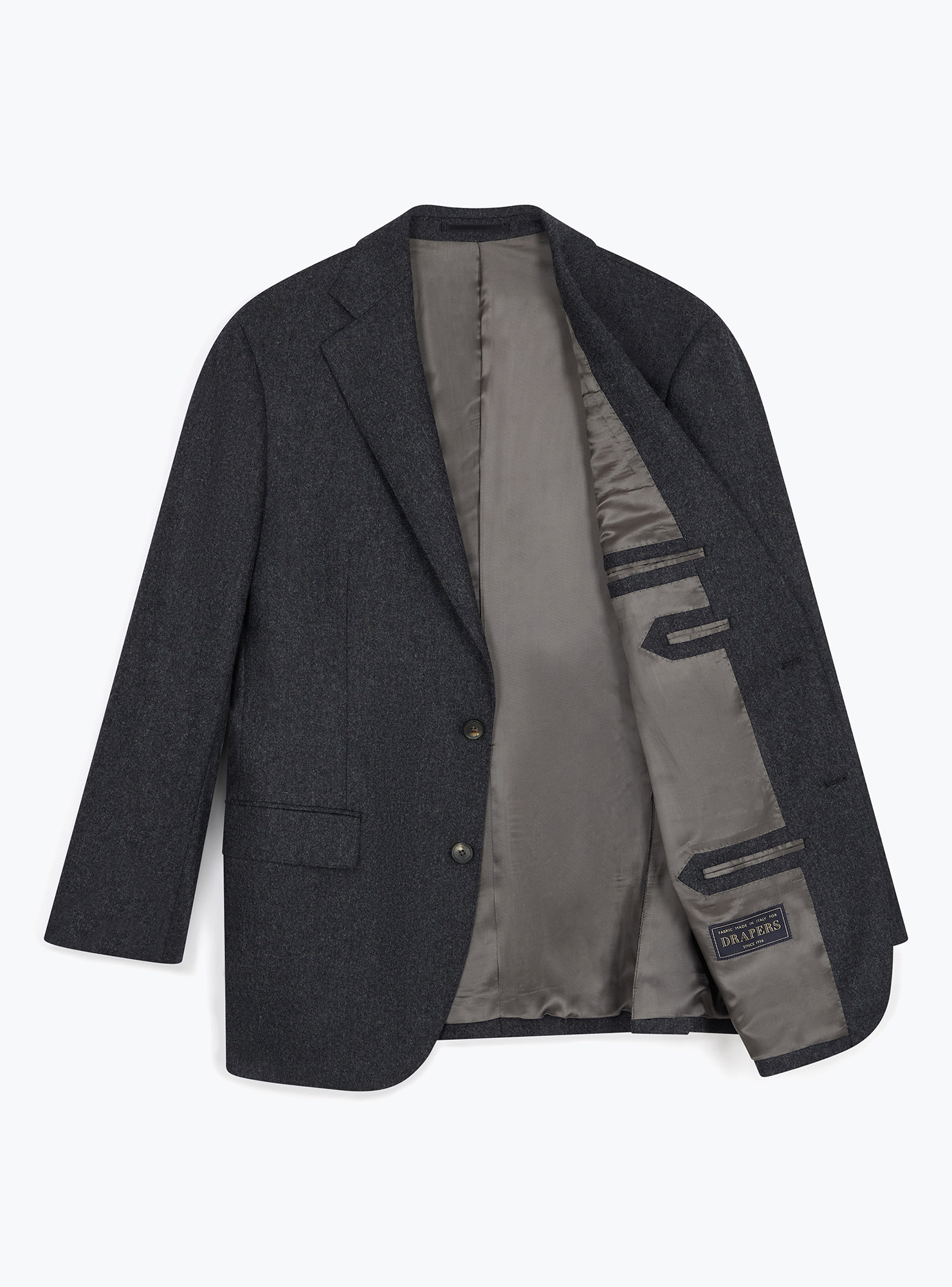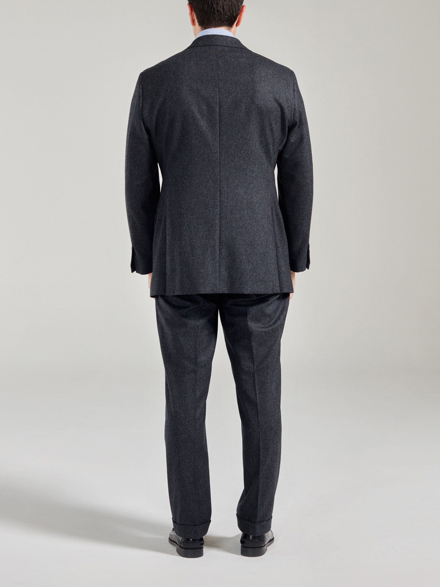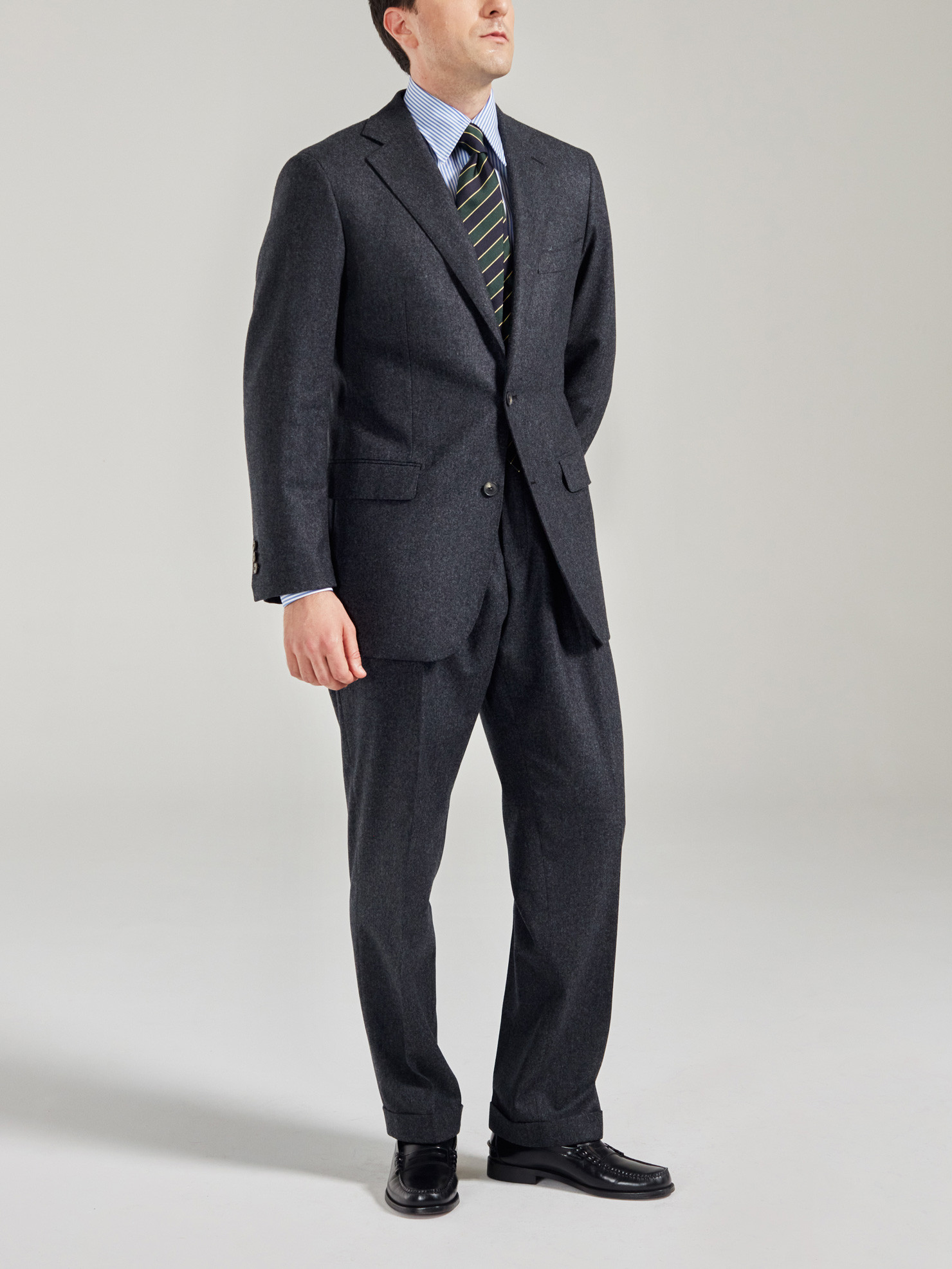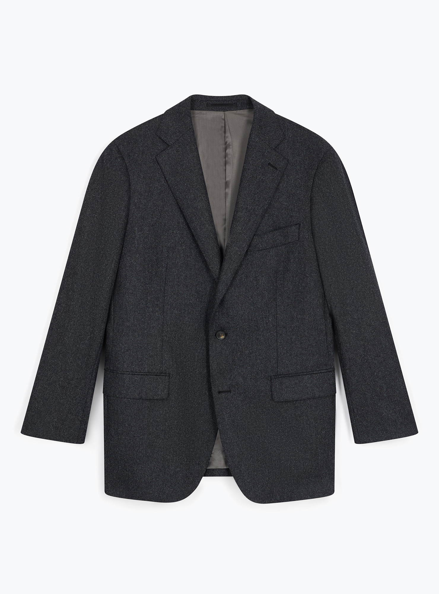 Charcoal gray 2-button straight suit in Drapers wool flannel. Traditional fit, shoulders with soft epaulets, side pockets with straight flaps, 2 back slits, full inner lining. Pants with belt loops, 2 inside pleats, 4cm lower leg turn-up.