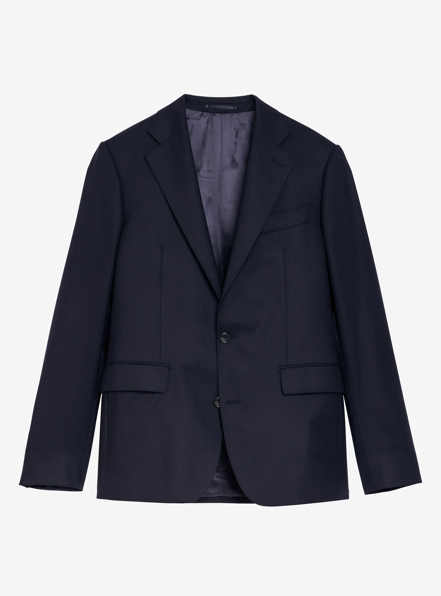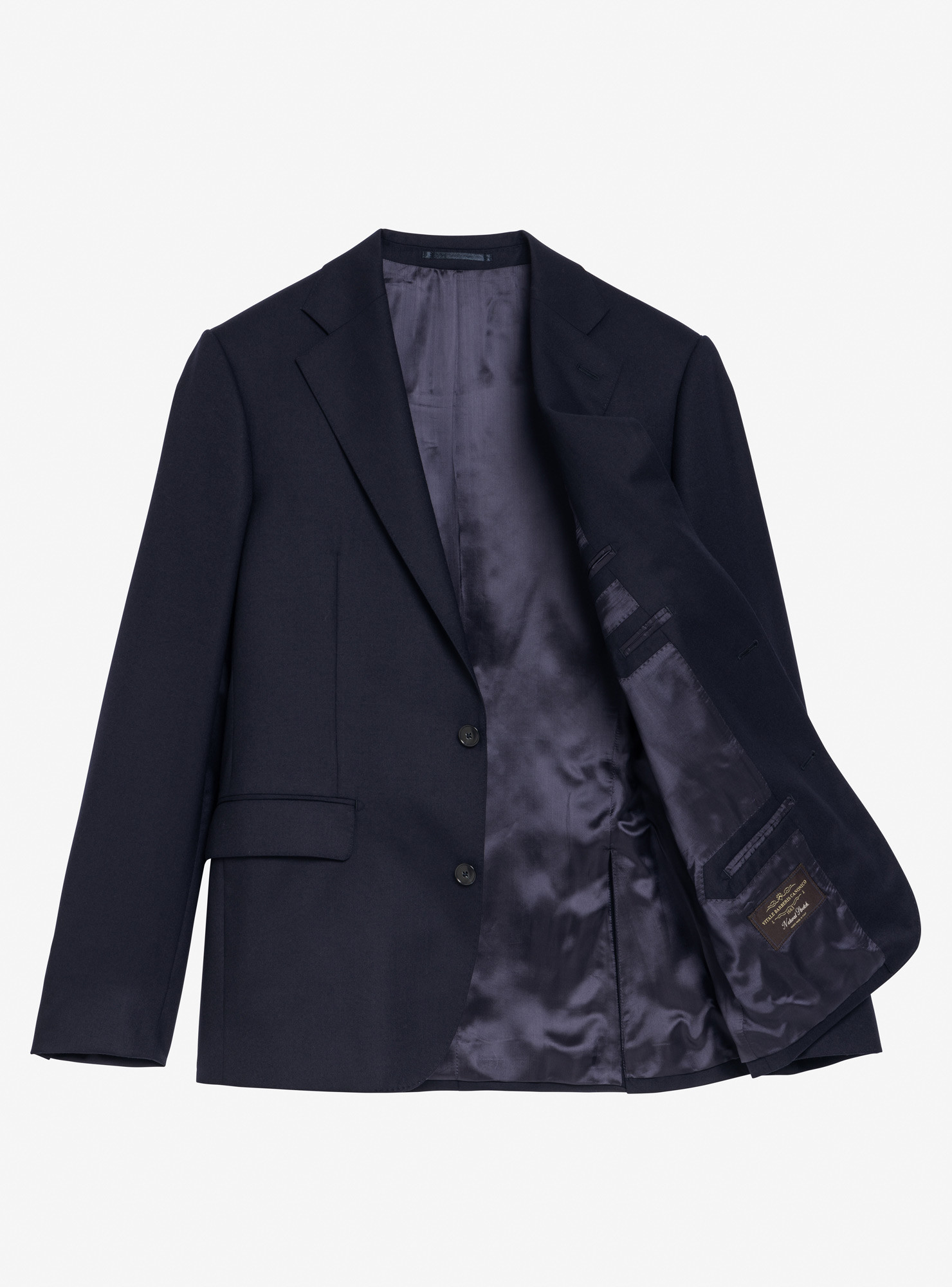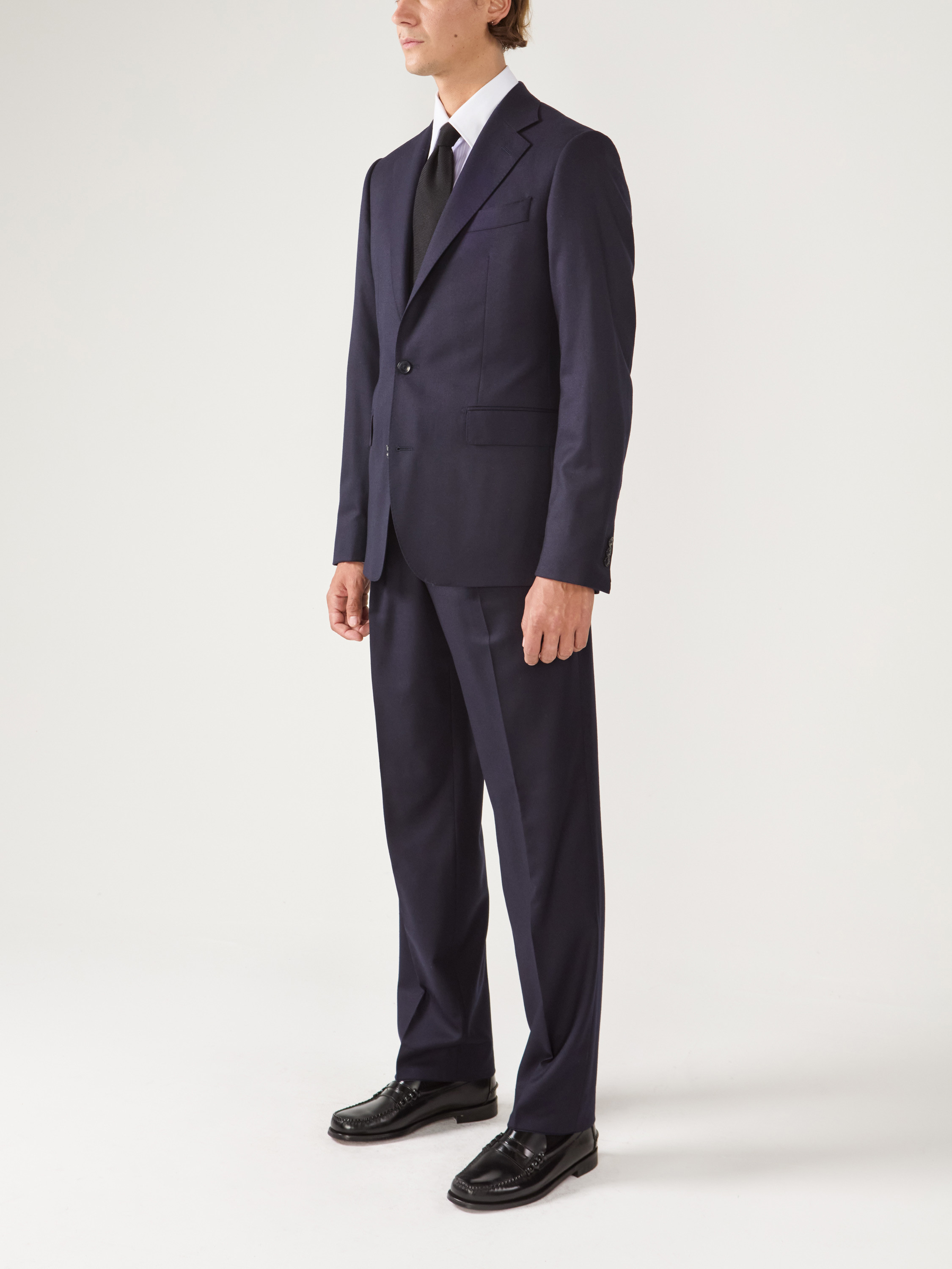 Navy 2-button straight suit in Flannel, traditional construction, shoulders with structured epaulettes, side pockets with straight flaps, 2 side vents on back, fully lined inside. Trousers with belt loops, 1 deep inside pleat, single hem without turn-up.
