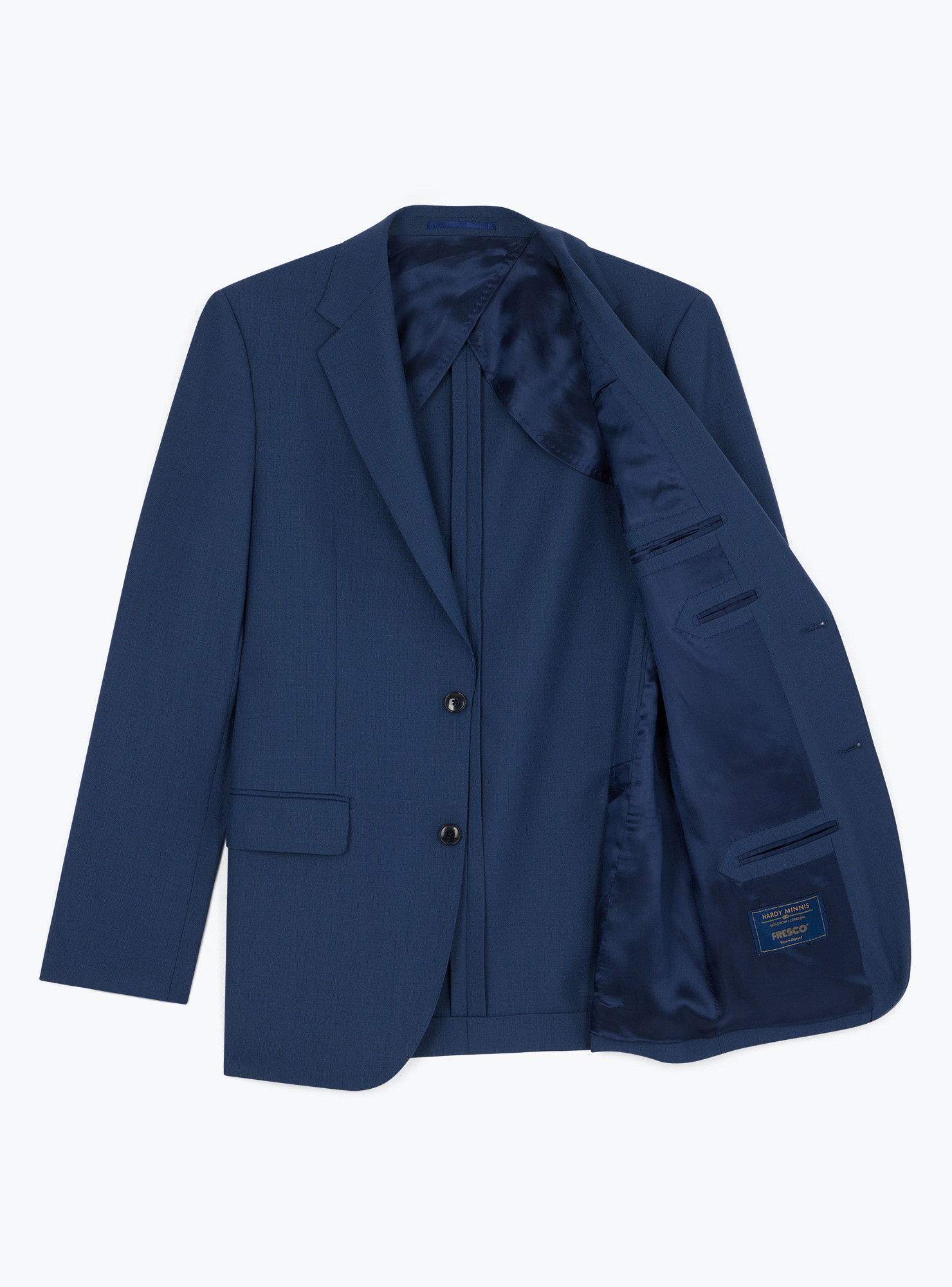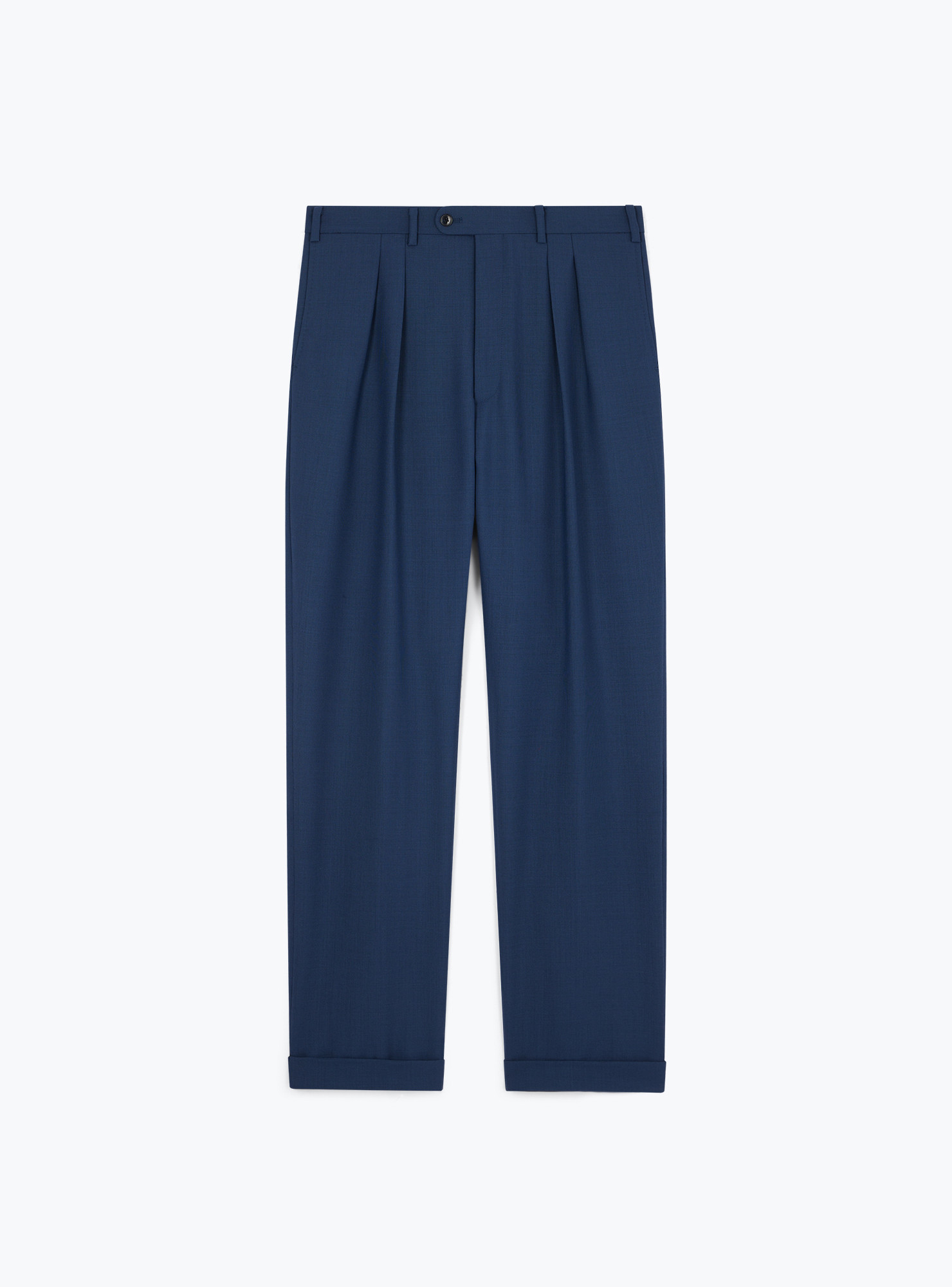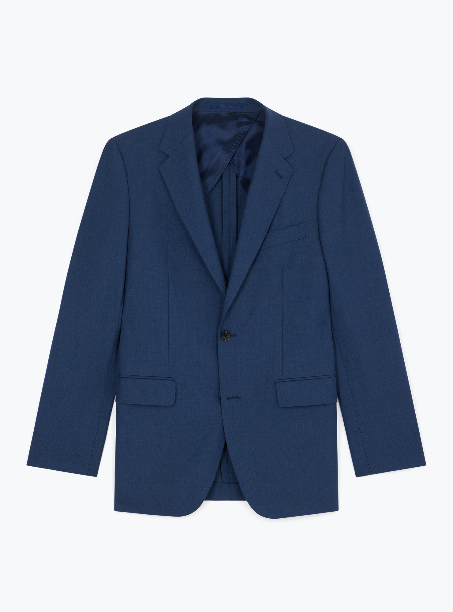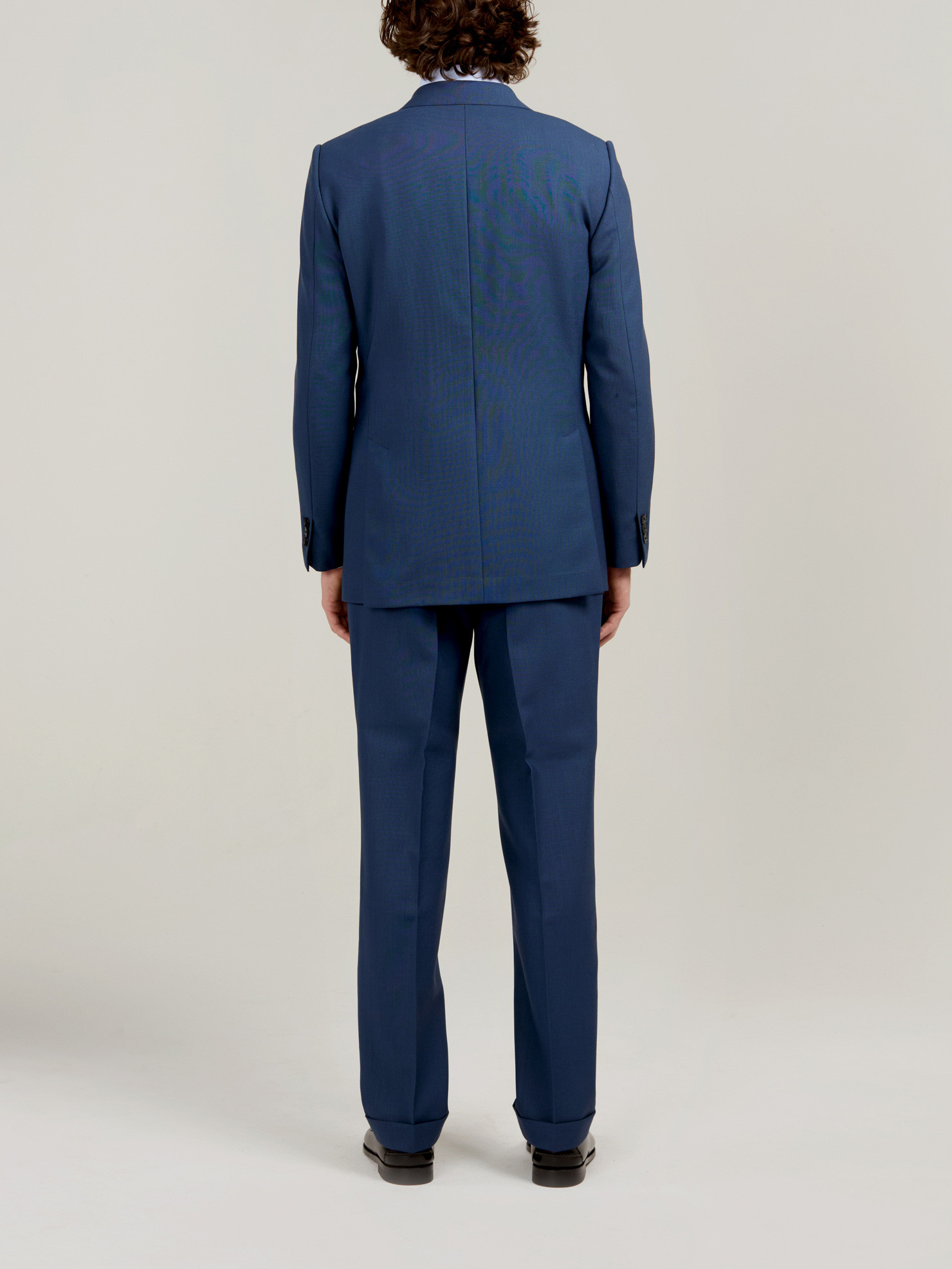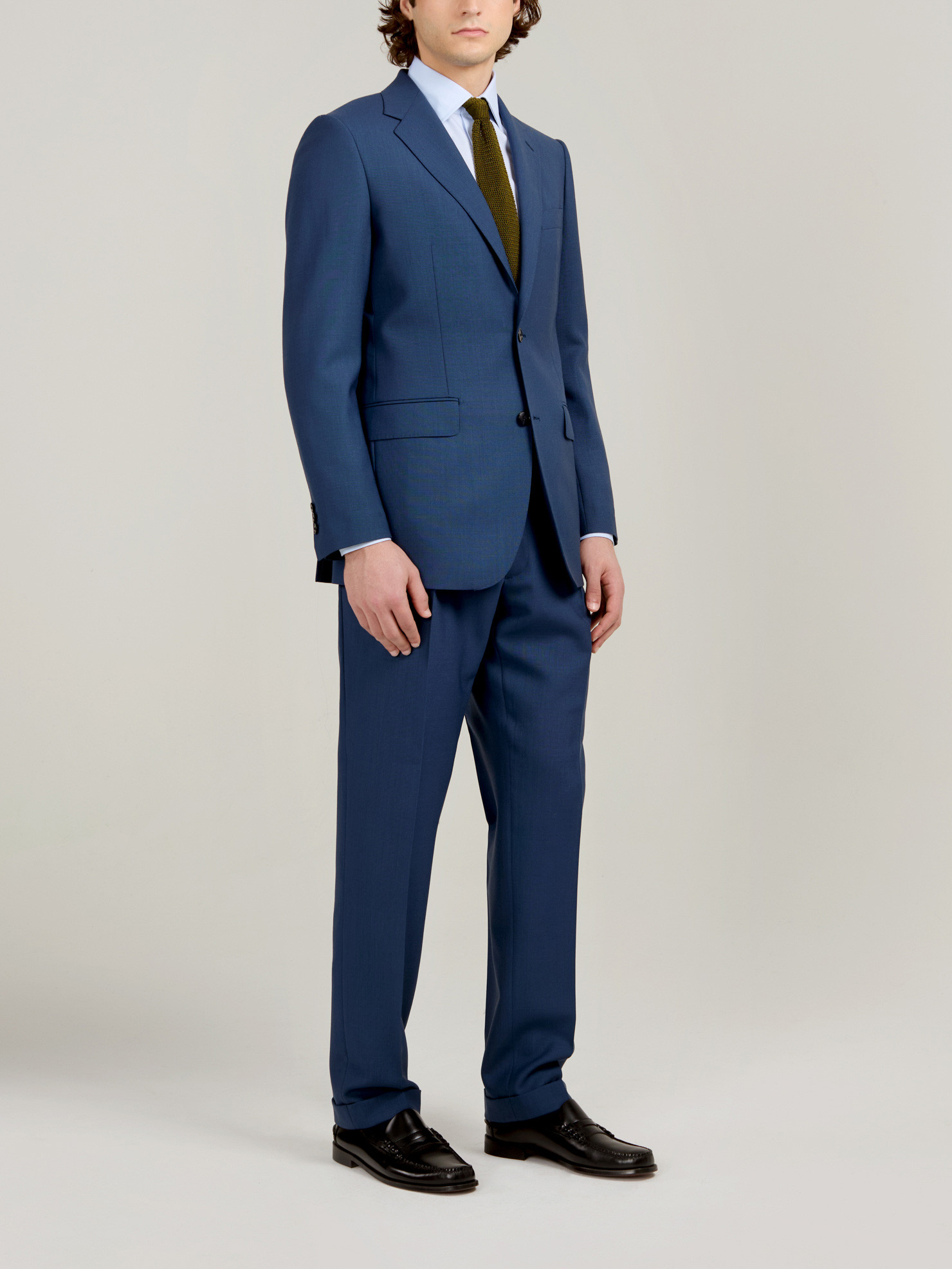 2-button straight grey-blue suit in Fresco wool, traditional construction, shoulders with structured epaulettes, side pockets with straight flaps, 2 side vents on back, half lined inside. Pants with belt loops, 2 inside pleats, 4cm turn-up on lower leg.