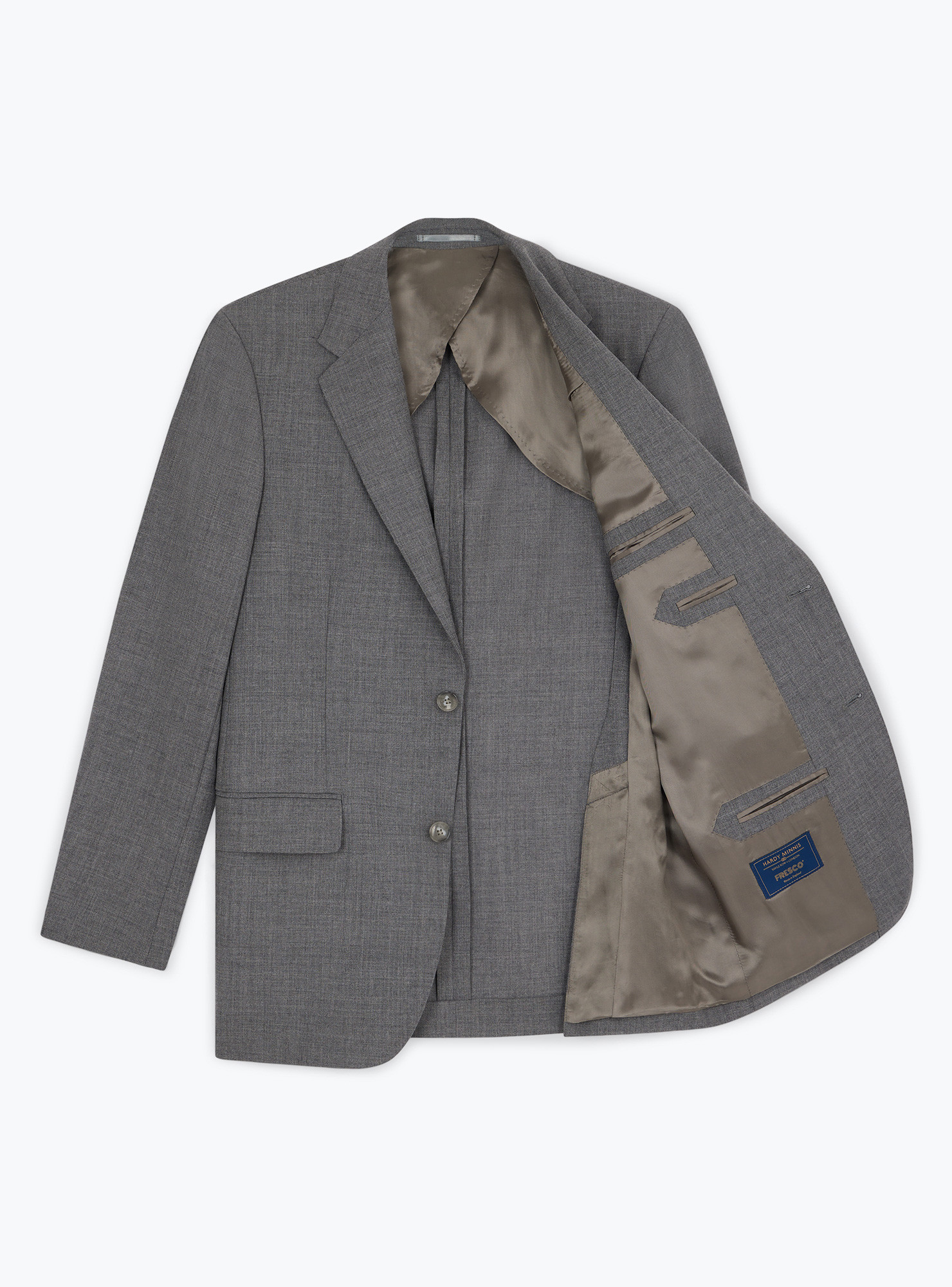 Medium-gray 2-button straight suit in Fresco wool. Traditional construction, shoulders with structured epaulets, straight flap side pockets, 2 back vents, half lined inside. Pants with belt loops, 2 inside pleats, 4cm turn-up on lower leg.