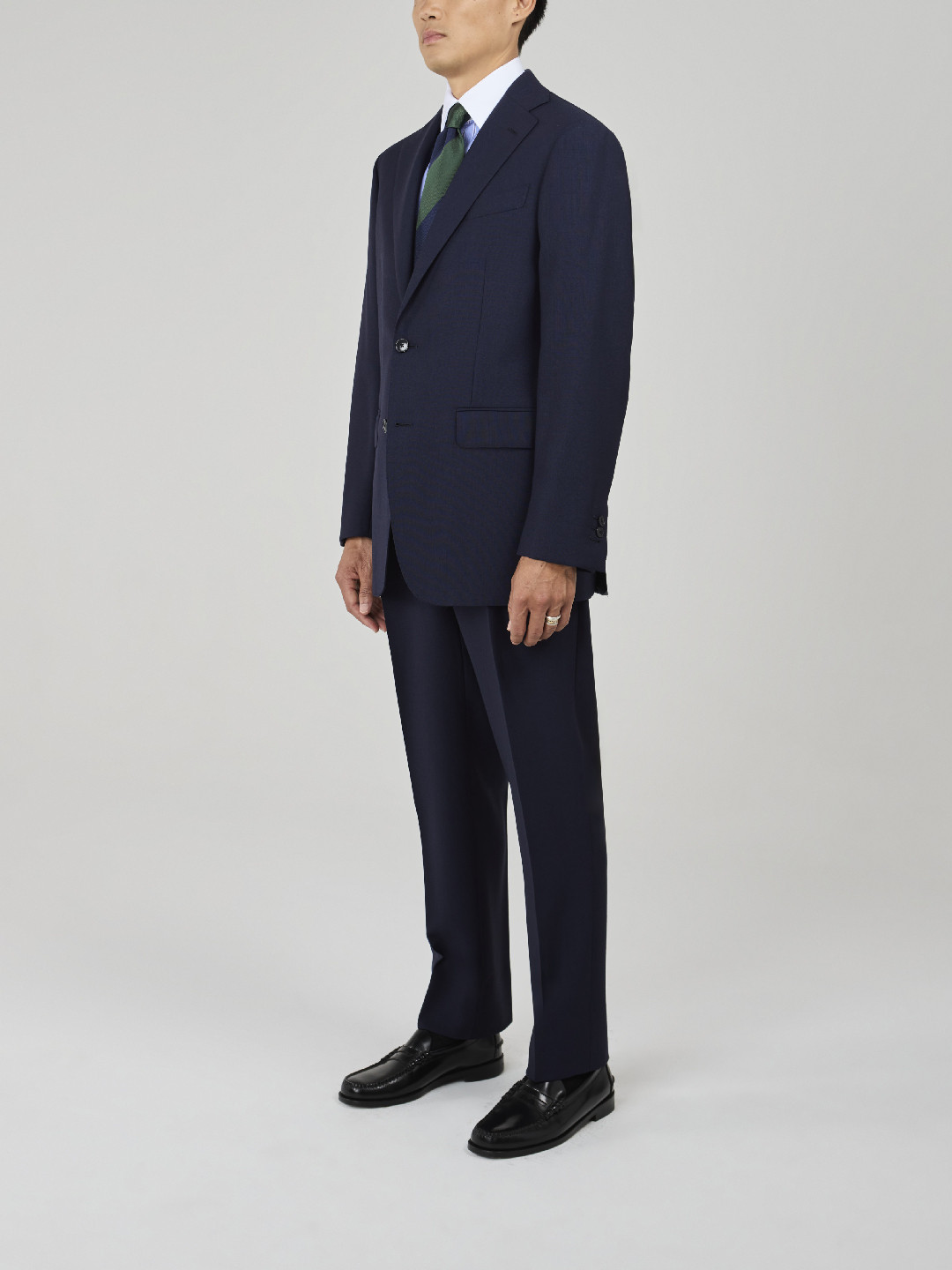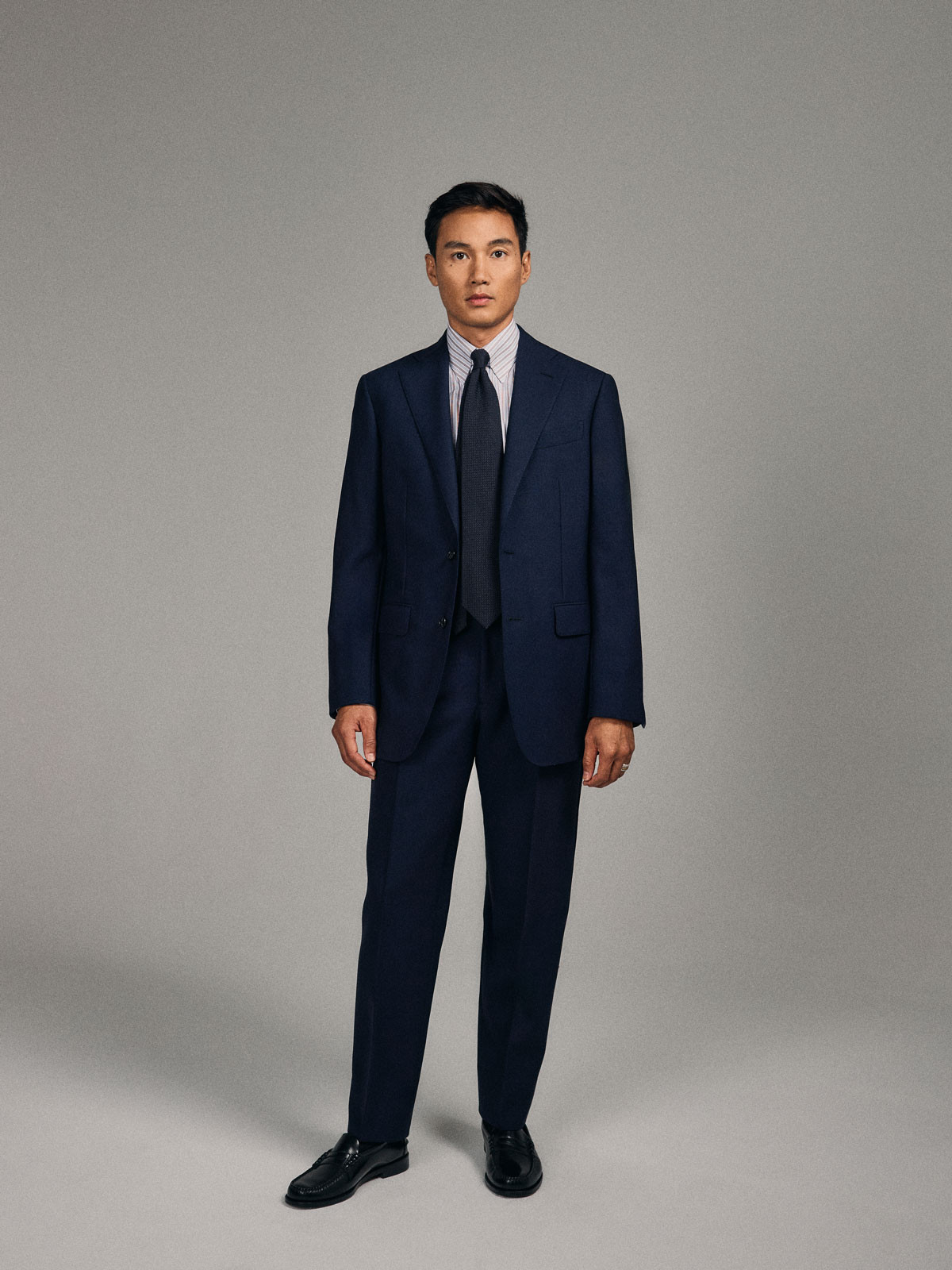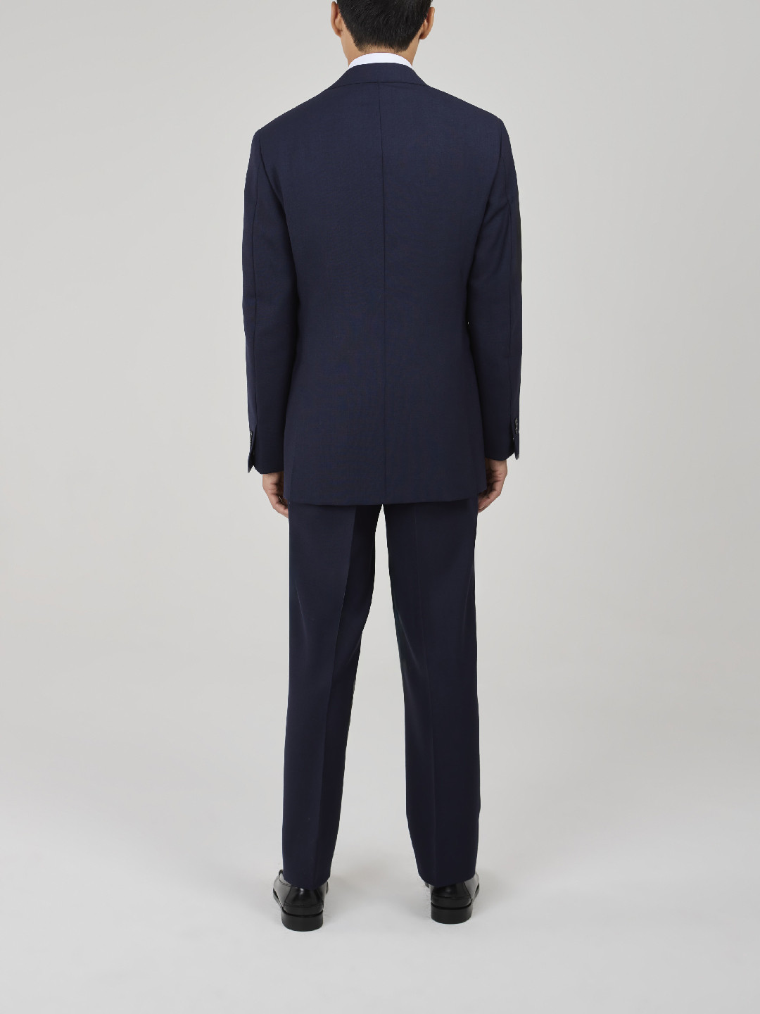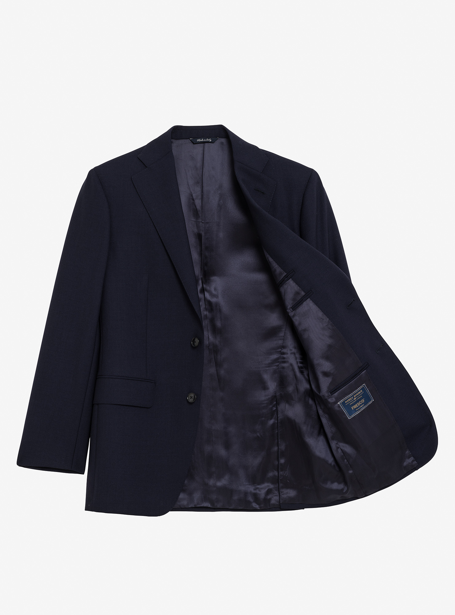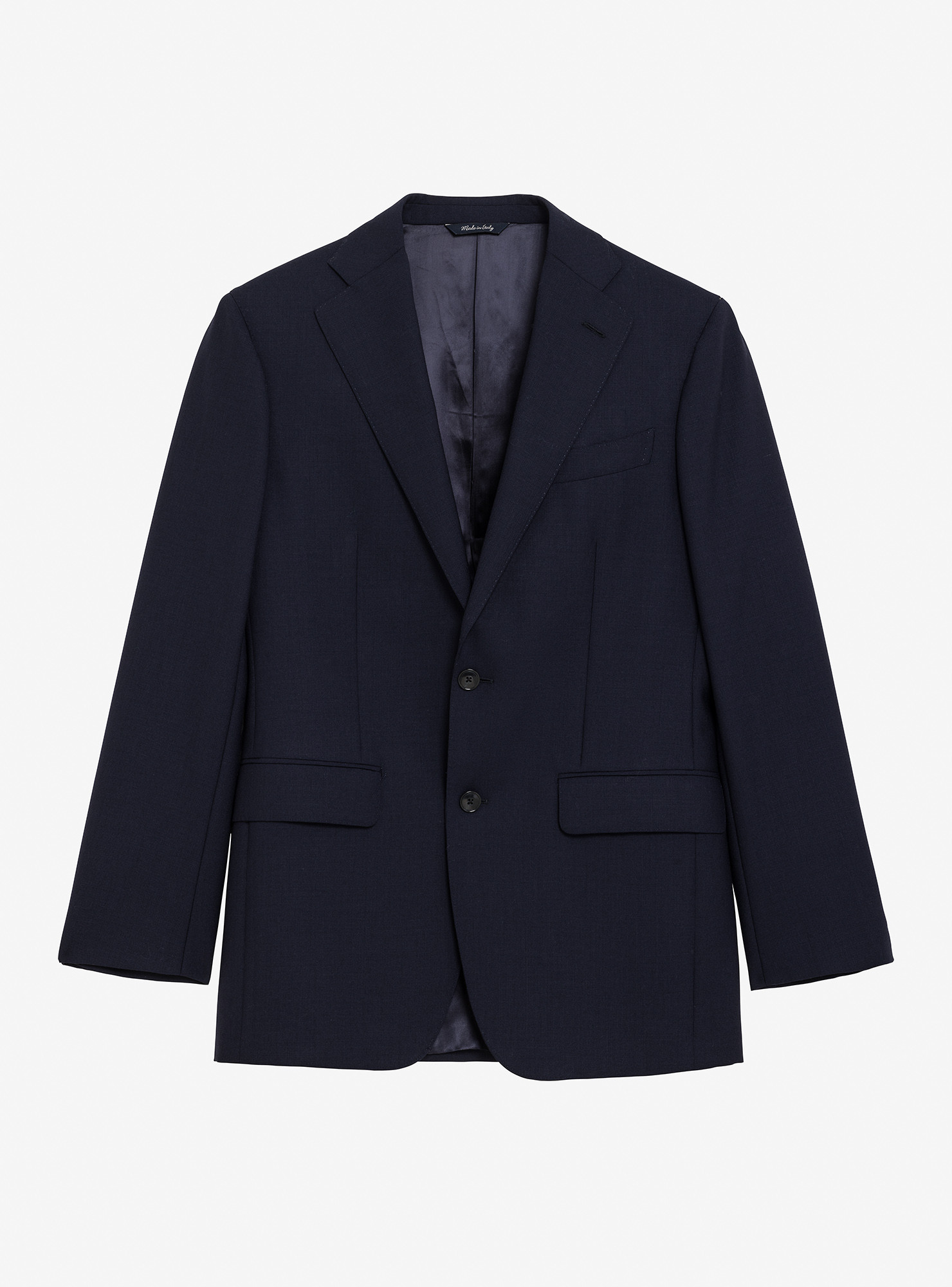 Made in Italy — Single-Breasted 2-Button Navy Fresco Wool Suit. Traditional construction with soft shoulders and AMF stitching, straight-flap side pockets, double rear vents, and a fully lined interior. Trousers with belt loops, one outward pleat, plain hem without turn-ups.