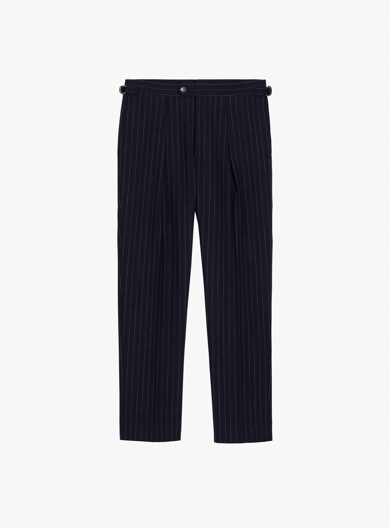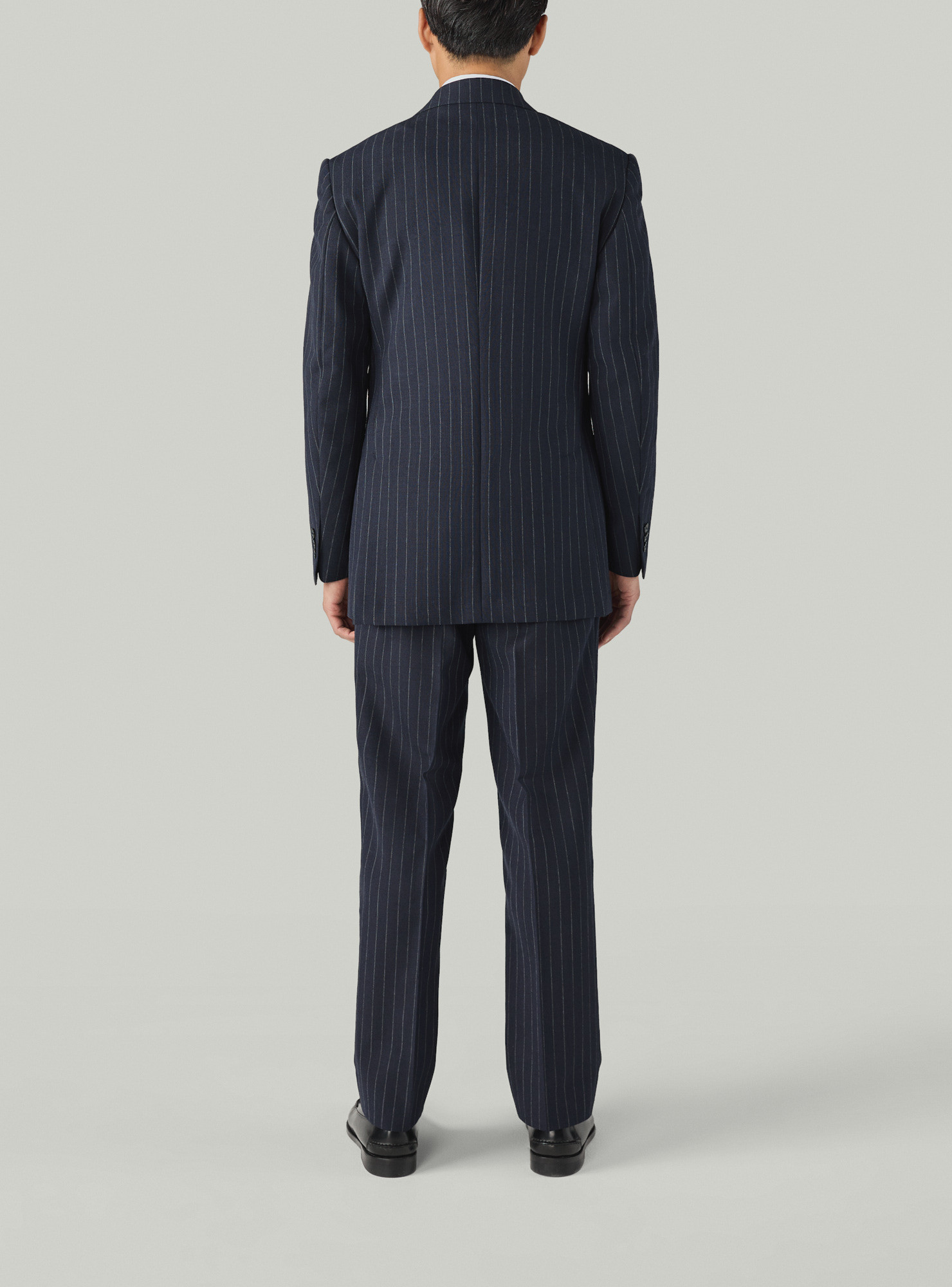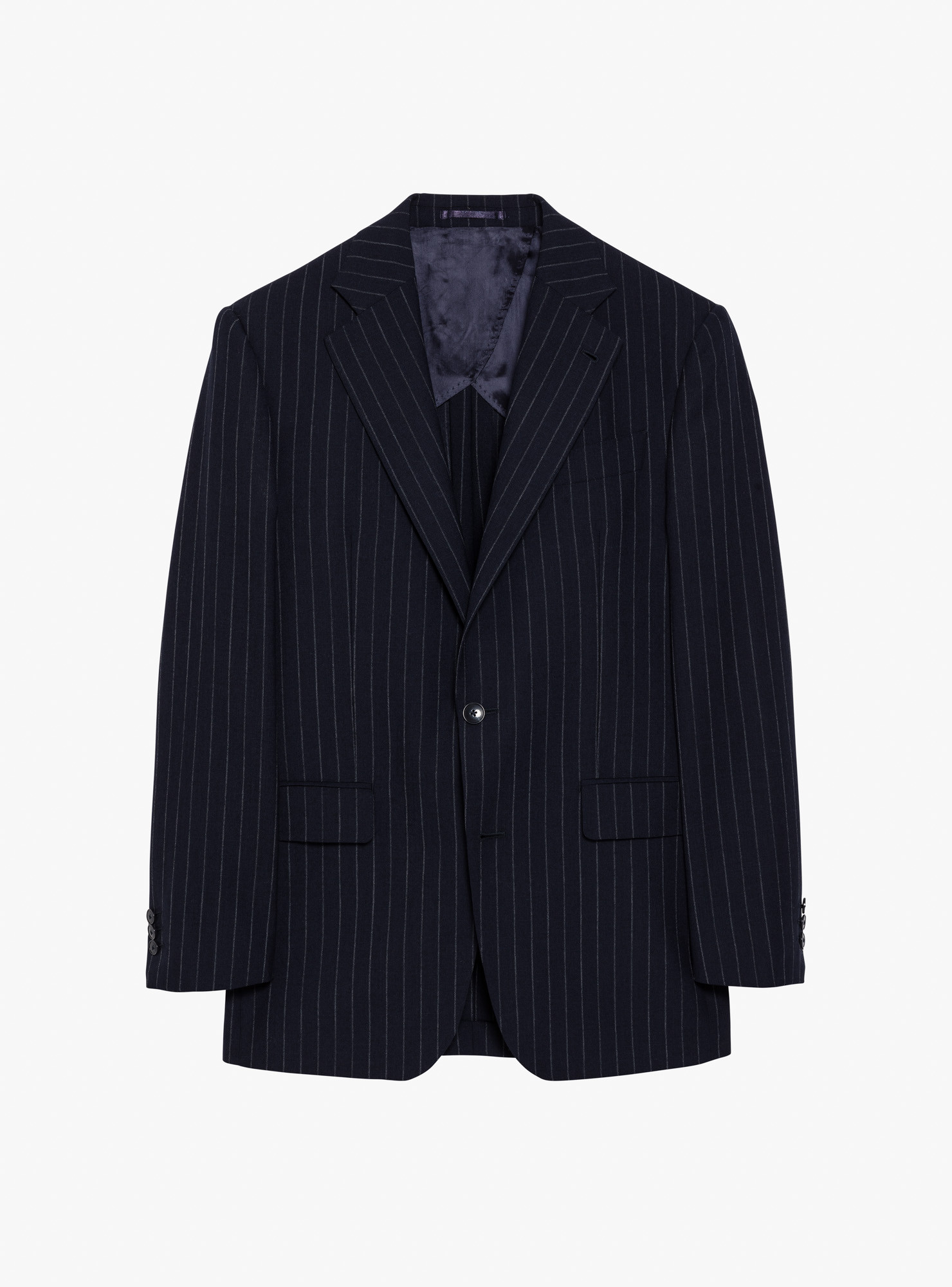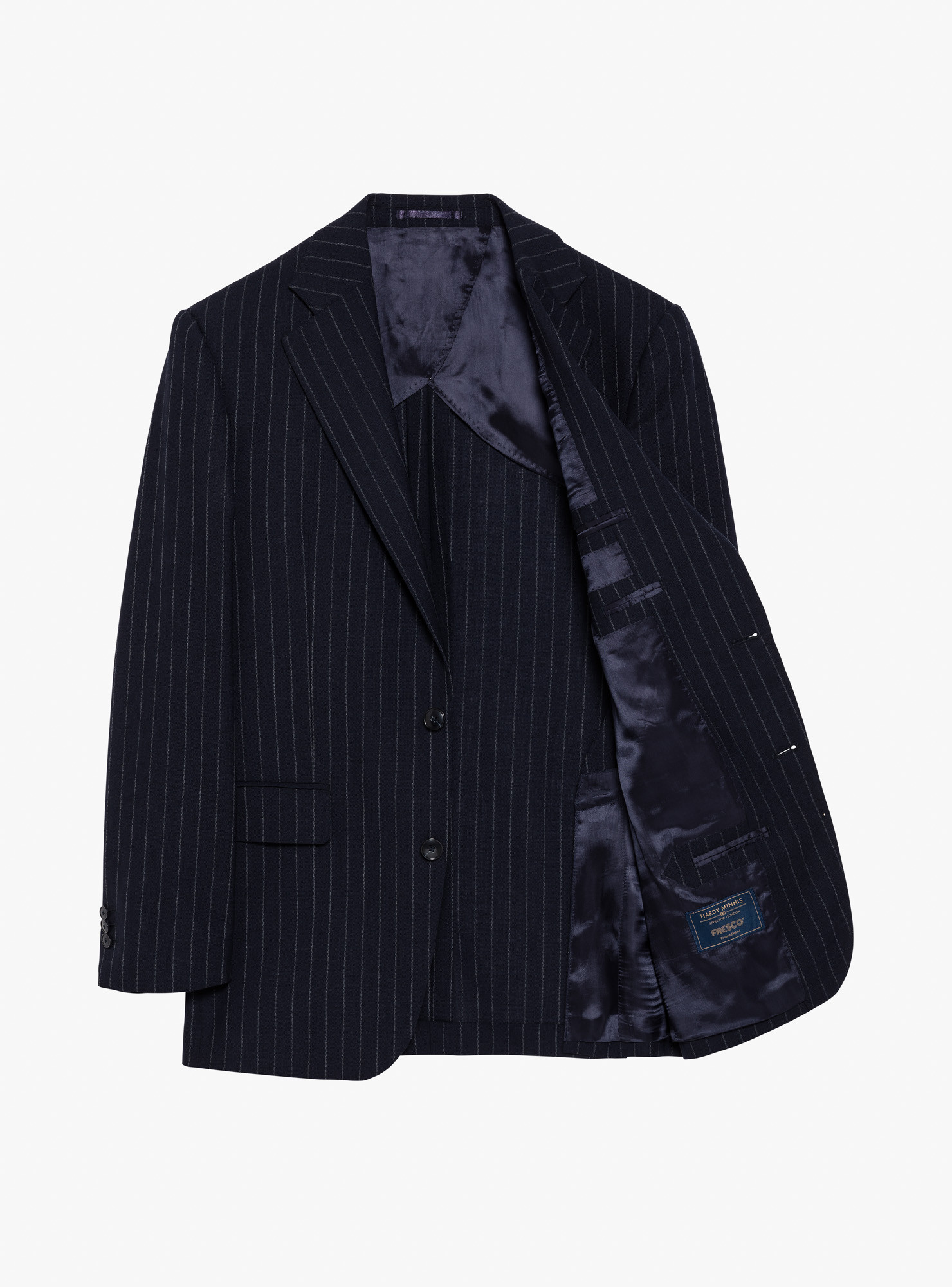 Two-button single-breasted suit in chalk-stripe Fresco. Tailored in a traditional construction with structured, padded shoulders, straight flap pockets and twin rear vents. The jacket is half-lined for comfort in warmer weather. Trousers are finished with side adjusters, a single inward pleat and plain hems.