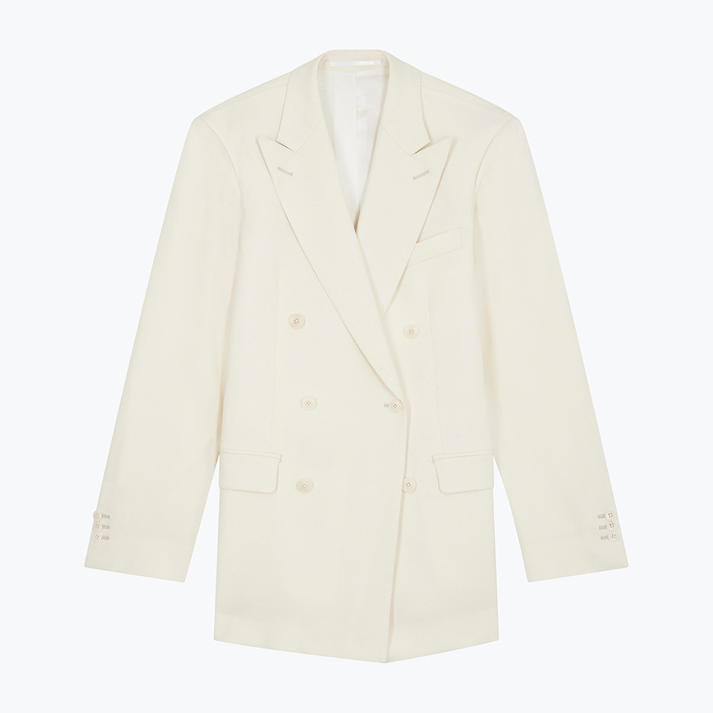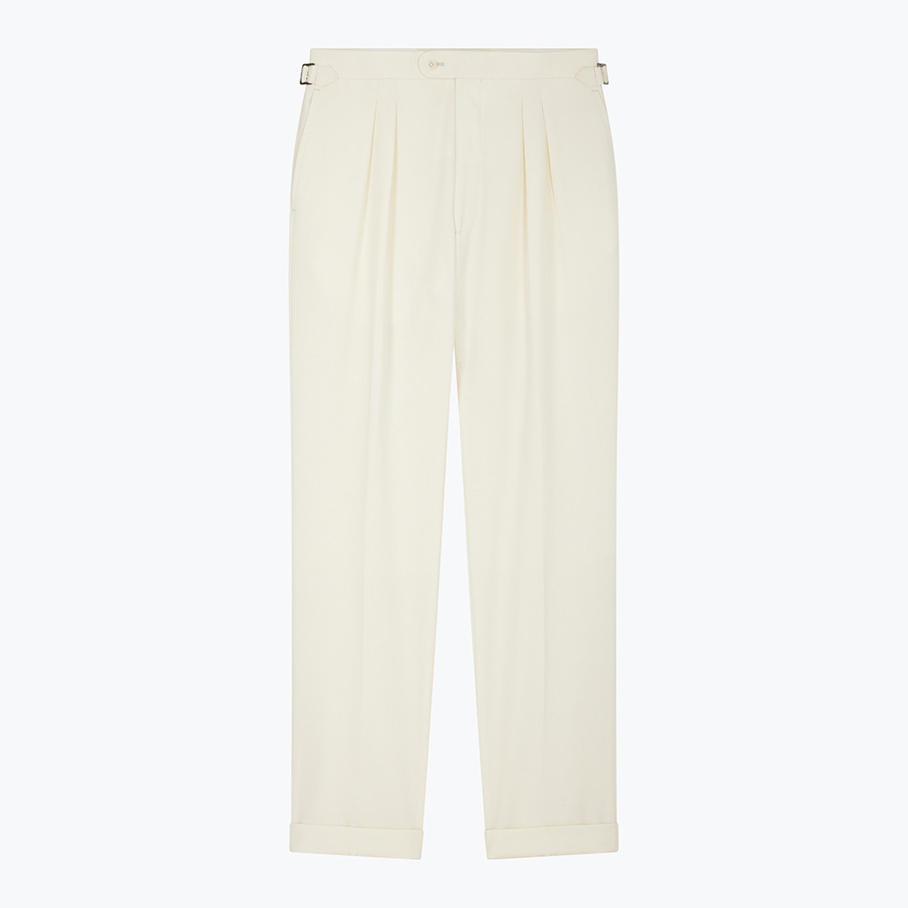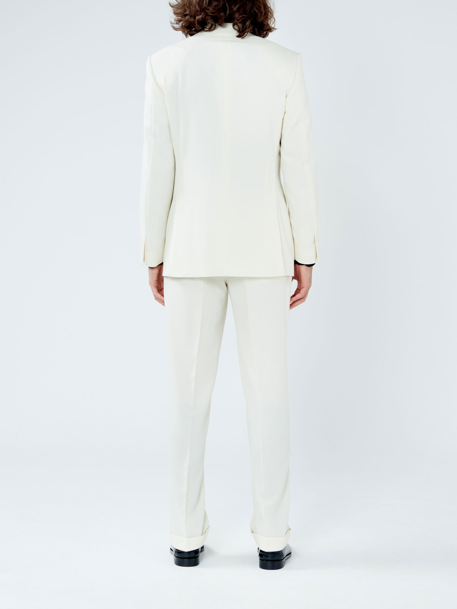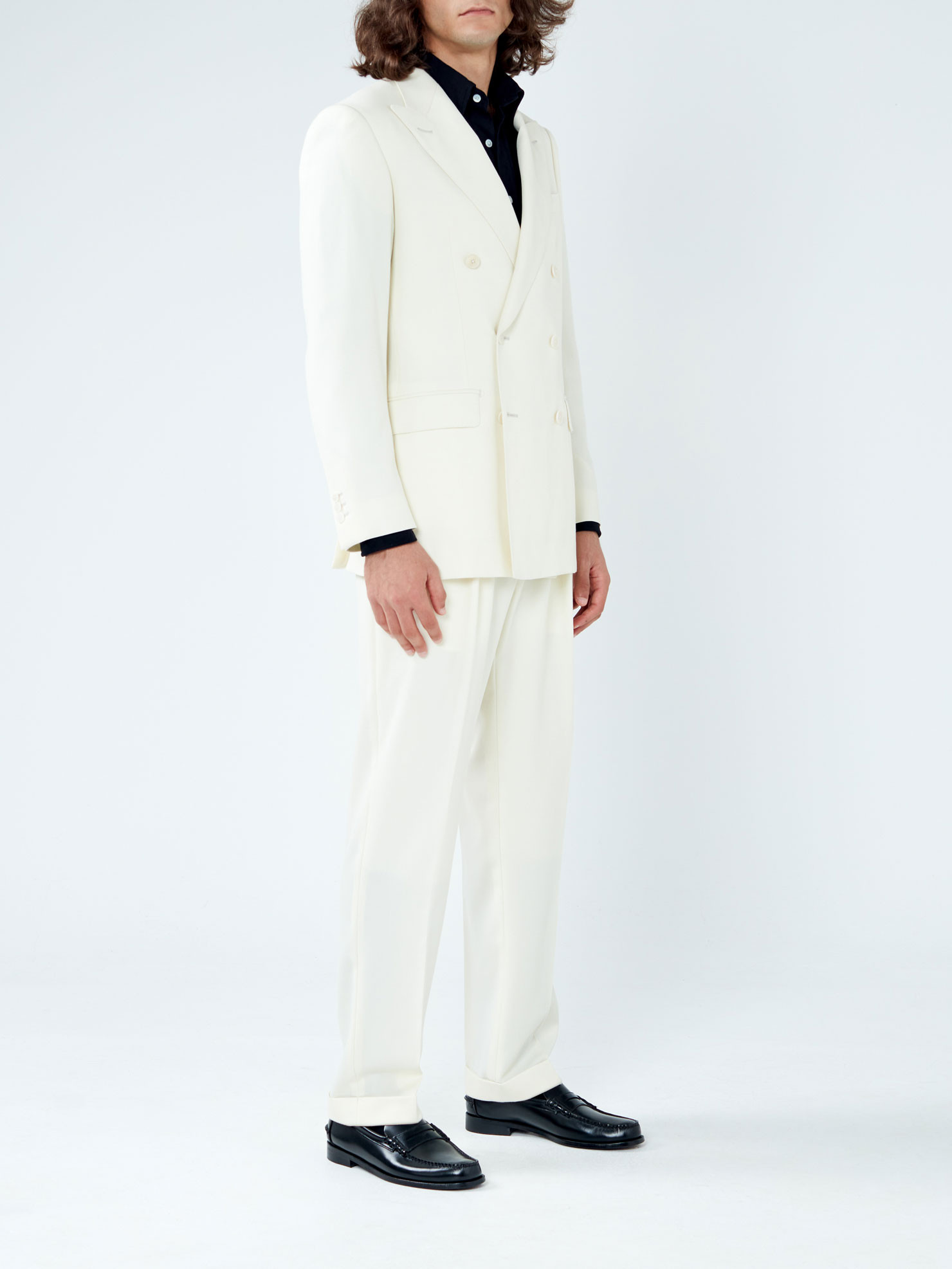 Ecru Wool Suit . Double breasted jacket with six buttons, large notch lapel, neapolitan shoulder, barchetta breast pocket, two right flap pockets, two side vents. Classic pants with double pleats, buckle & strap, slanted side pockets, one right back pocket, 4 cm turn up bottom.