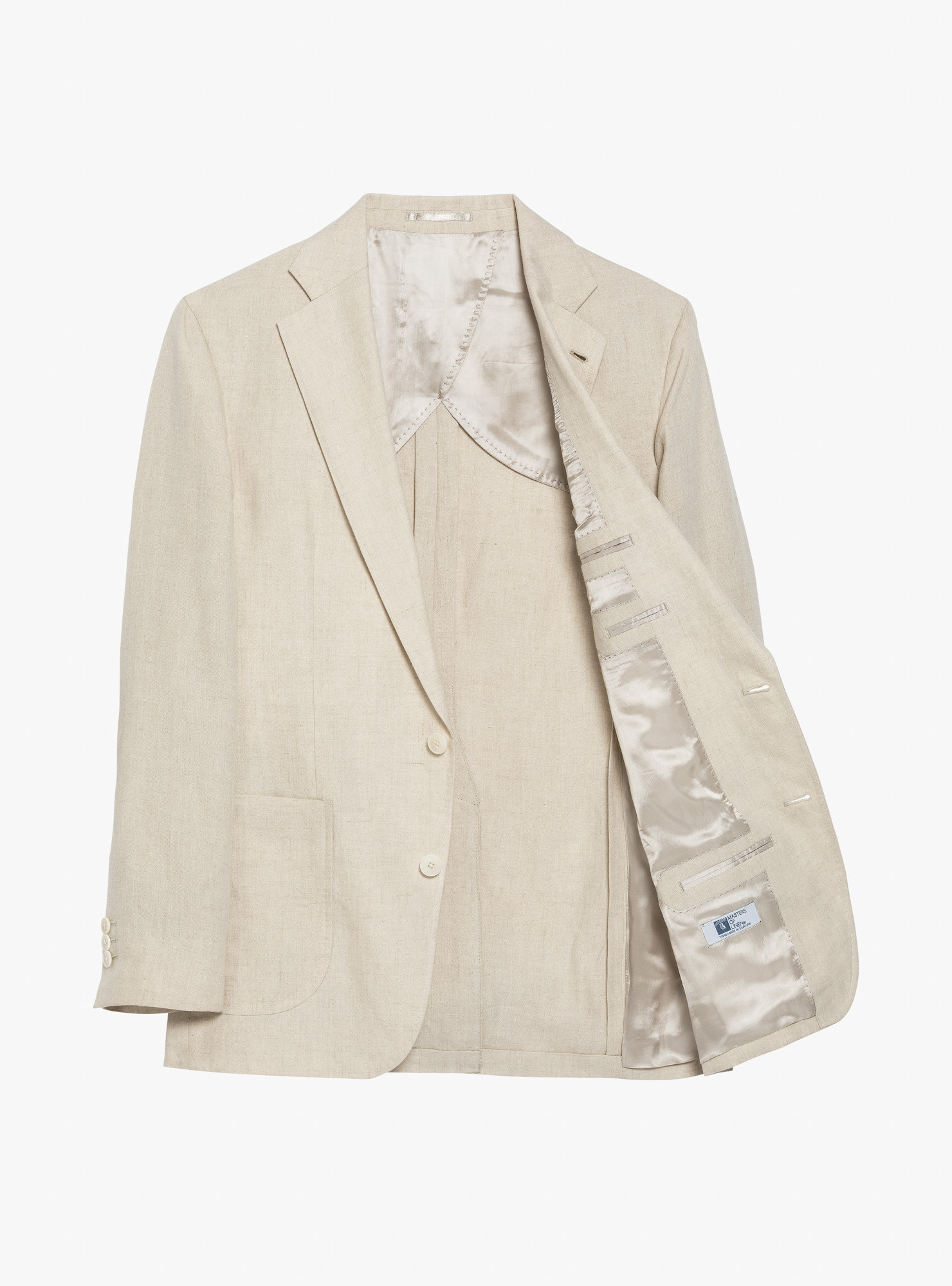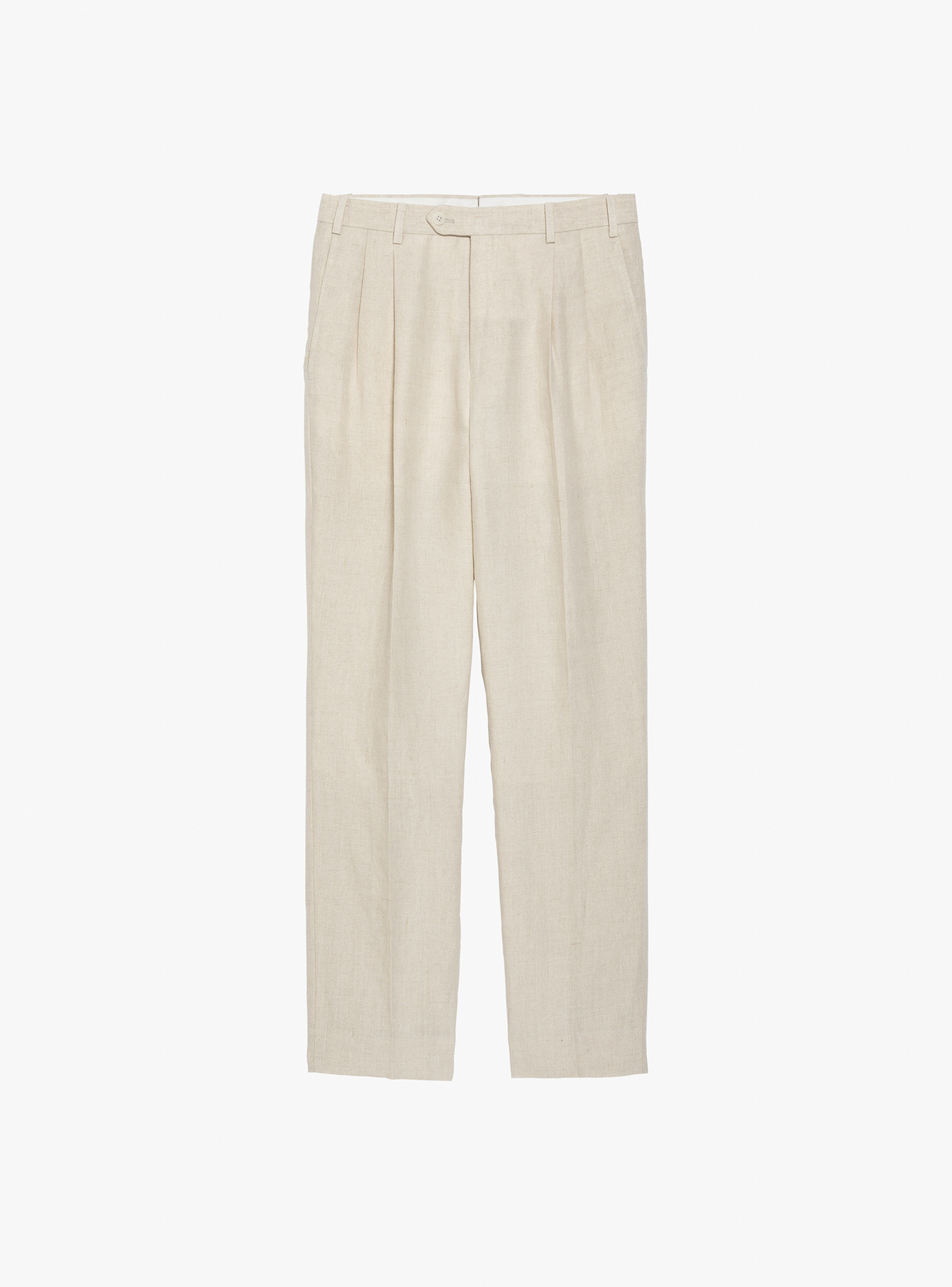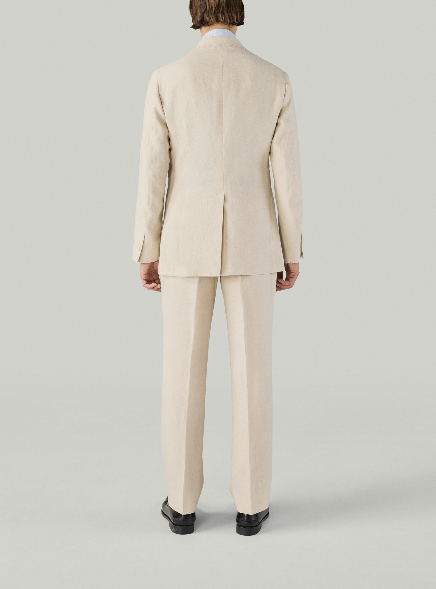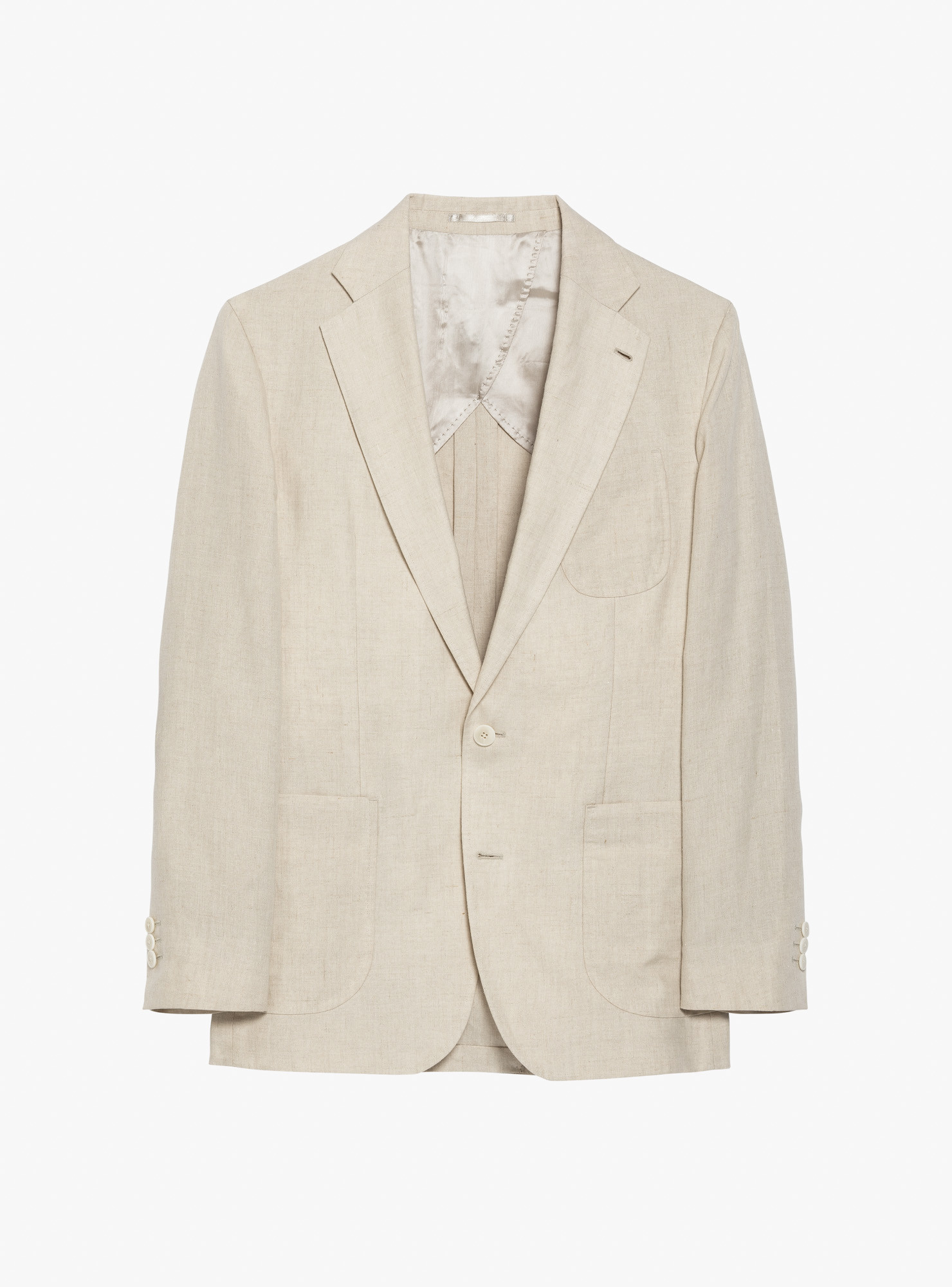 Two-button single-breasted suit in cream linen. Cut in a relaxed, unstructured make with completely natural shoulders and no padding. Straight patch chest pocket and matching patch hip pockets, with a single rear vent. Half-lined inside for a lighter feel. Trousers feature belt loops, double outward pleats and plain hems.