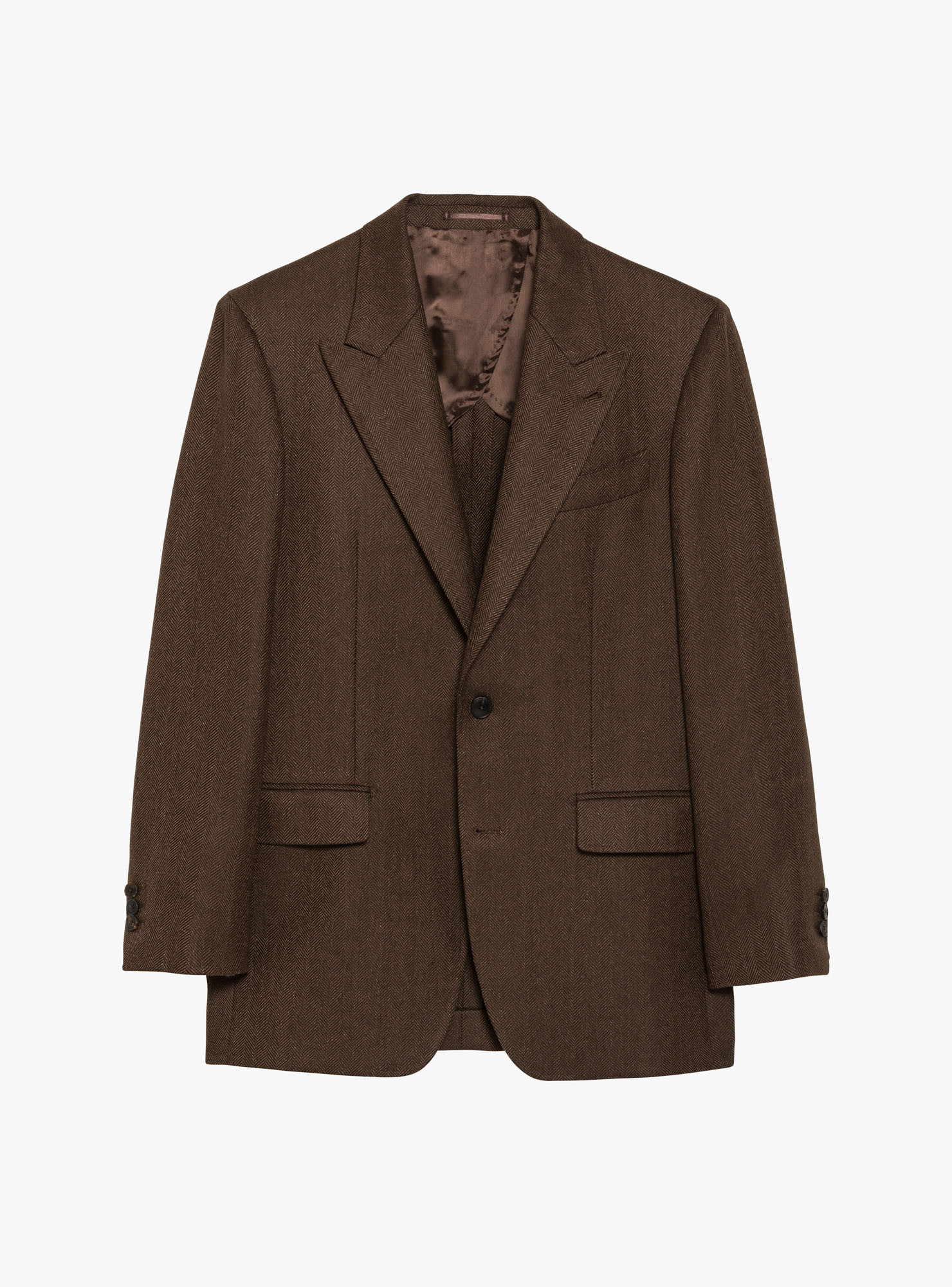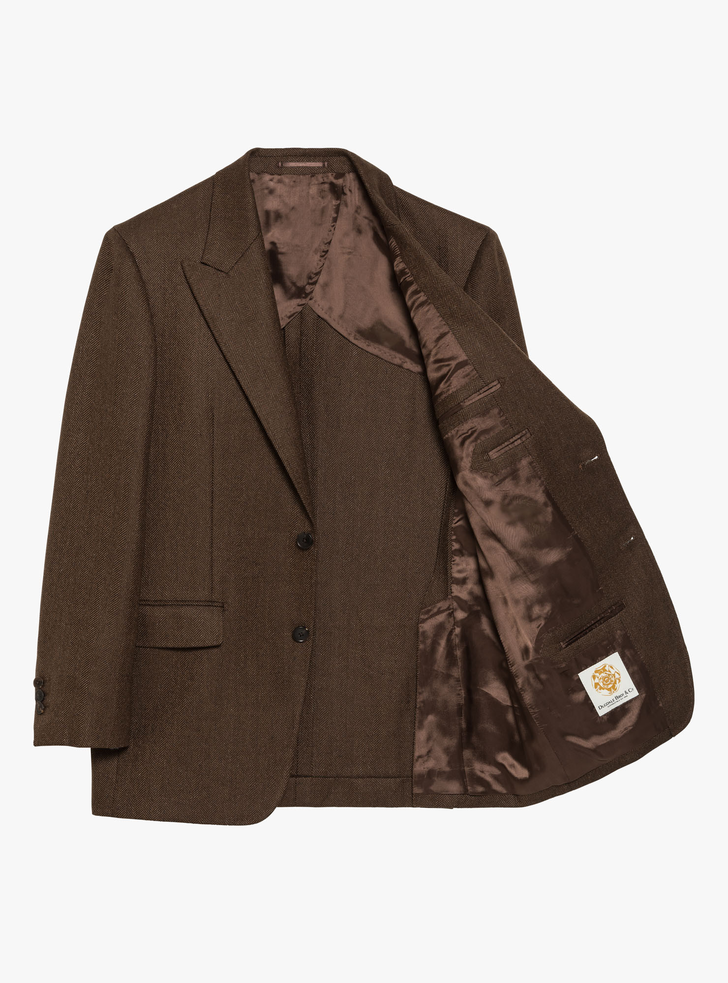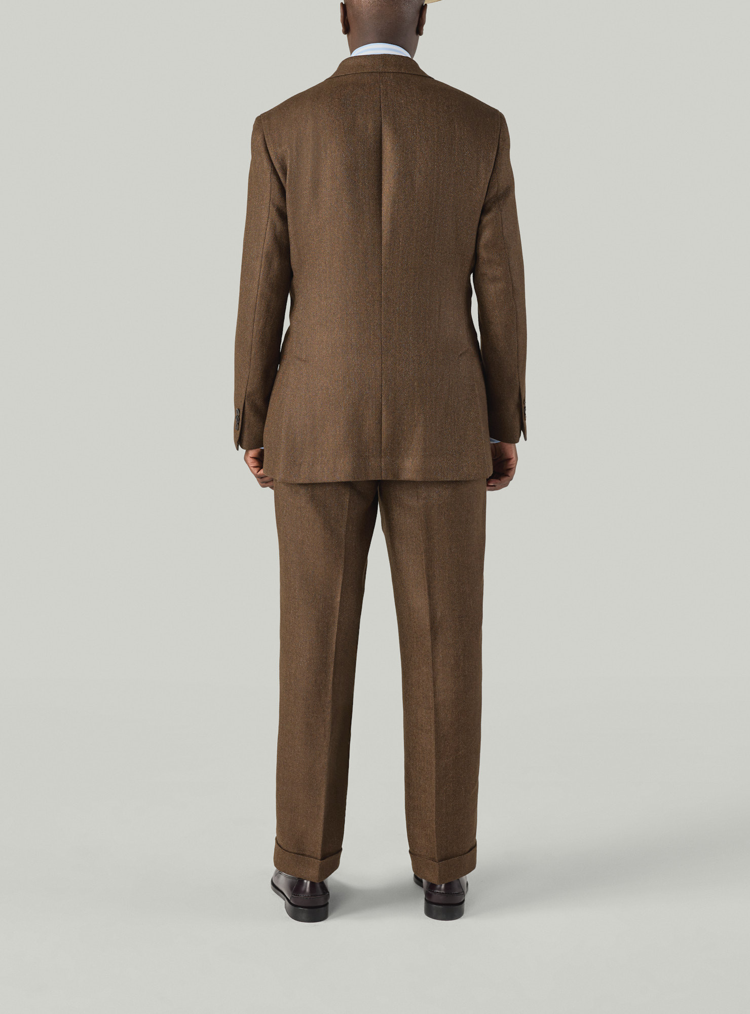 Six-button double-breasted suit in brown wool-linen herringbone. Softly tailored with an unstructured construction and natural shoulders, finished with 6 mm AMF stitching. Straight flap pockets and a single rear vent. The jacket is half-lined for lightness. Trousers come with belt loops, double inward pleats and 4 cm turn-ups.