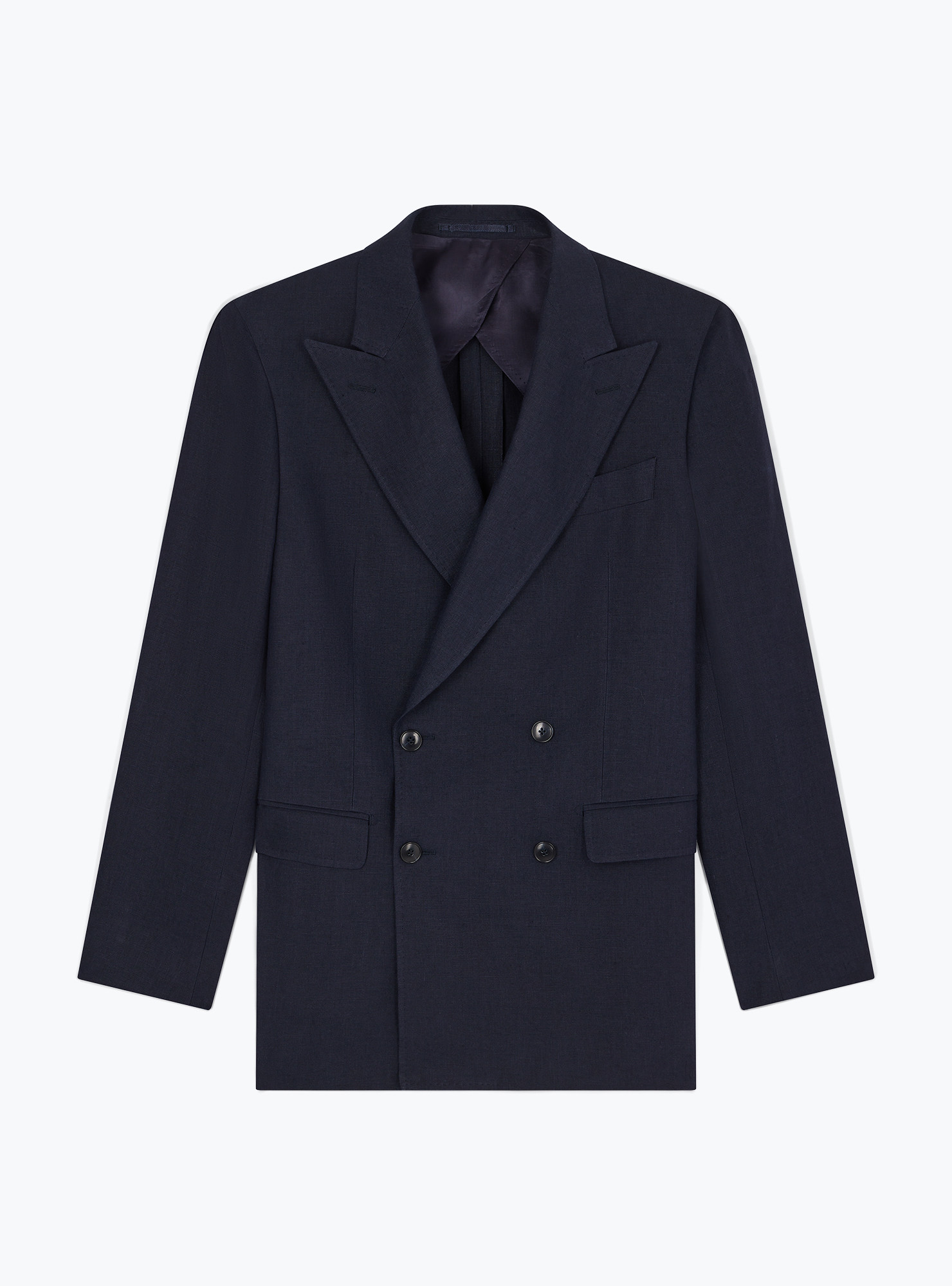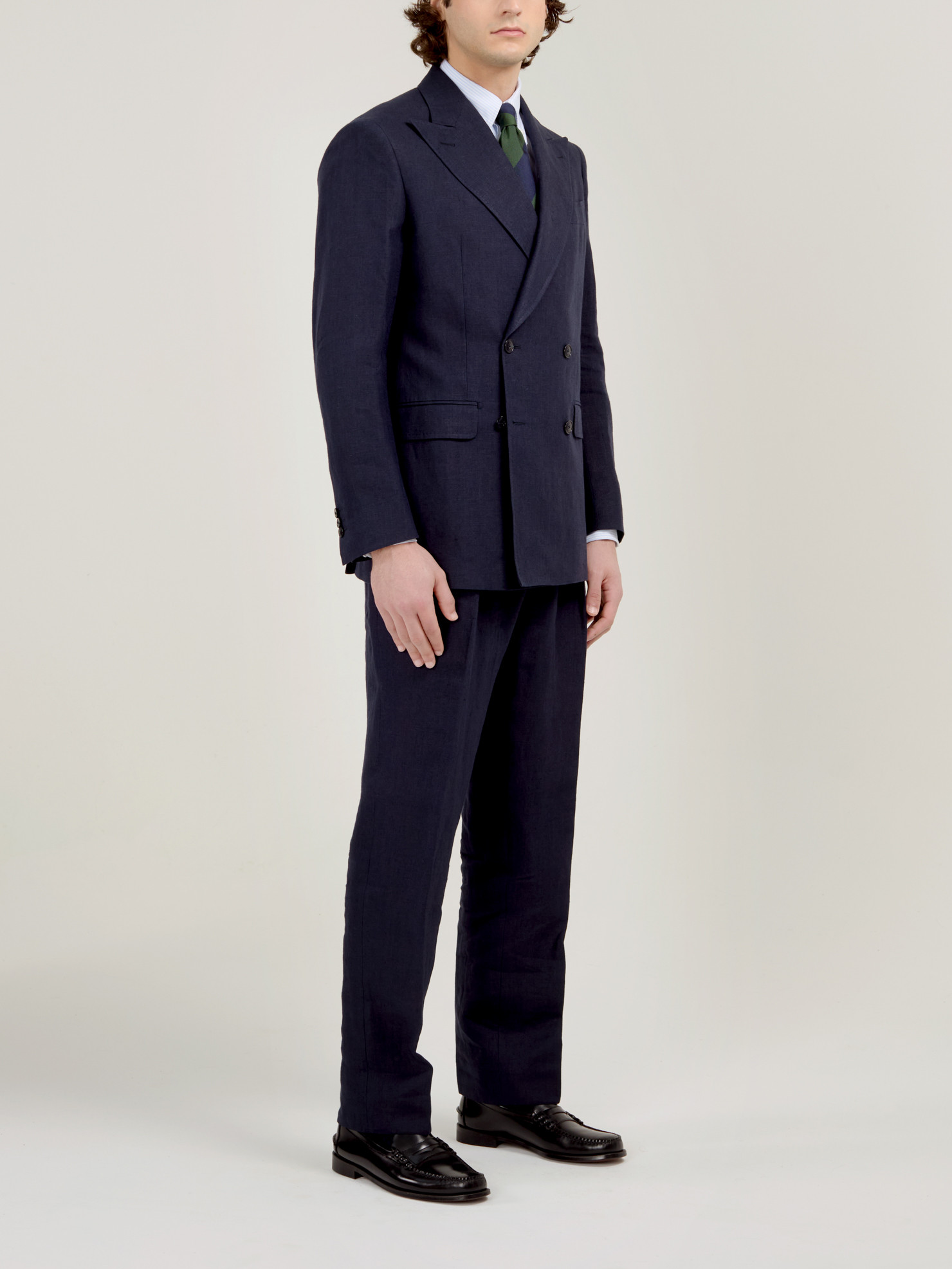 4-button double-breasted suit in navy linen. Traditional construction, shoulders with soft shoulder pads, straight flap side pockets, 2 side vents on back, half lined inside. Pants with buckle & strap, one inside pleat, no turn-up hem.