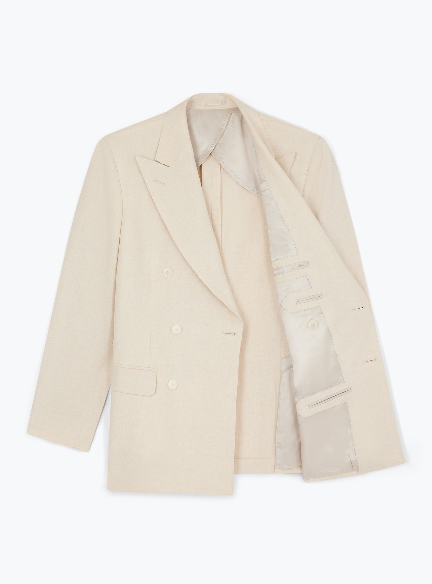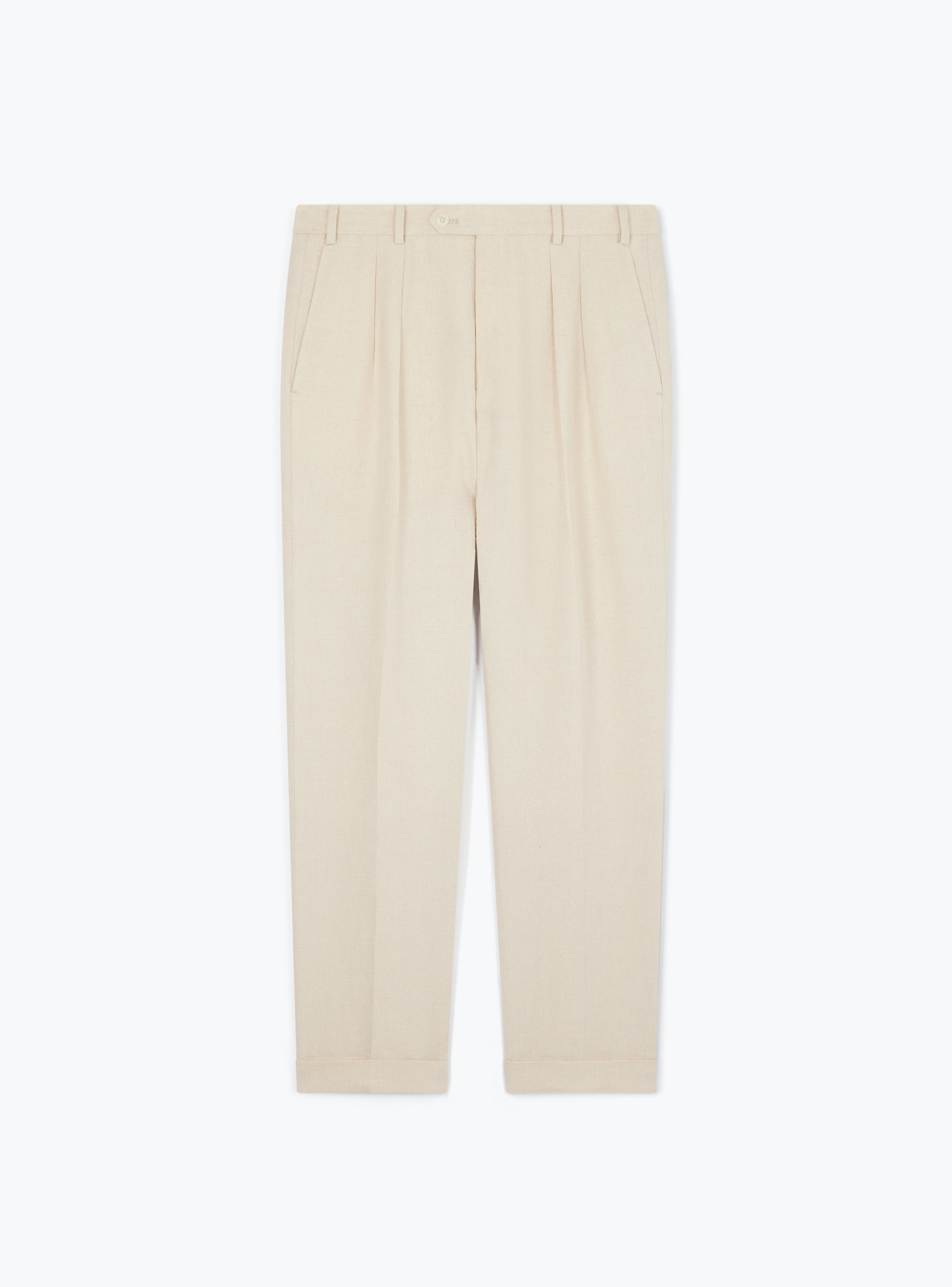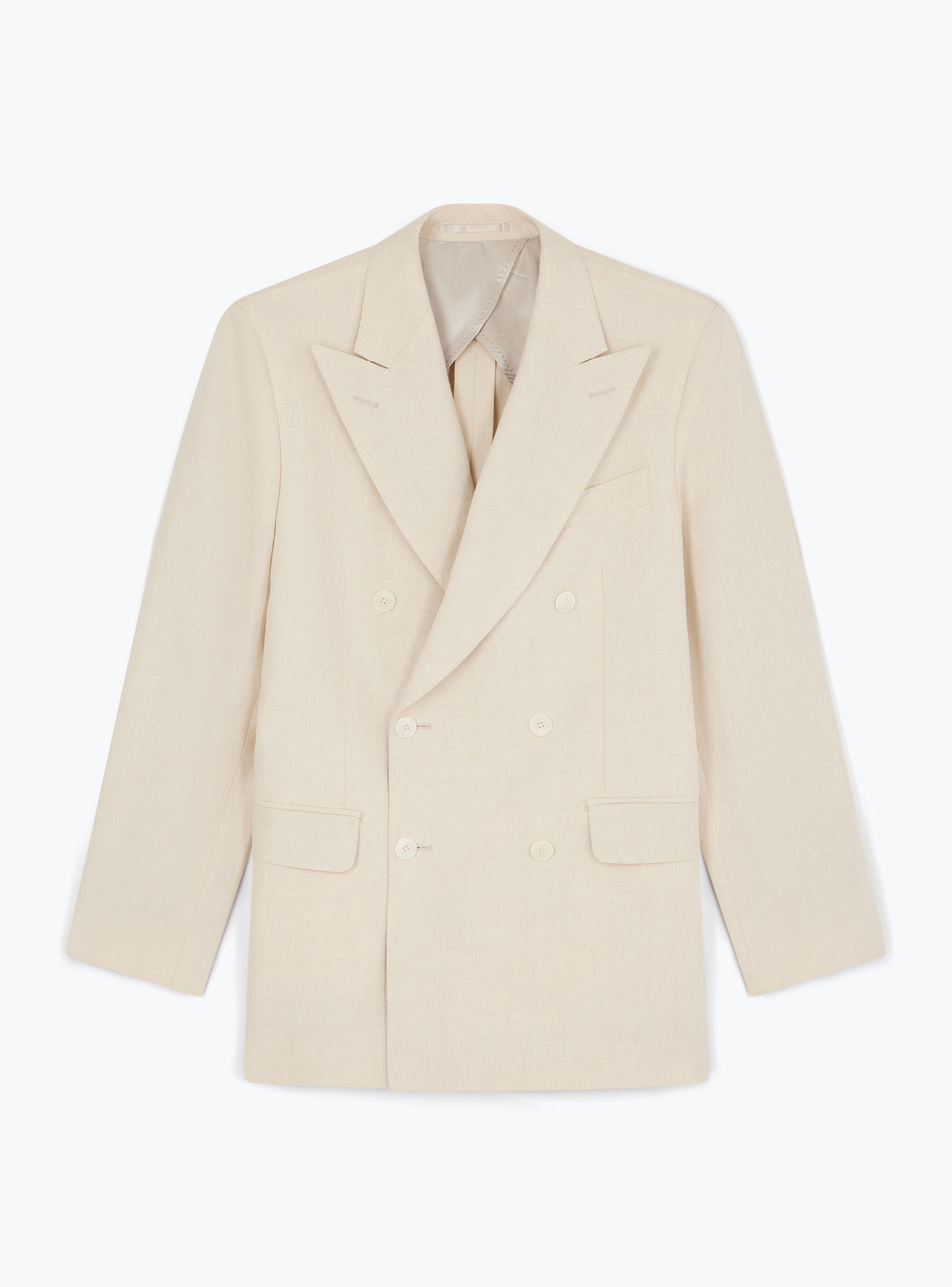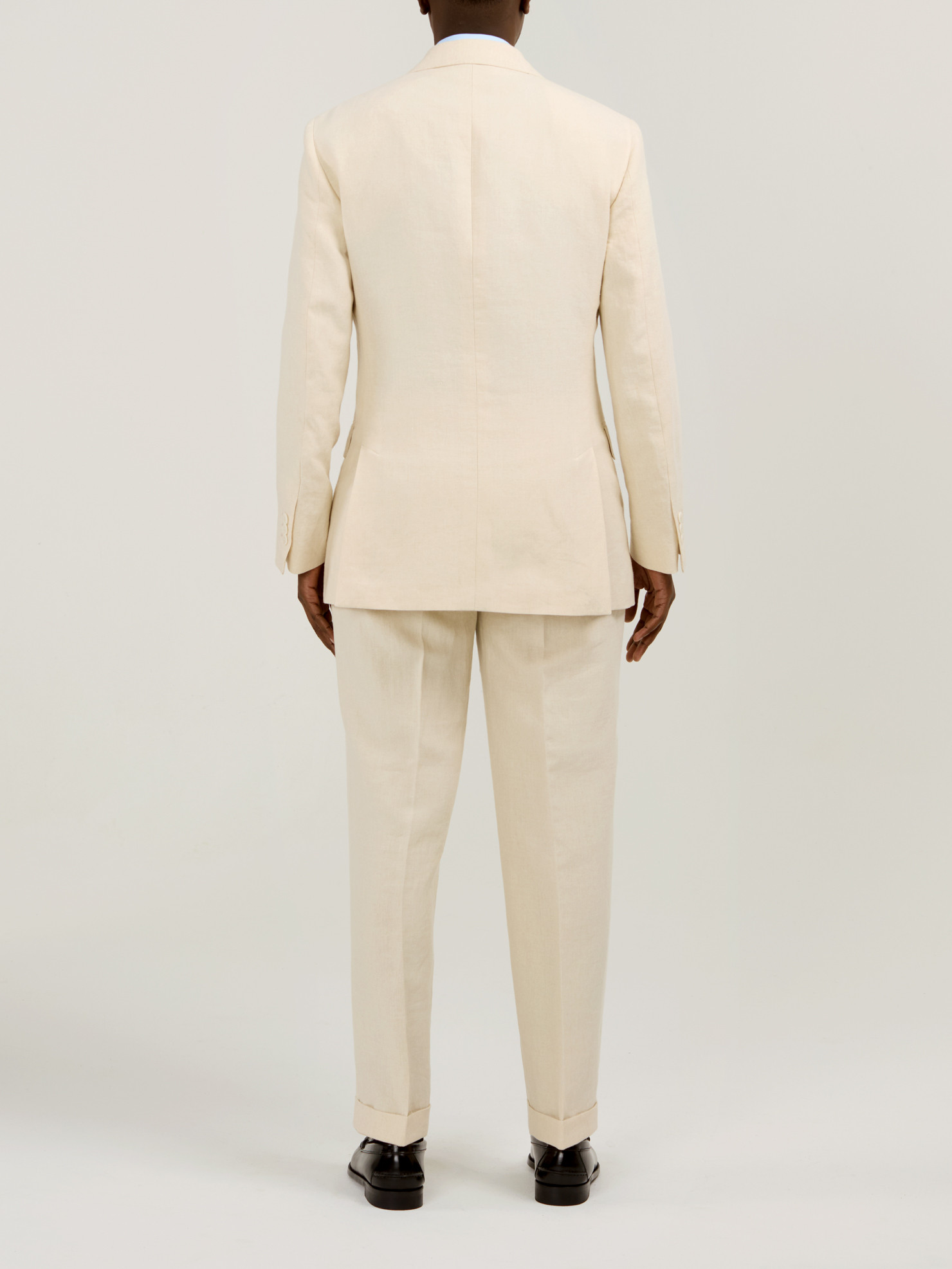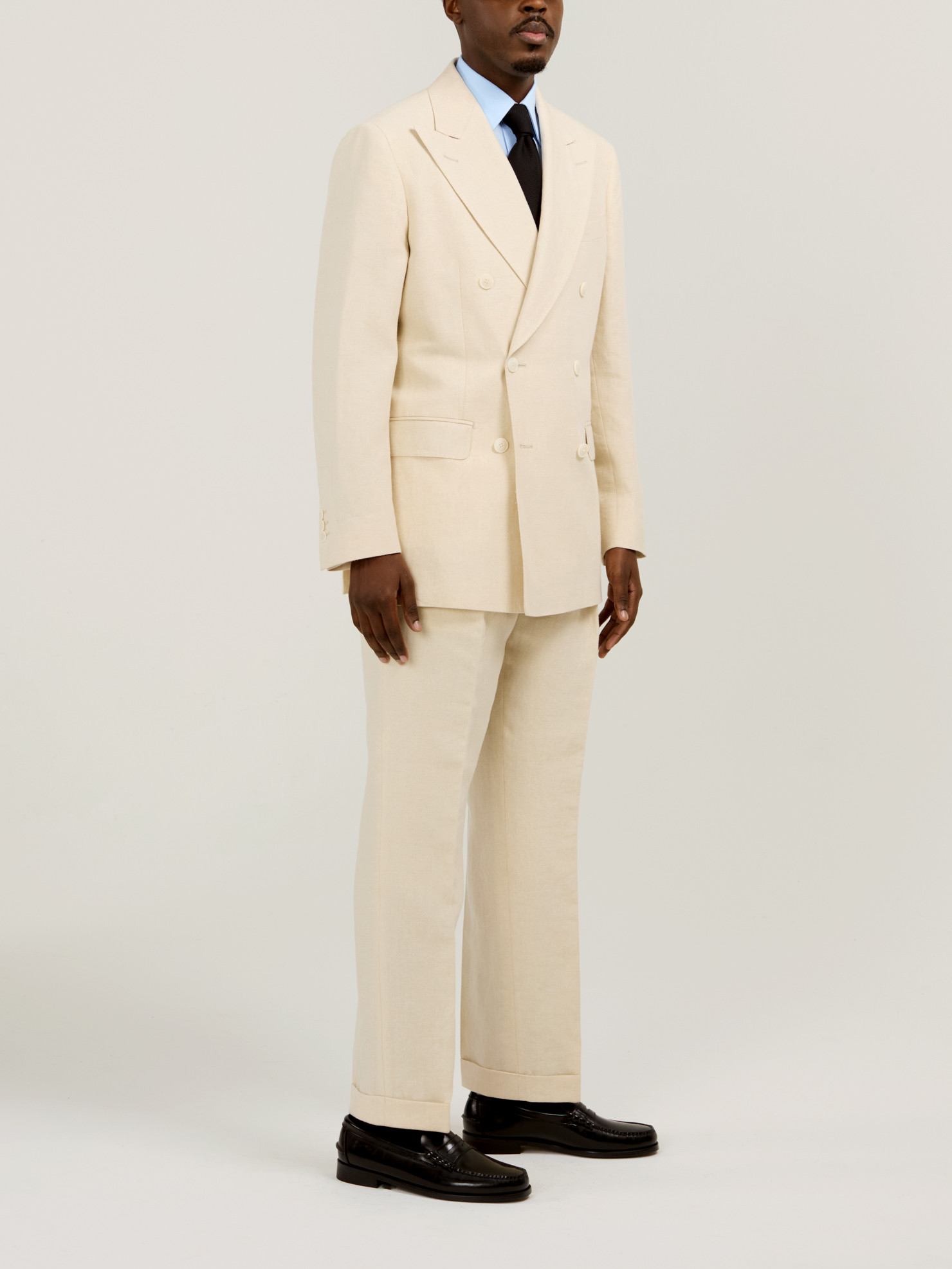 6-button double-breasted suit in sand linen. Traditional construction, shoulders with soft shoulder pads, side pockets with straight flap, 2 side vents on back, half lined inside. Pants with belt loops, double inside pleats, 4cm turn-up hem.