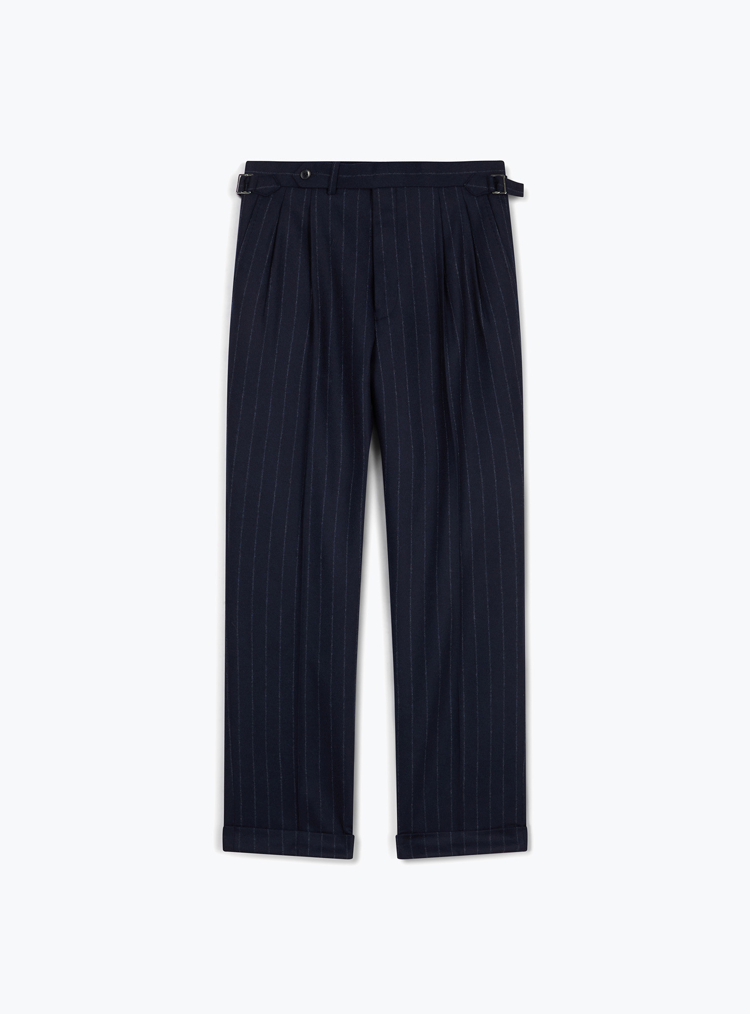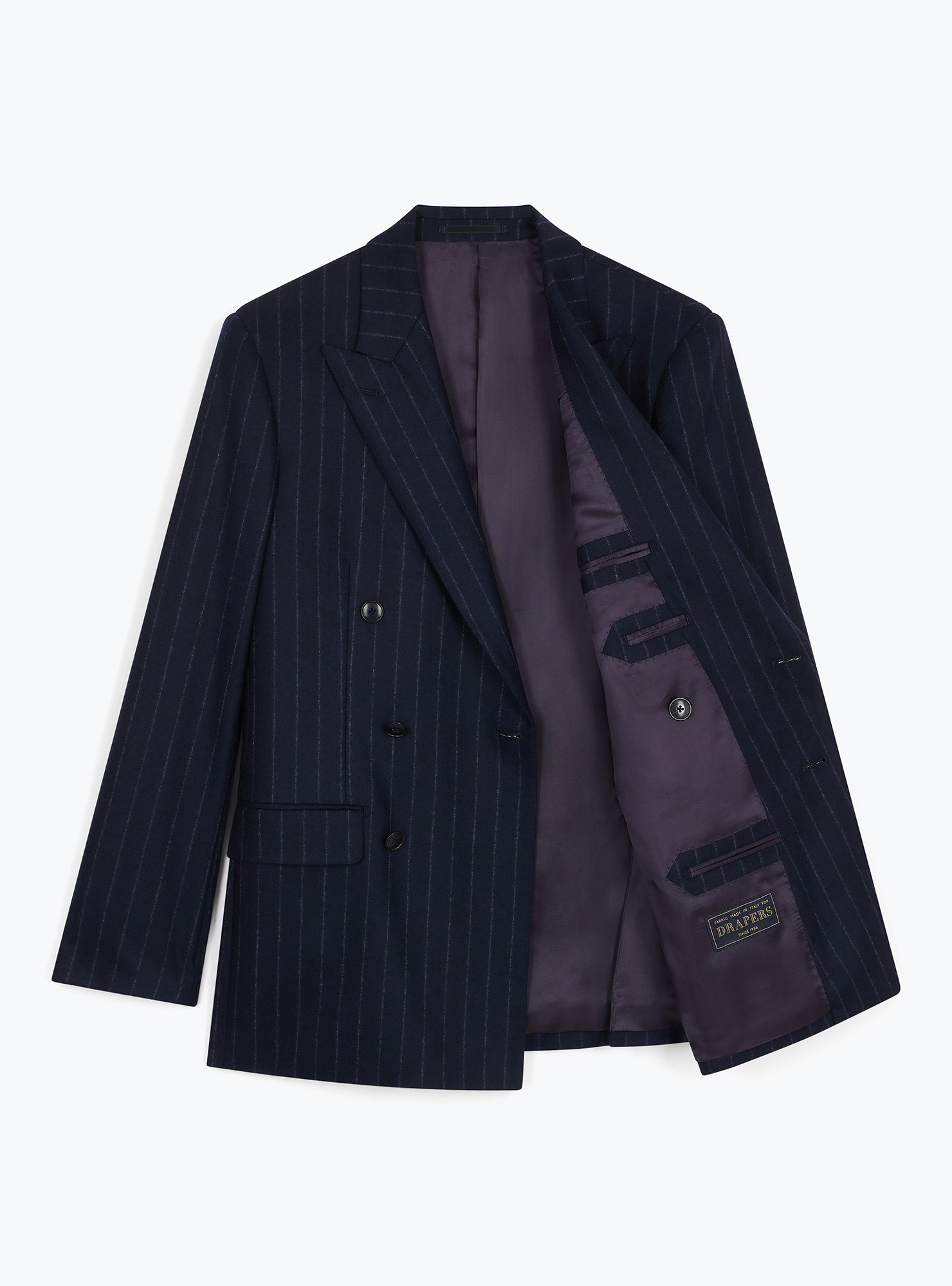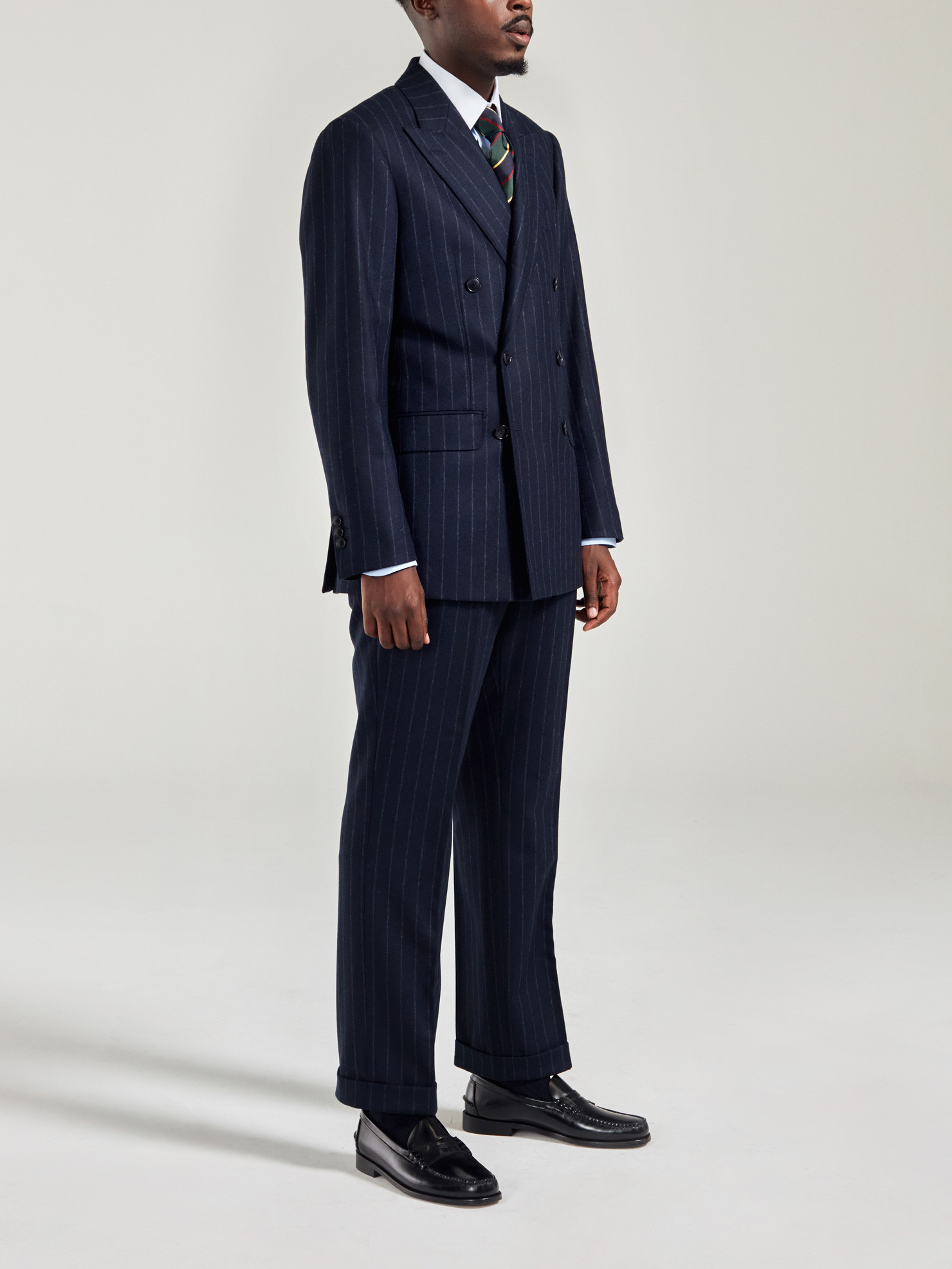Navy blue chalk stripe 6-button double-breasted suit in Drapers wool flannel. Traditional fit, shoulders with structured epaulets, side pockets with straight flaps, 2 back slits and full inner lining. Pants with buckles and straps, offset buttoning, 2 outside pleats, 4cm turn-up at bottom of leg.