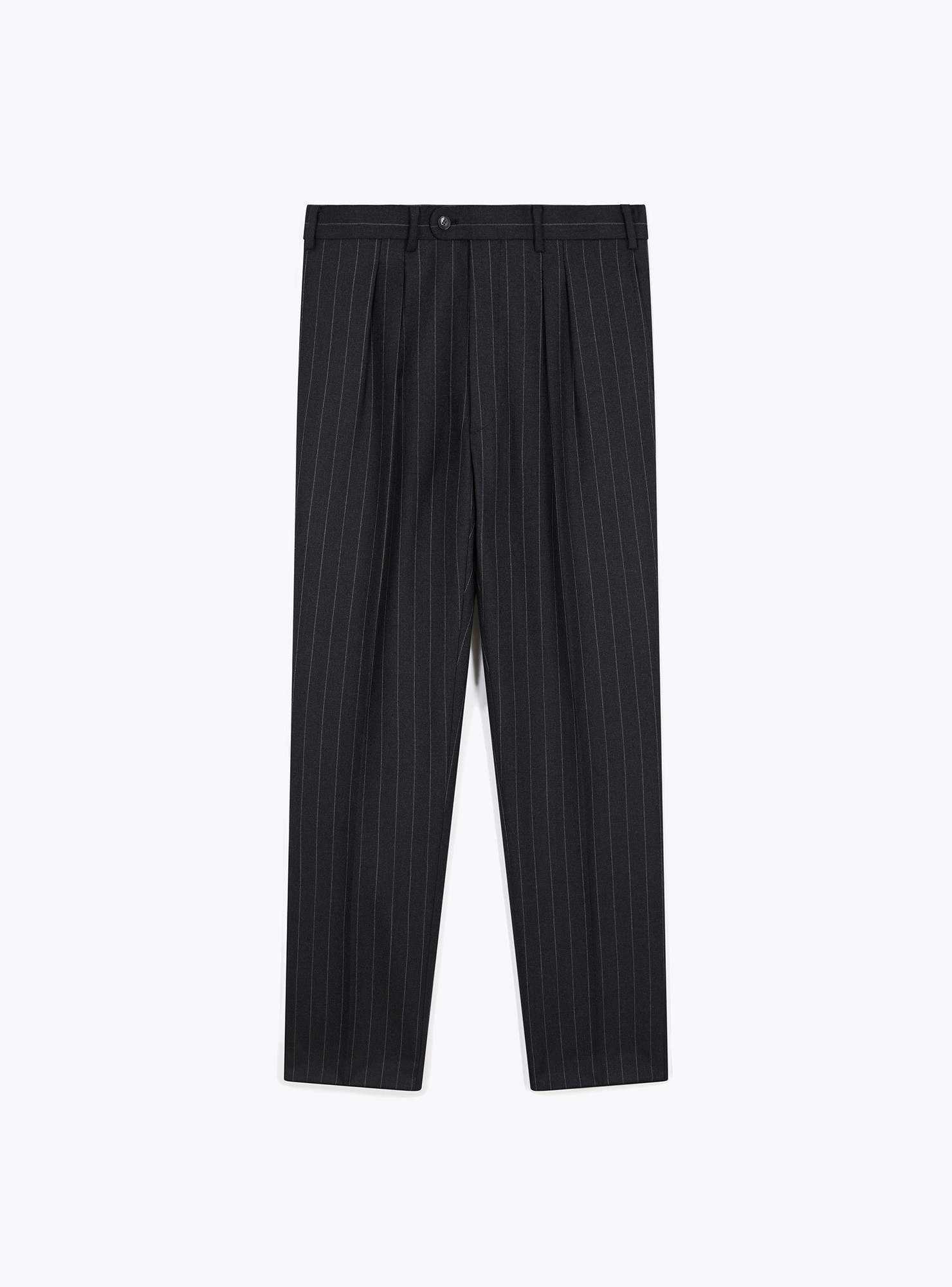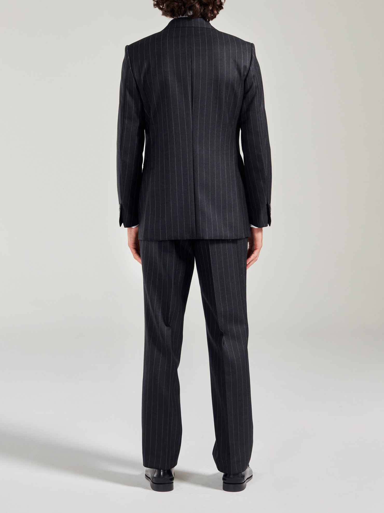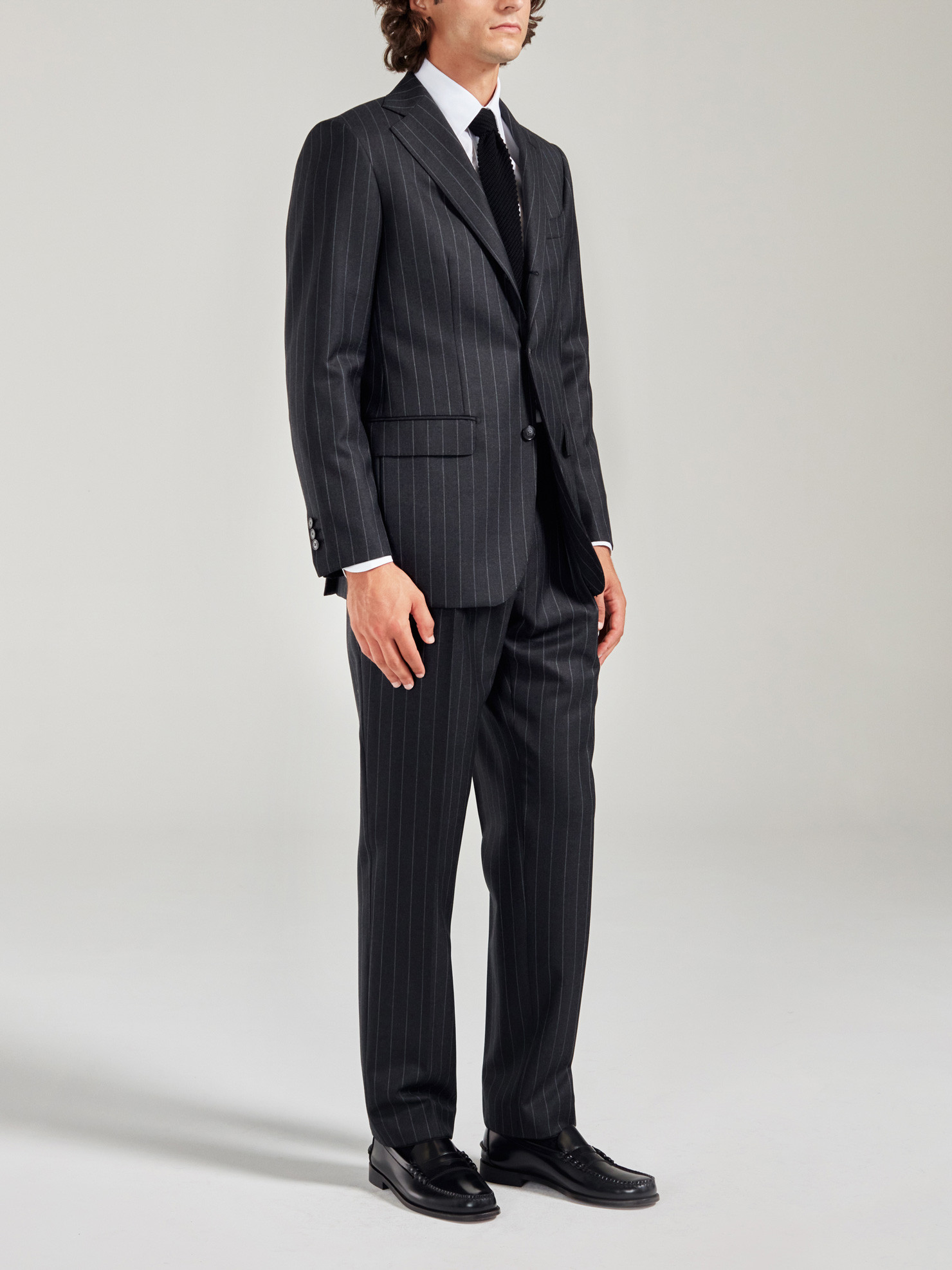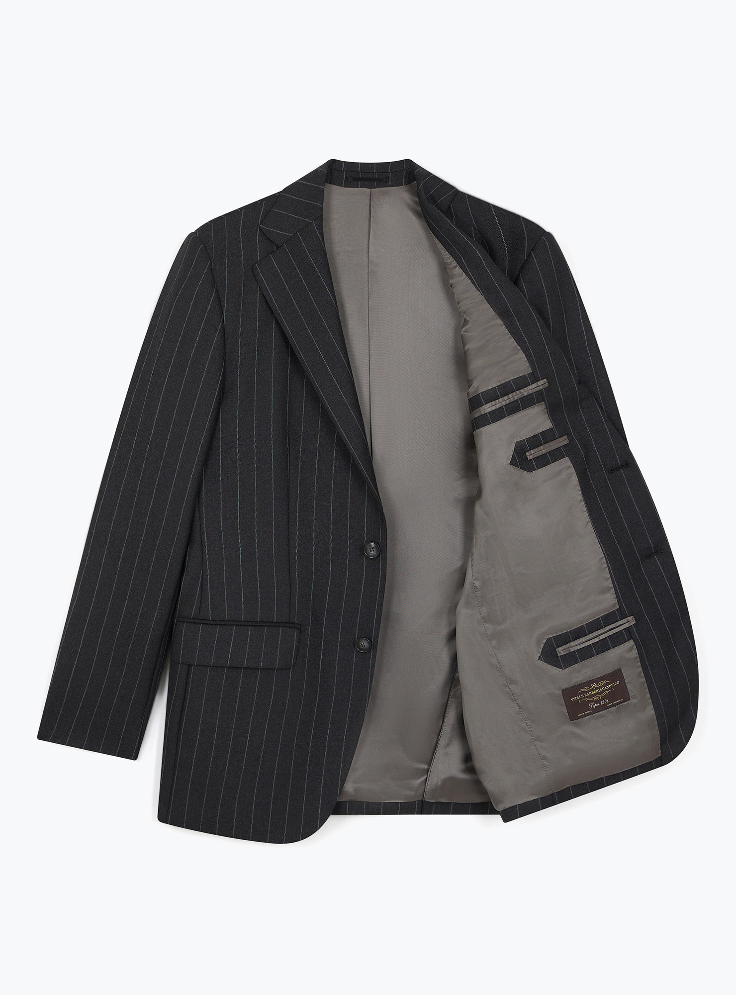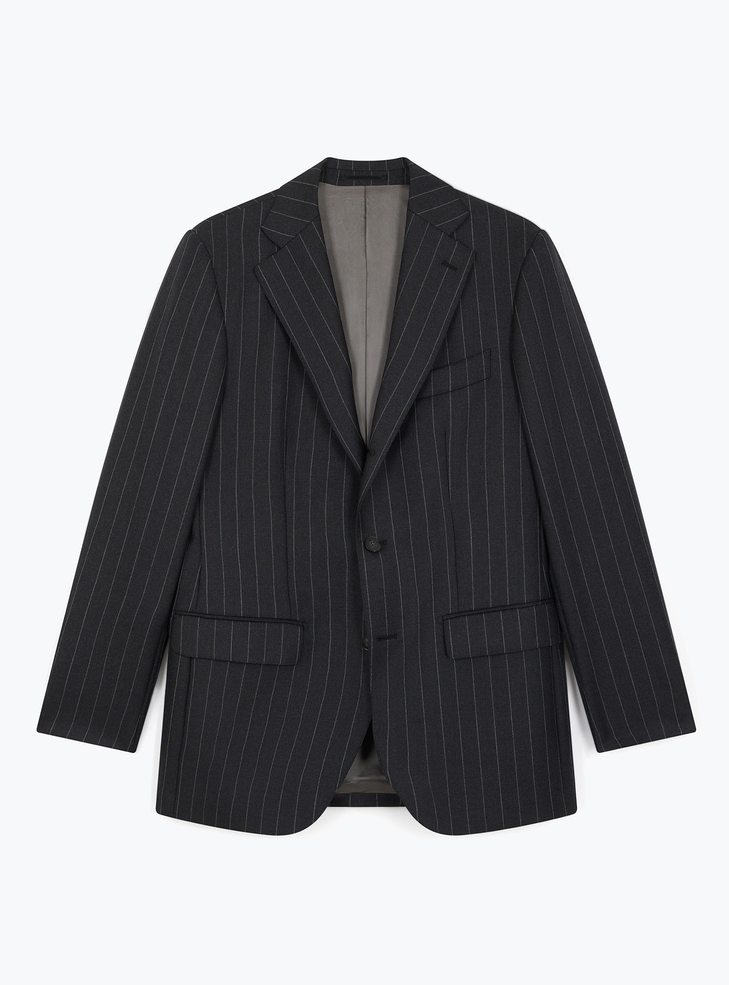Charcoal gray striped 2.5-button straight suit in Vitale Barberis Canonico heavy virgin wool. Traditional fit, shoulders with structured epaulets, side pockets with straight flaps, 2 back slits and full inner lining. Pants with belt loops, 2 inside pleats, single hem.