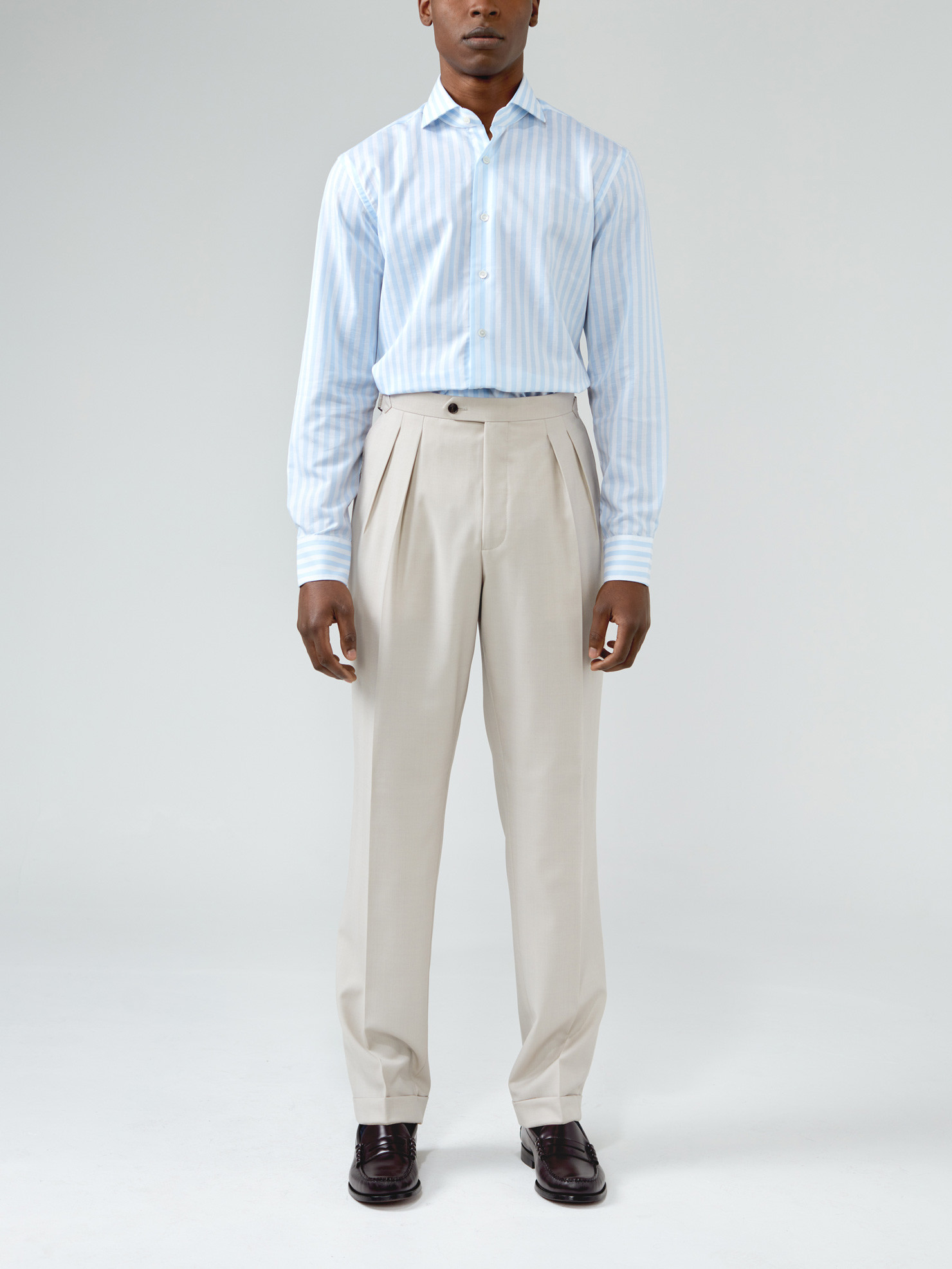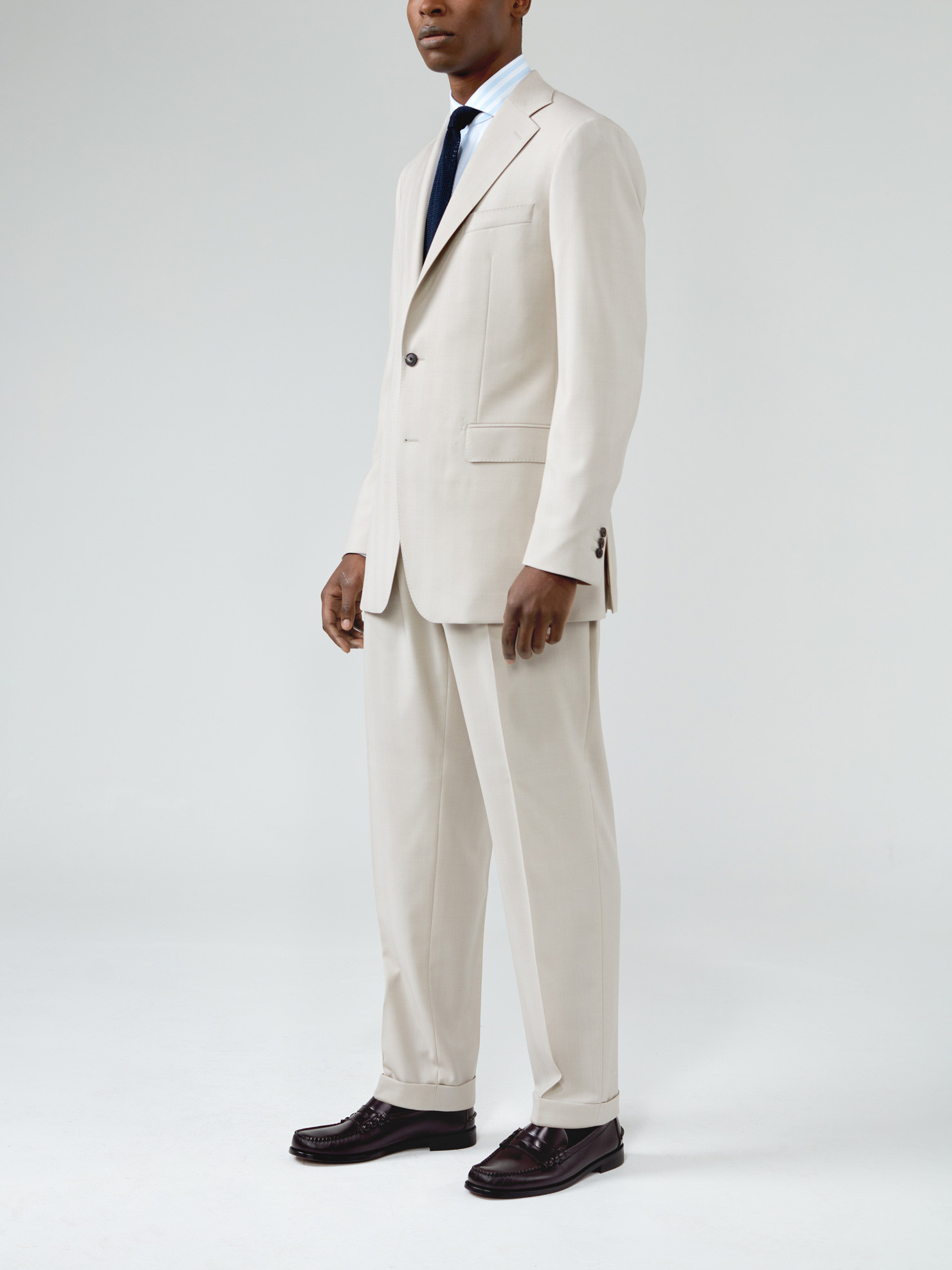 This beige suit is a reinterpretation of this iconic garment. The fabric is a super 130 from Drago, comfortable and lightweight.