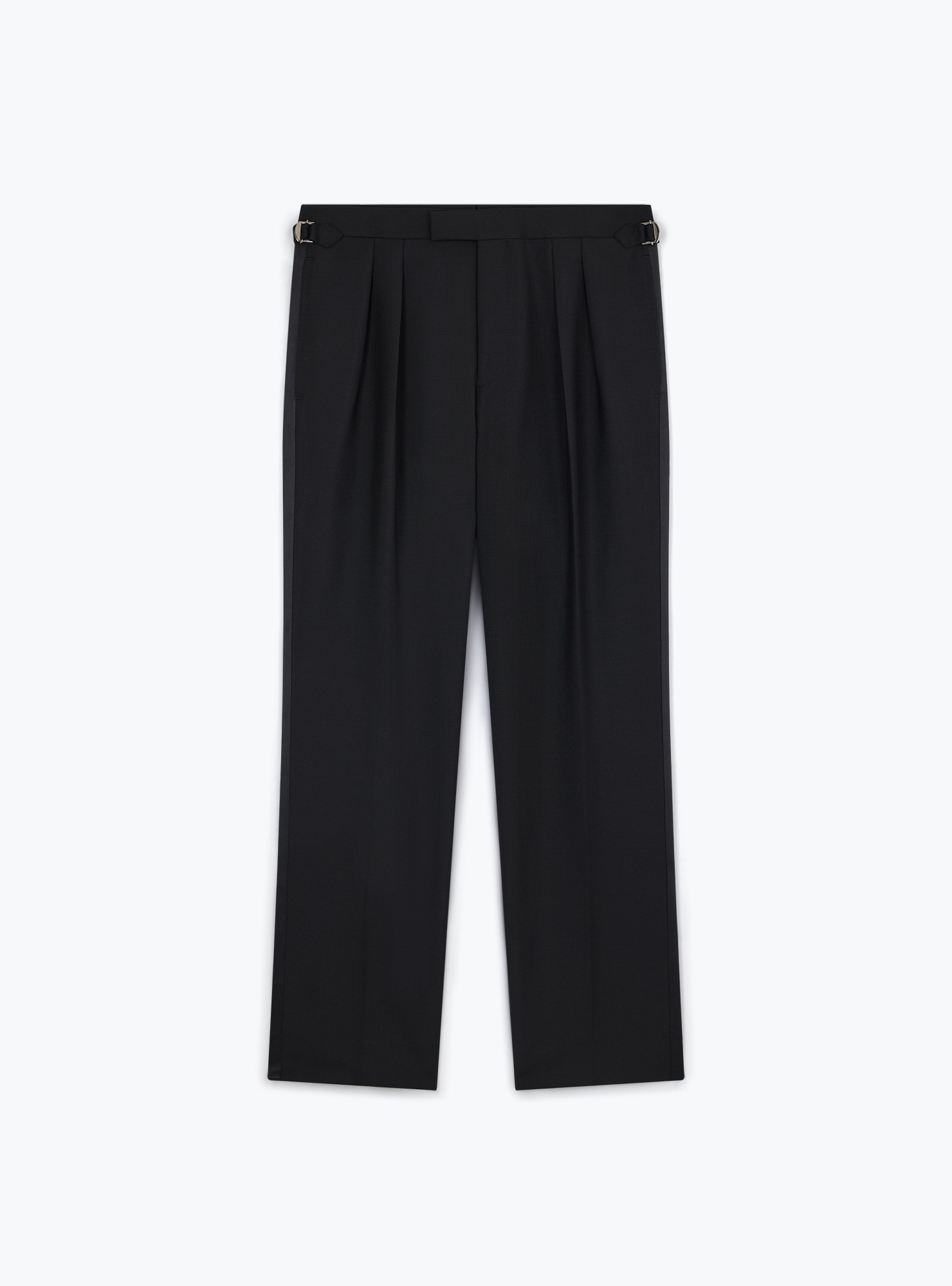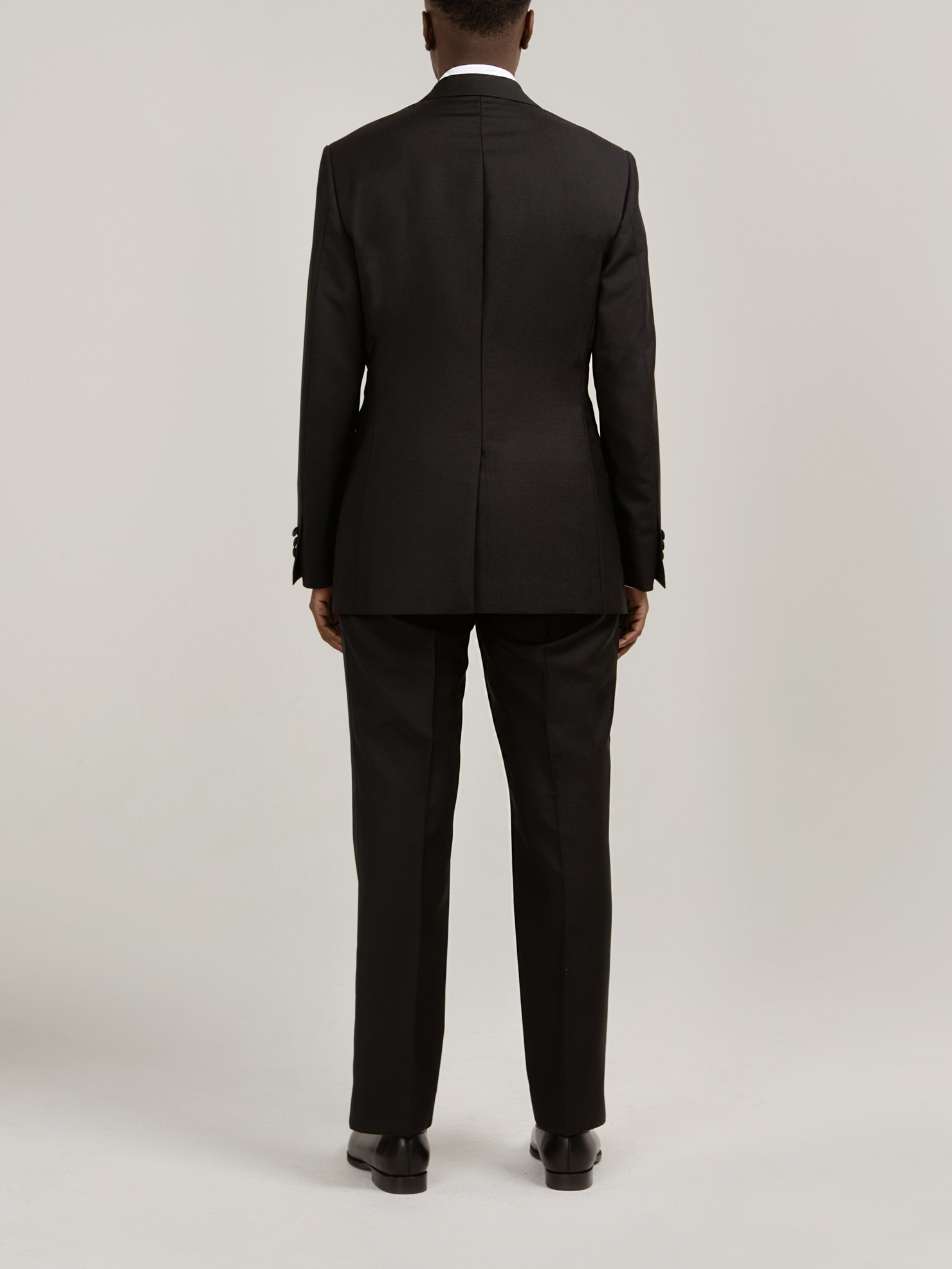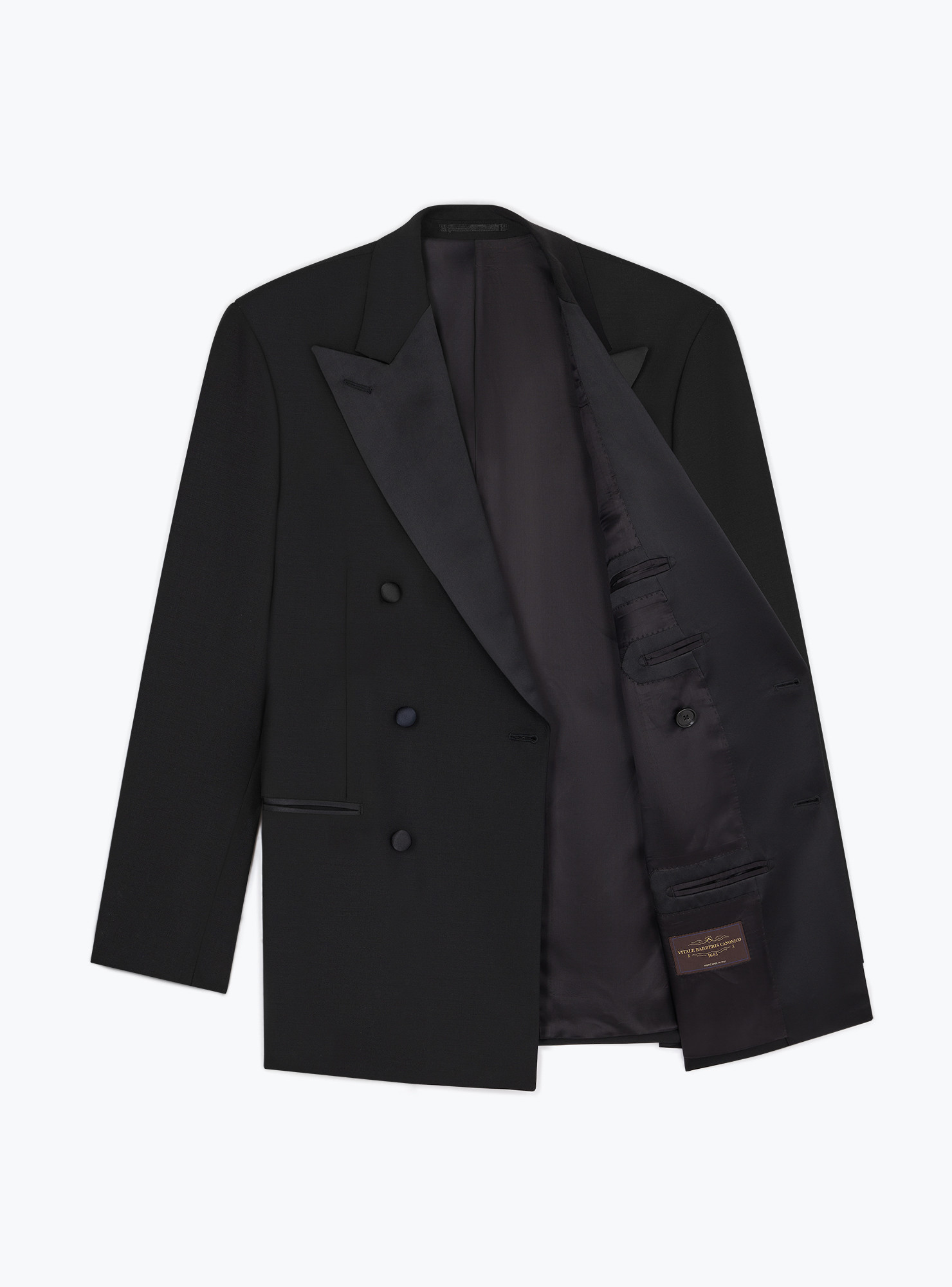 Black Grain de Poudre wool tuxedo - Double-breasted 6 buttons with peak lapel in black satin, classic standard shoulder padding, barchetta breast pocket, satin piped side pockets, 1 back vent - Trousers with belt loops, no pliers, pleats, black satin braid along leg, 2 pockets along seam, 1 buttoned welt pocket on back. Black satin-covered buttons.