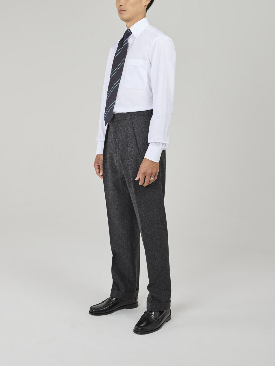 Grey Flannel Trousers with side adjusters, double inward pleats, 4 cm cuffed hem.