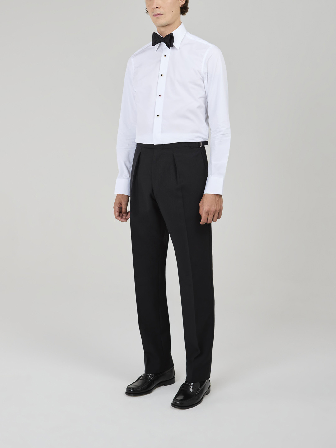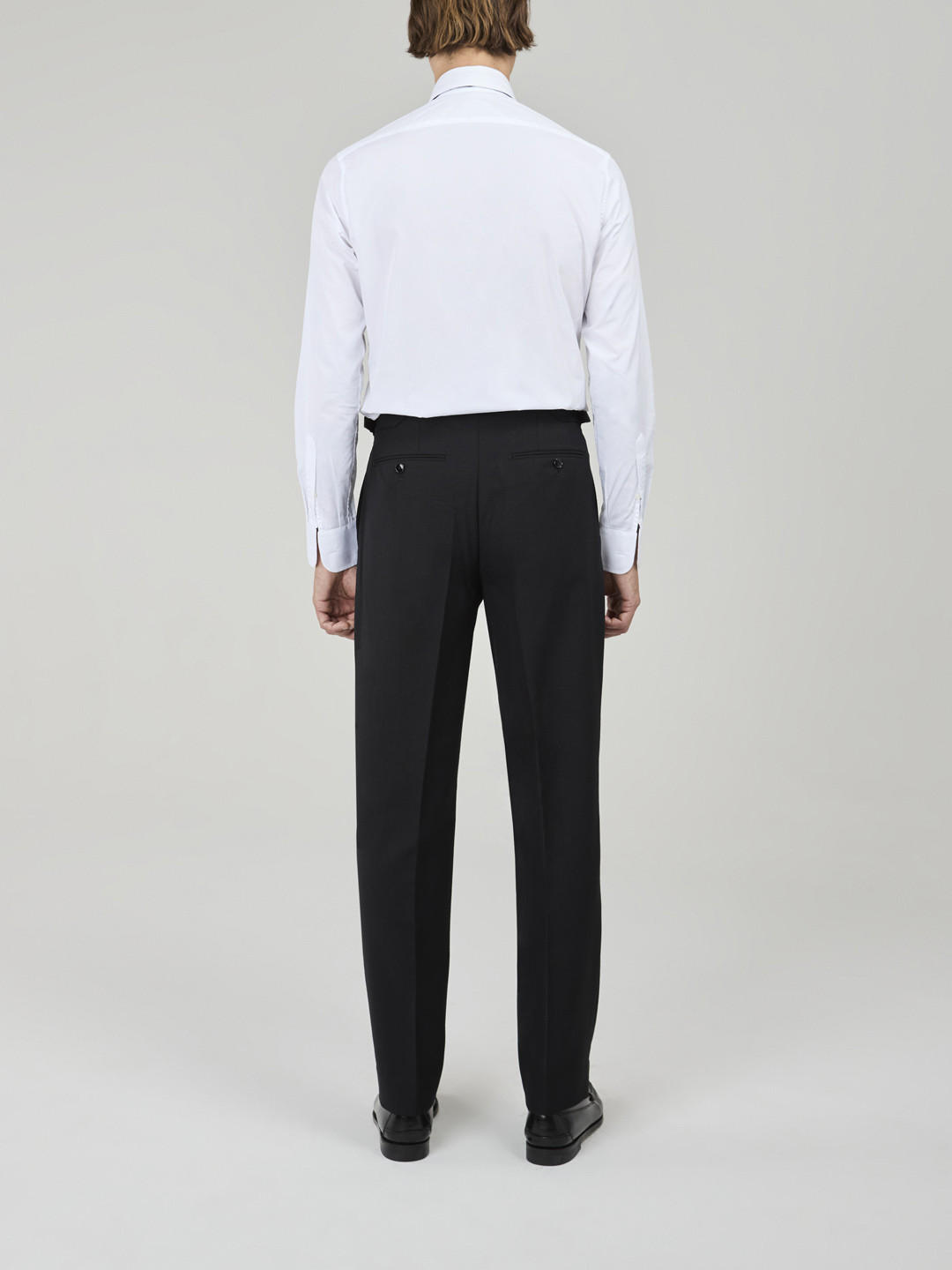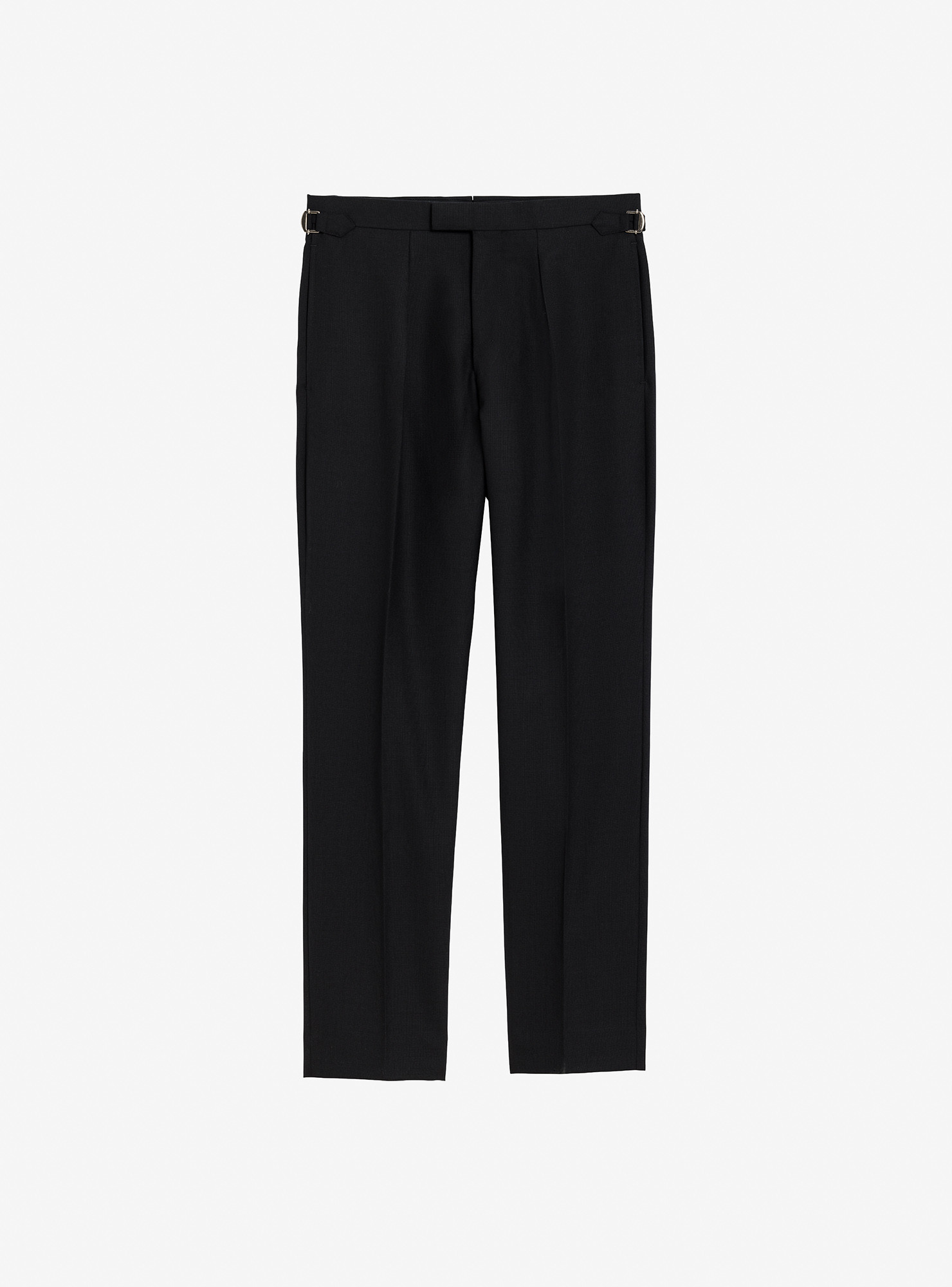 Black Fresco Trousers with side adjusters, single inward pleat, side seam pockets, plain hem without turn-ups.