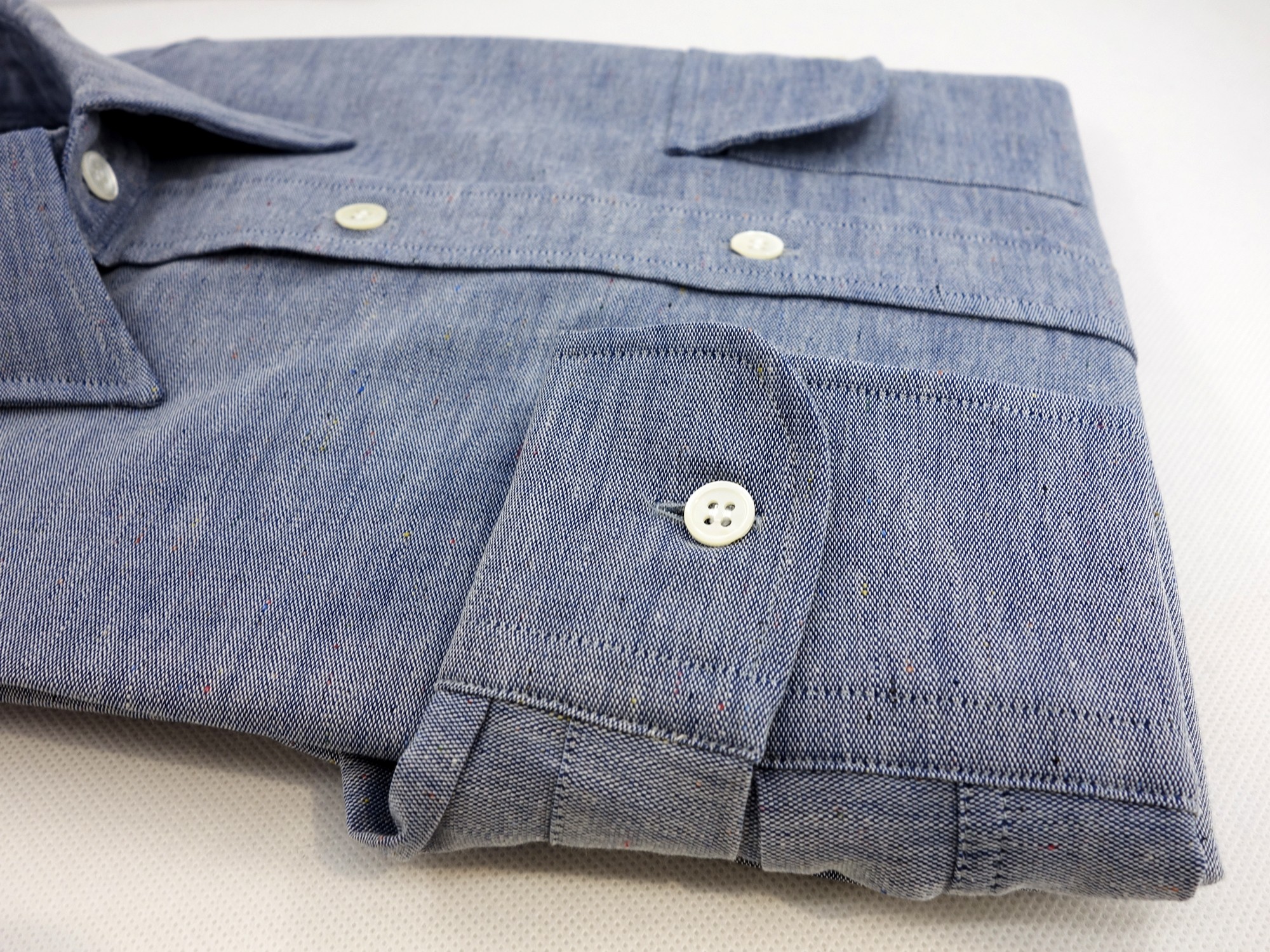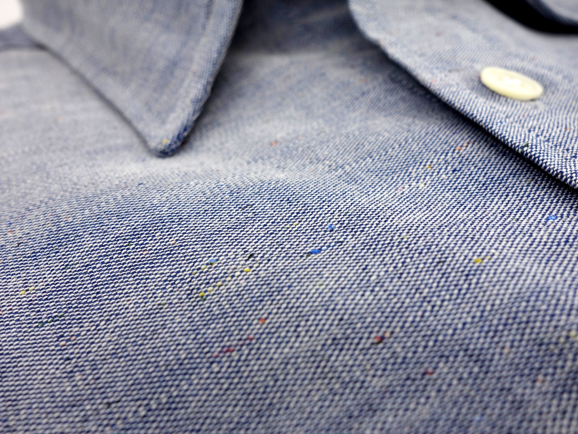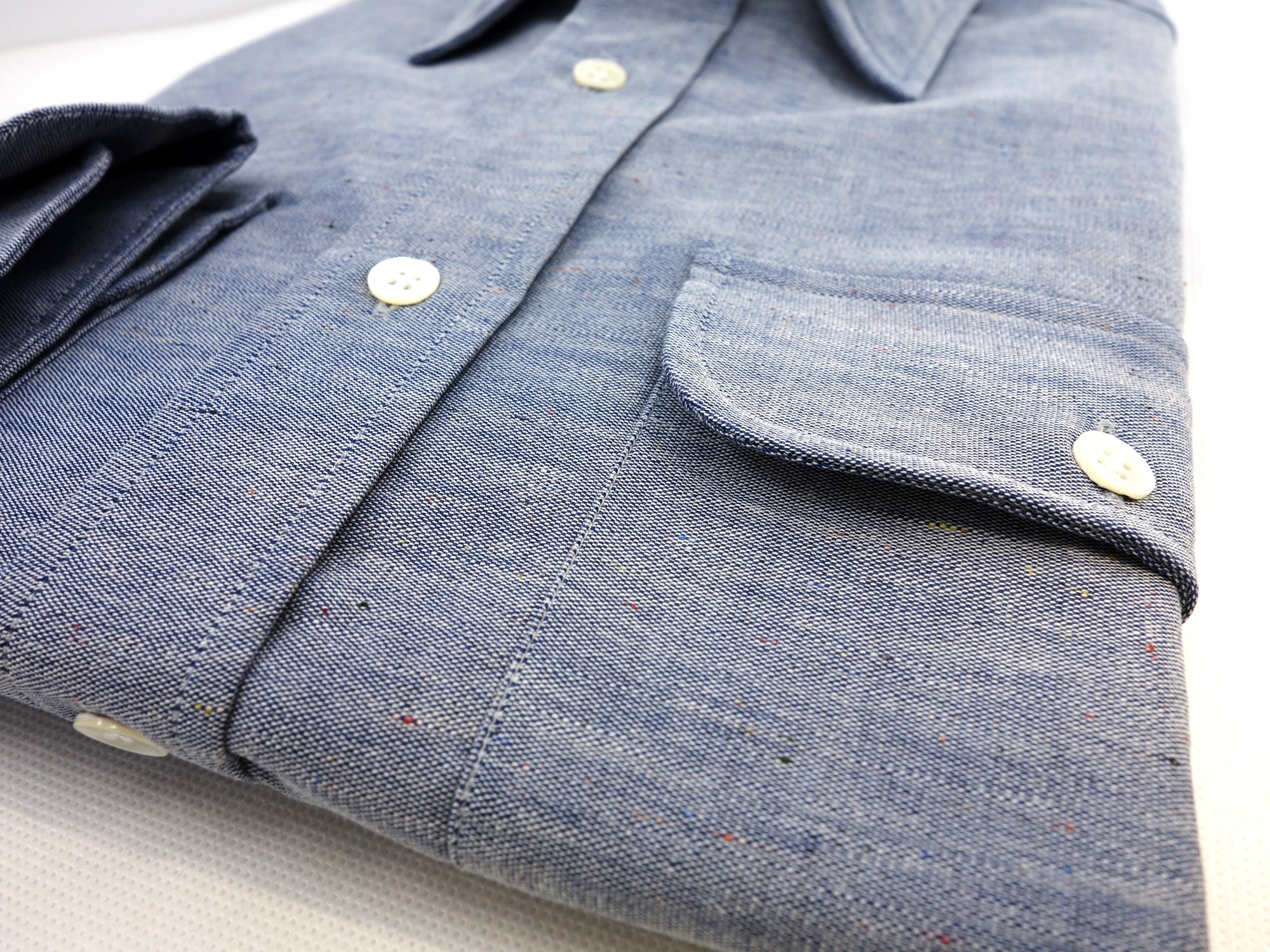 Mottled blue Chambray fabric by Albini with a few, select colourful threads in the weave. You can imagine workers building American skyscrapers wearing shirts like this - a real workman's shirt that feels like it will last forever with a wonderful patina over time.