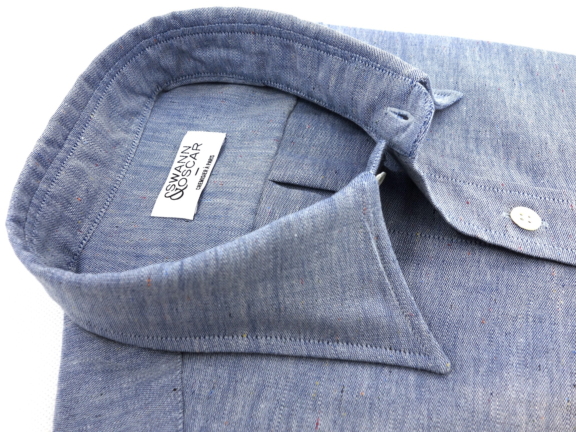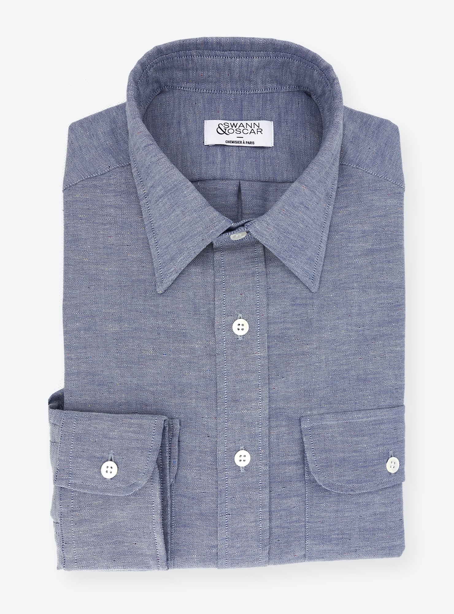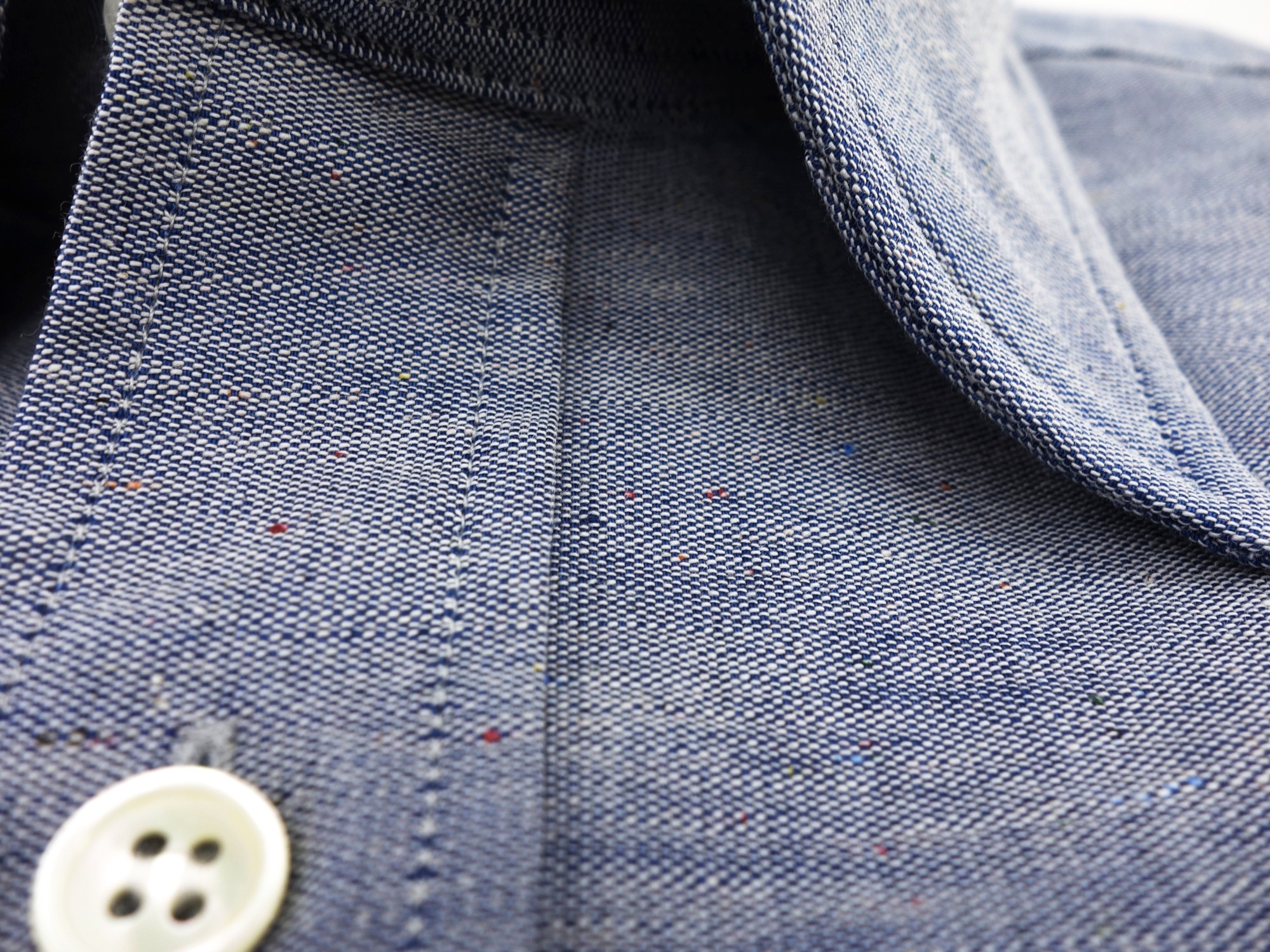 Mottled blue Chambray fabric by Albini with a few, select colourful threads in the weave. You can imagine workers building American skyscrapers wearing shirts like this - a real workman's shirt that feels like it will last forever with a wonderful patina over time.