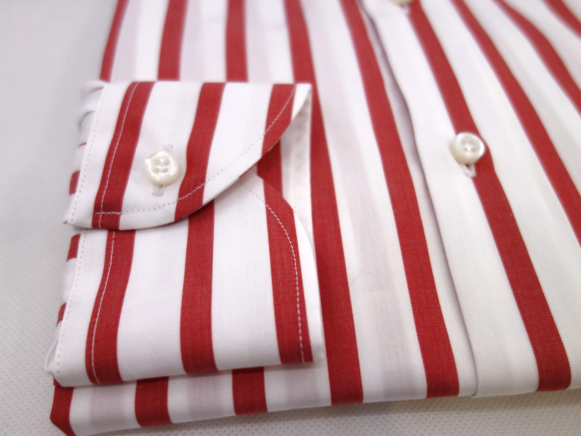 Two ply poplin by Thomas Mason with wide red stripes. Wide stripes are making a comeback and this is a great choice for anyone looking for a sporty poplin shirt.