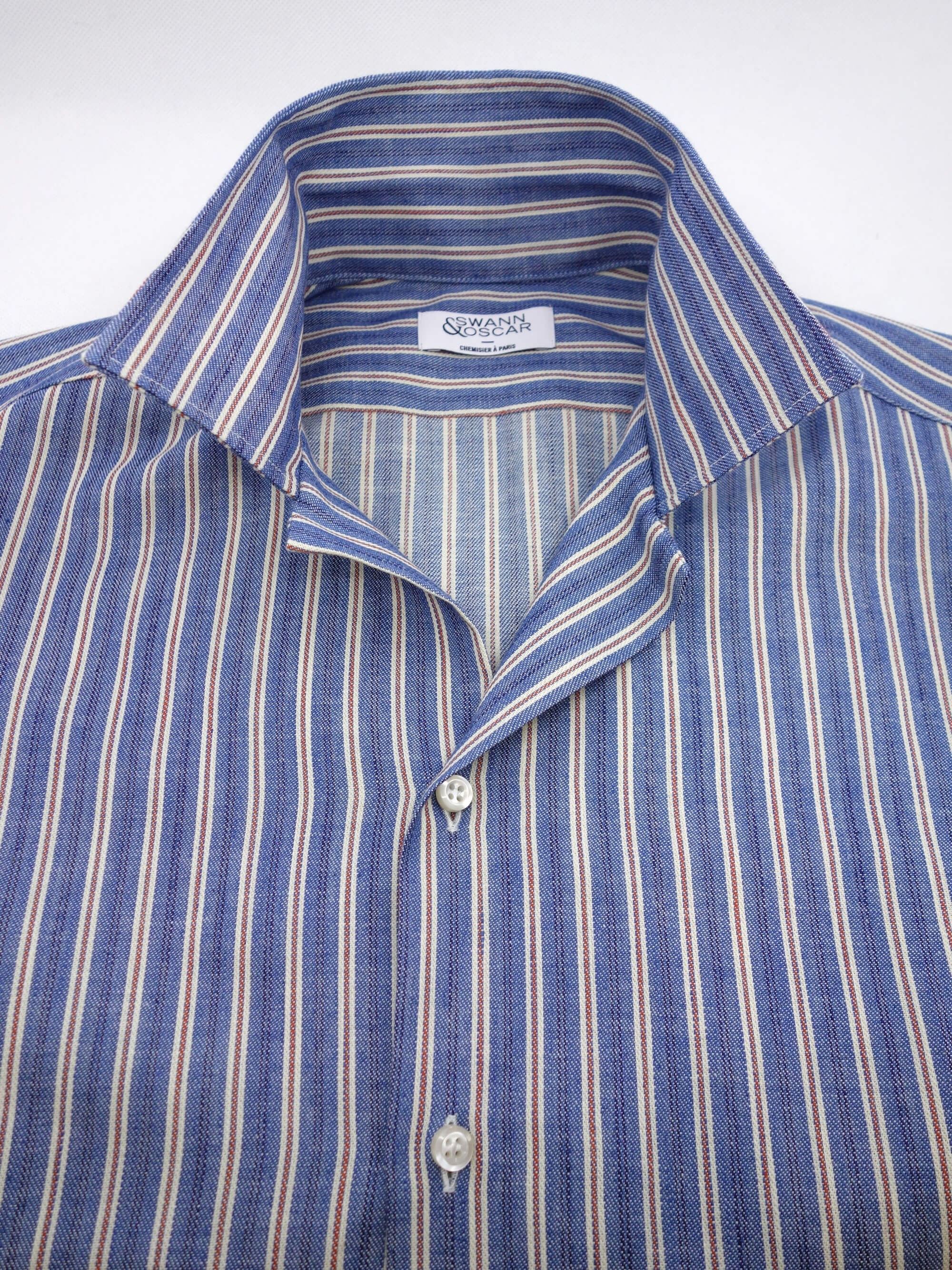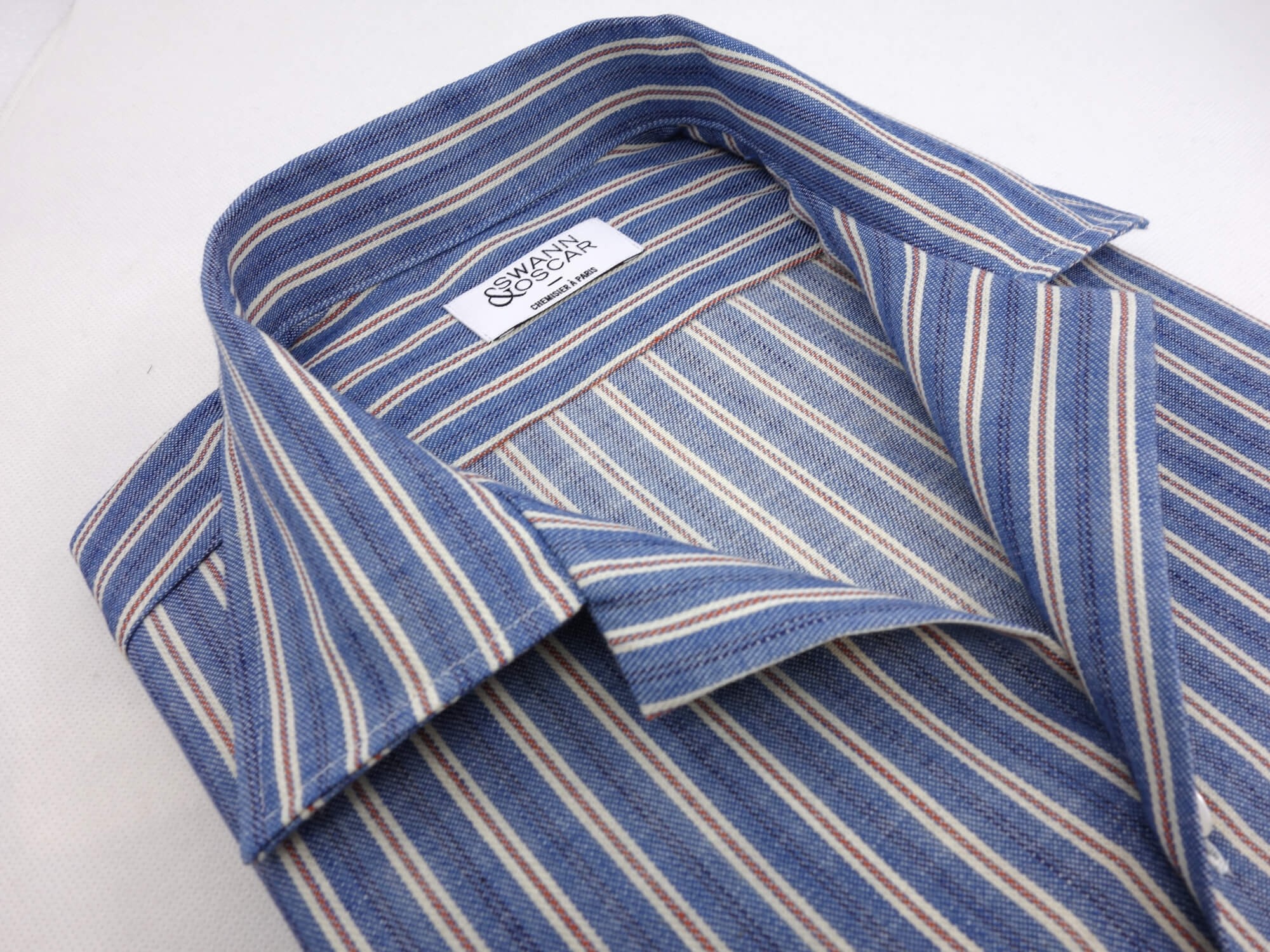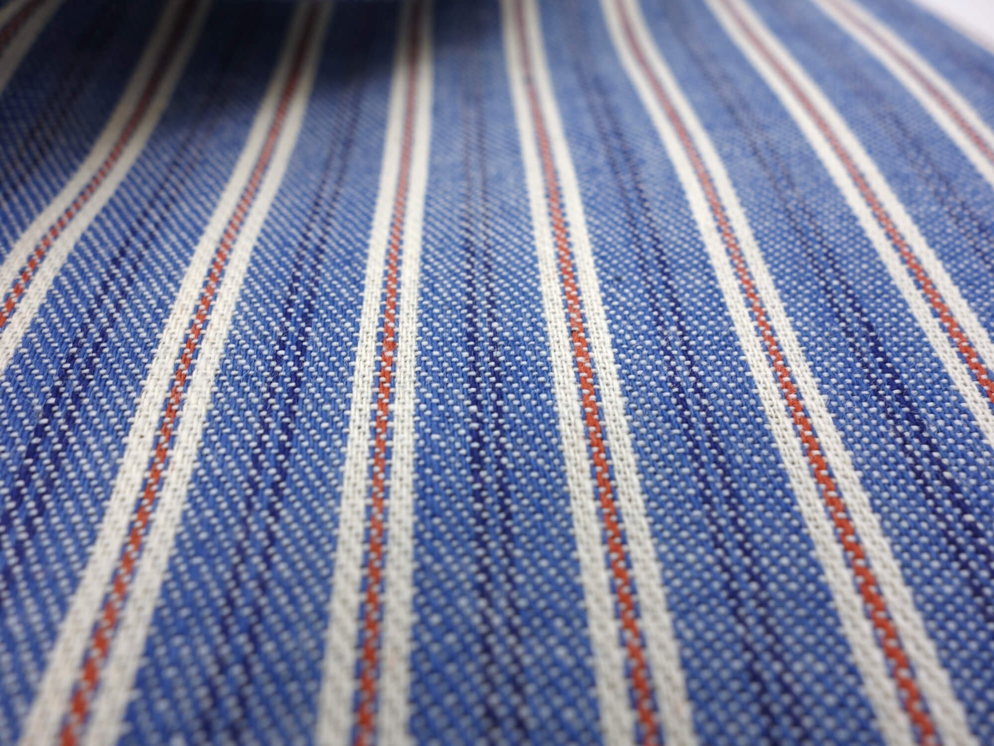 Blue and red striped Denim by Abiate. This sporty fabric is inspired by casual fabrics made in Japan and workwear clothing. The rustic finish gives your shirt a pre-worn, vintage look. This ultra-tough fabric is ideal for a weakened shirt.