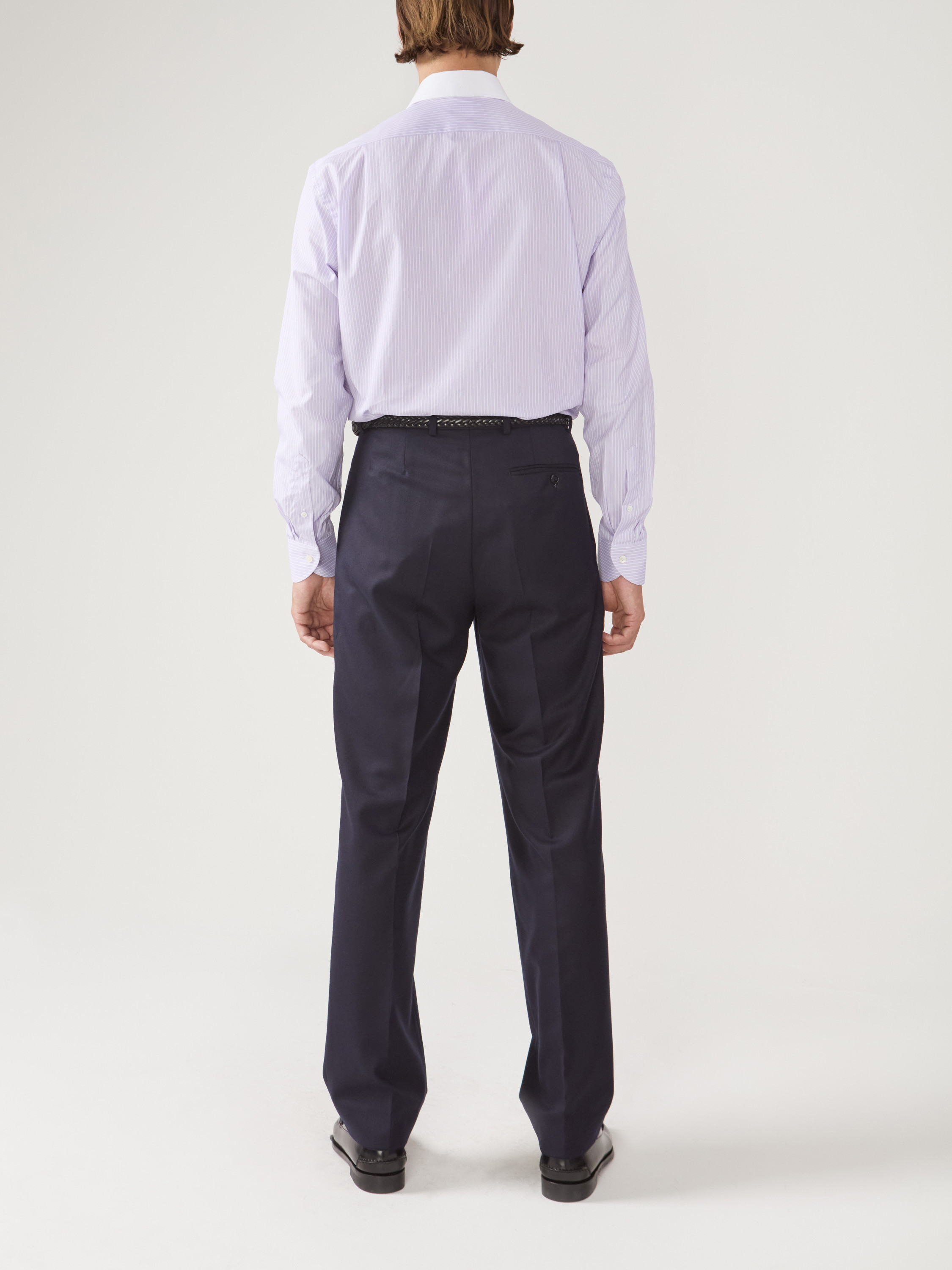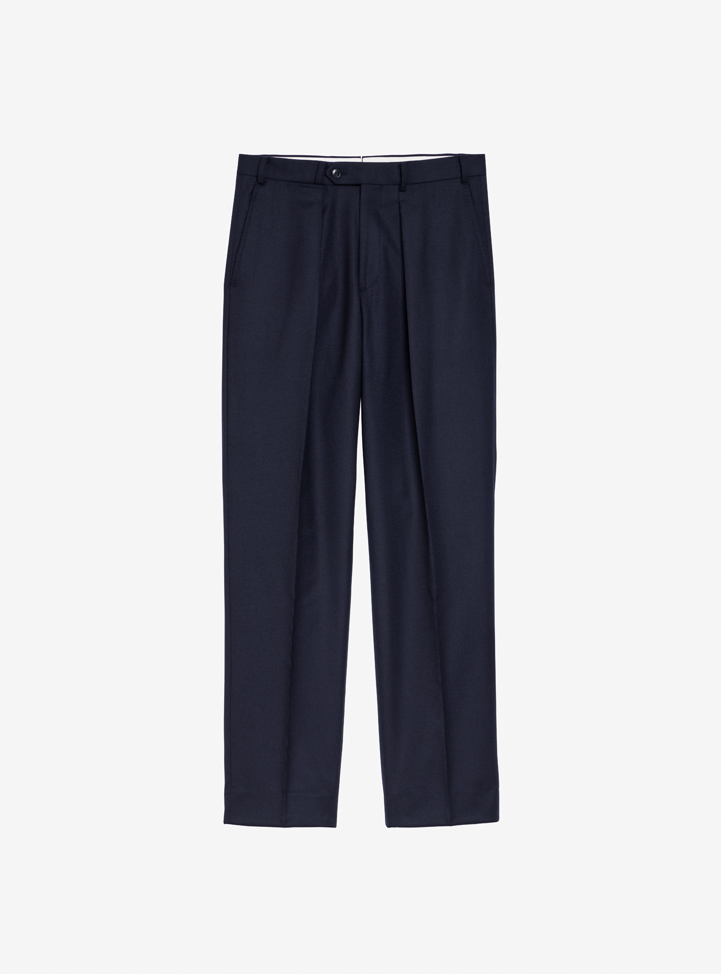 Navy Flannel Pants, waistband with belt loops, 1 deep inside pleat, single bottom without turn-up.