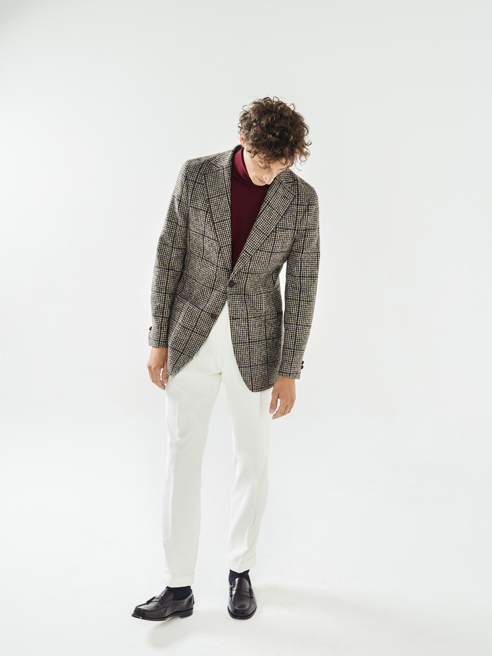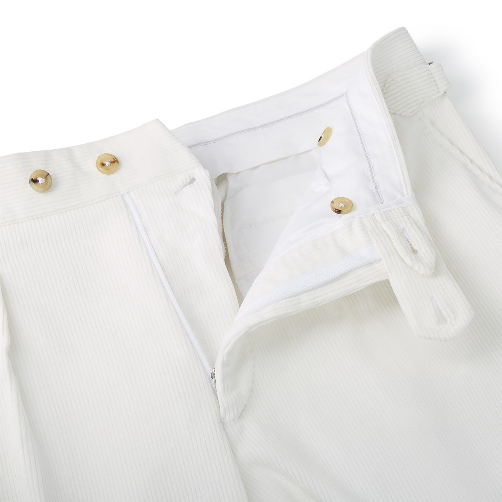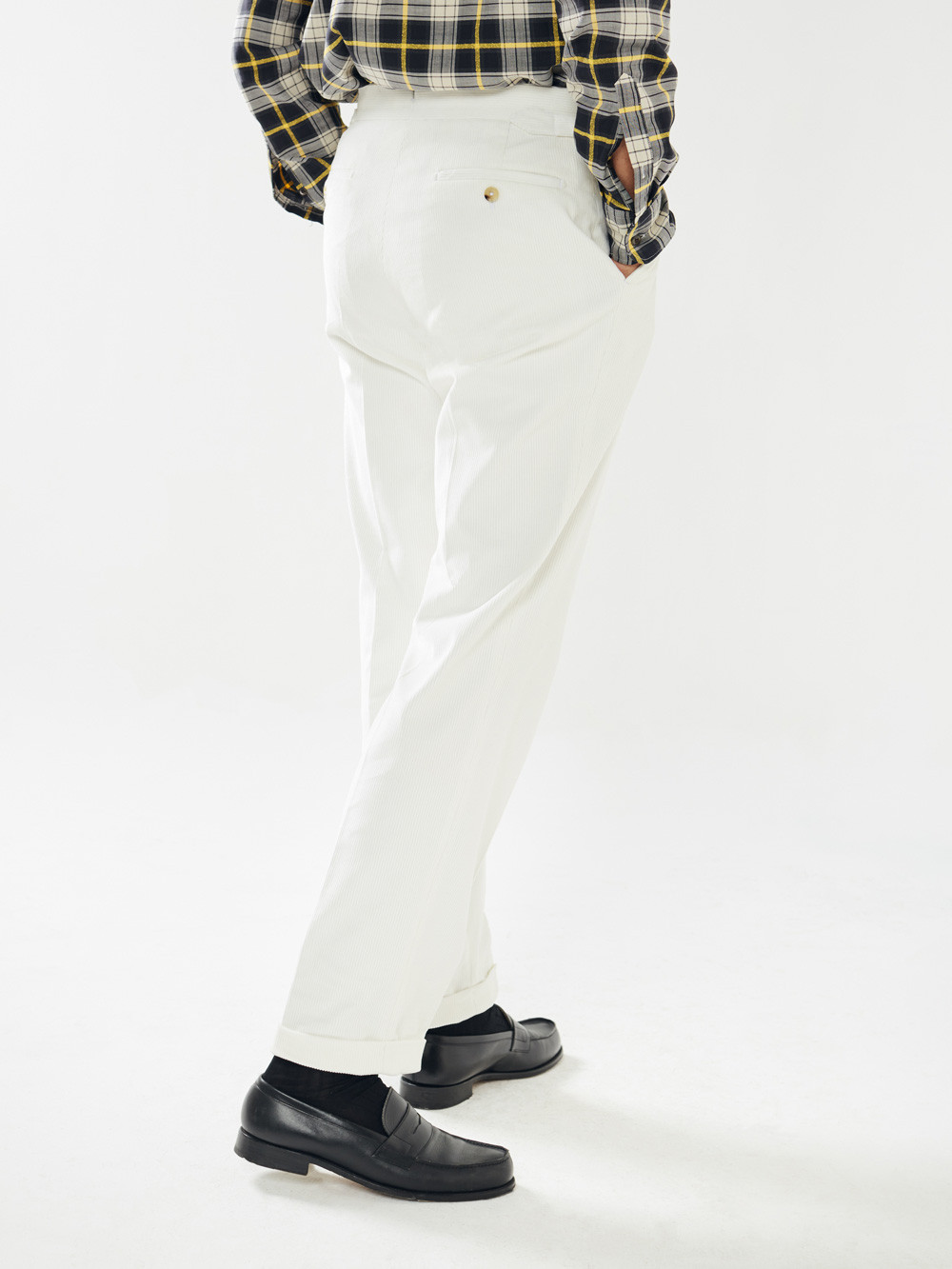White velvet pants, marked crease at the leg, one pleat, and after dinner split. English fabric with big ribs with a very good hold. The velvet allows you to be both chic and casual. It can be worn with a sports jacket, a shirt or a turtleneck. The pants are delivered with a lapel at the chosen length (3 sizes to choose from). If you want unfinished pants or a hem rather than a lapel, you send us an email after your order and we will take care of it!