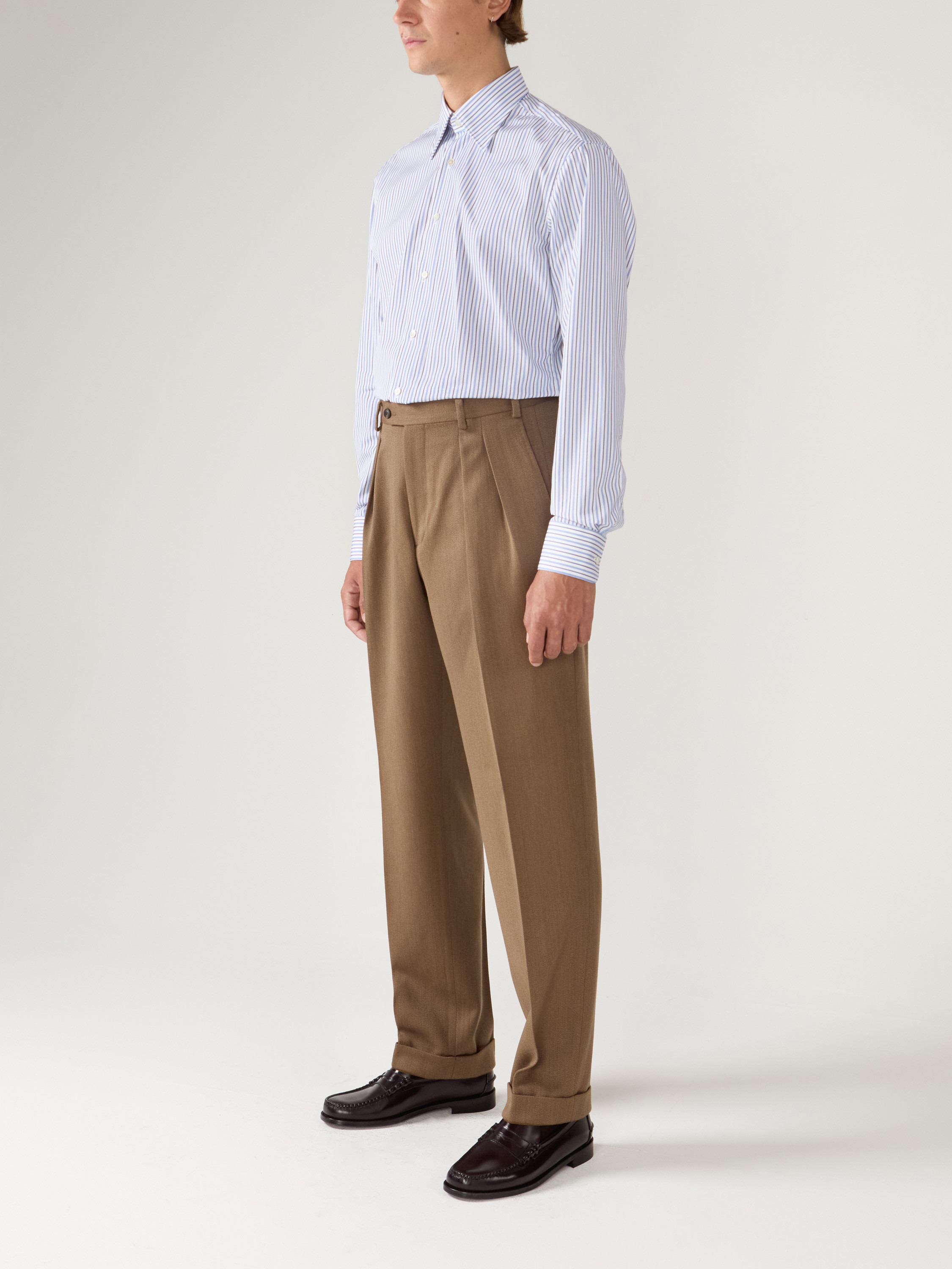 Beige Whipcord pants with belt loops, two inside pleats, 4cm turn-up hem.