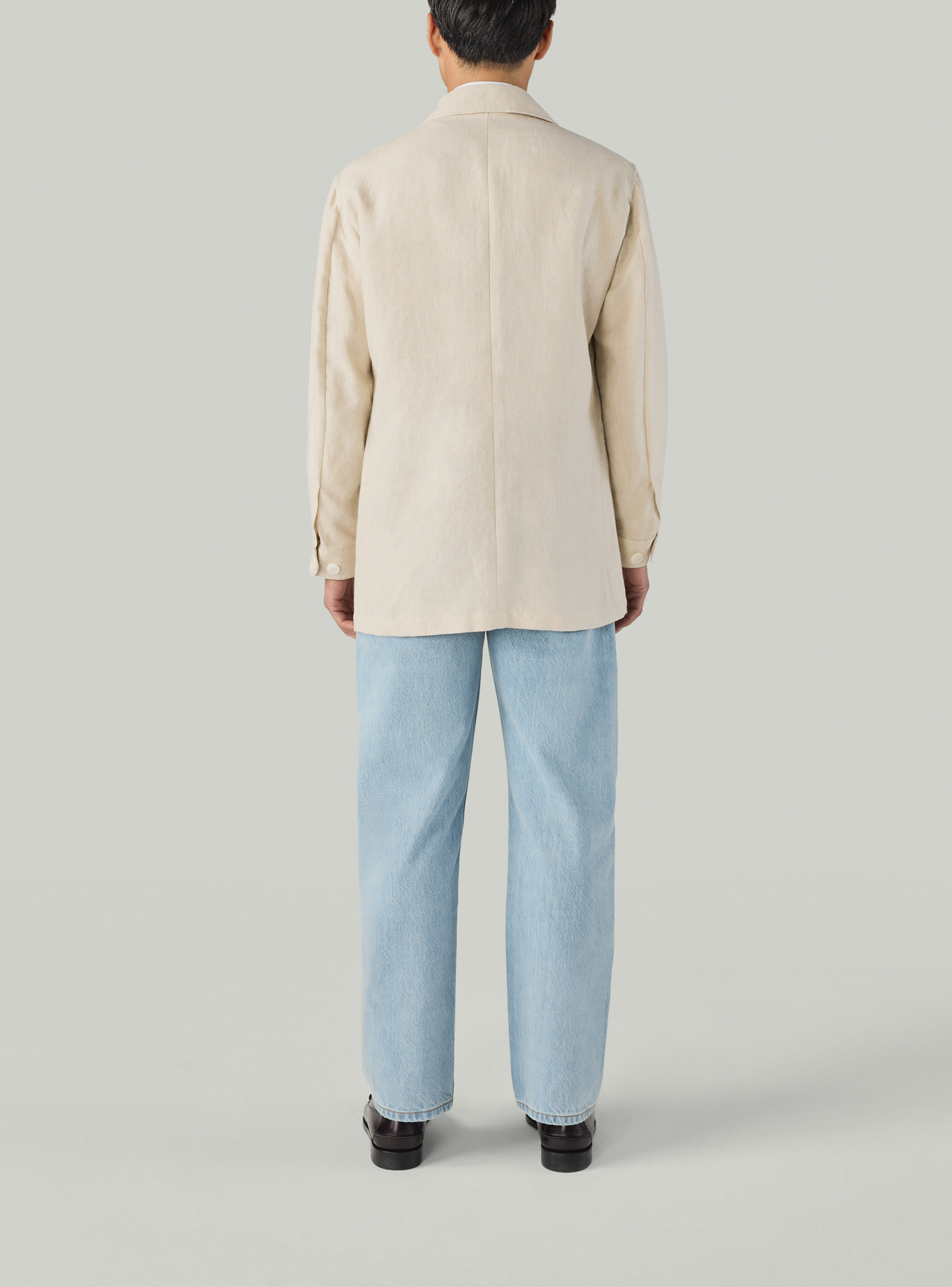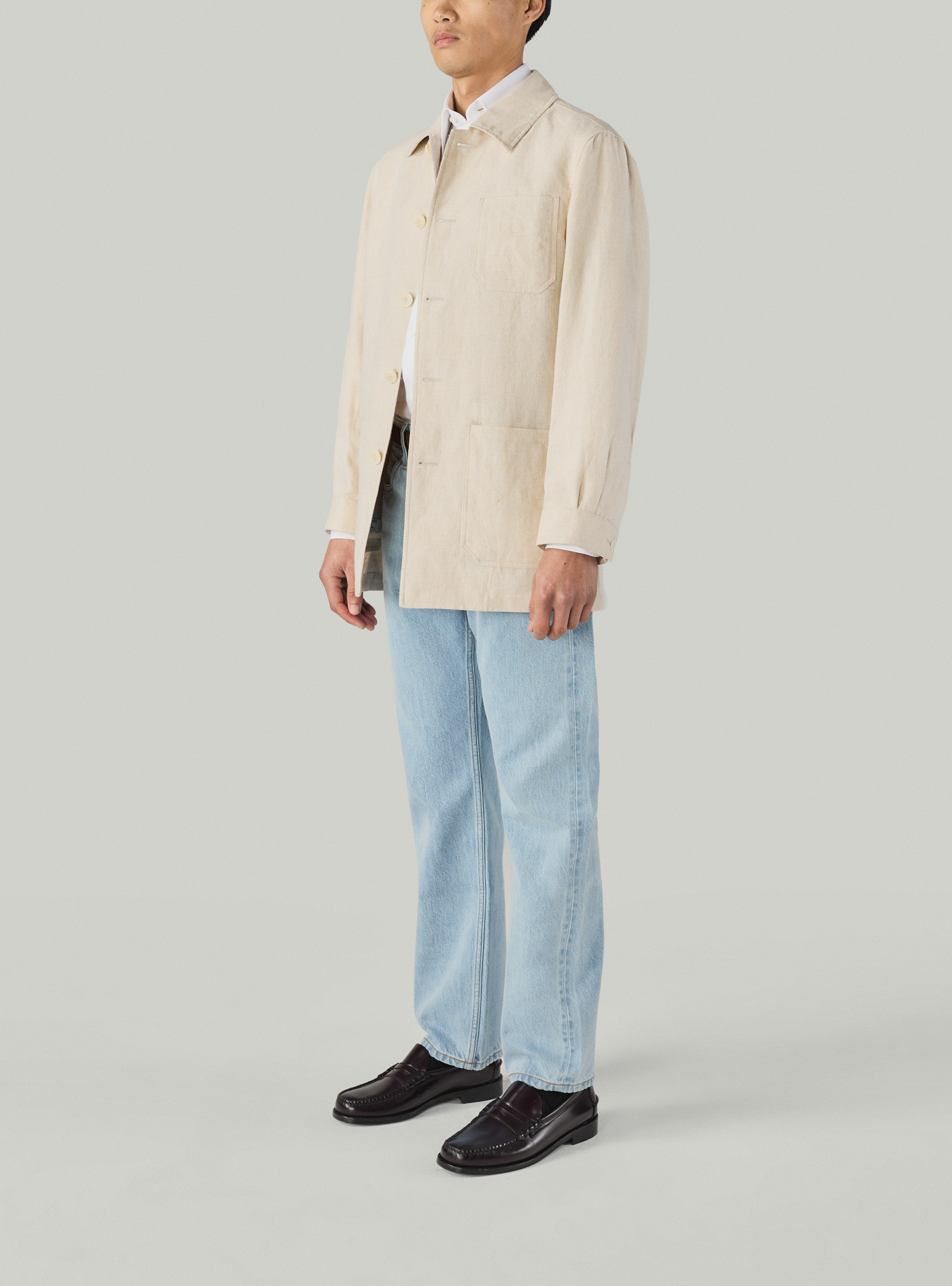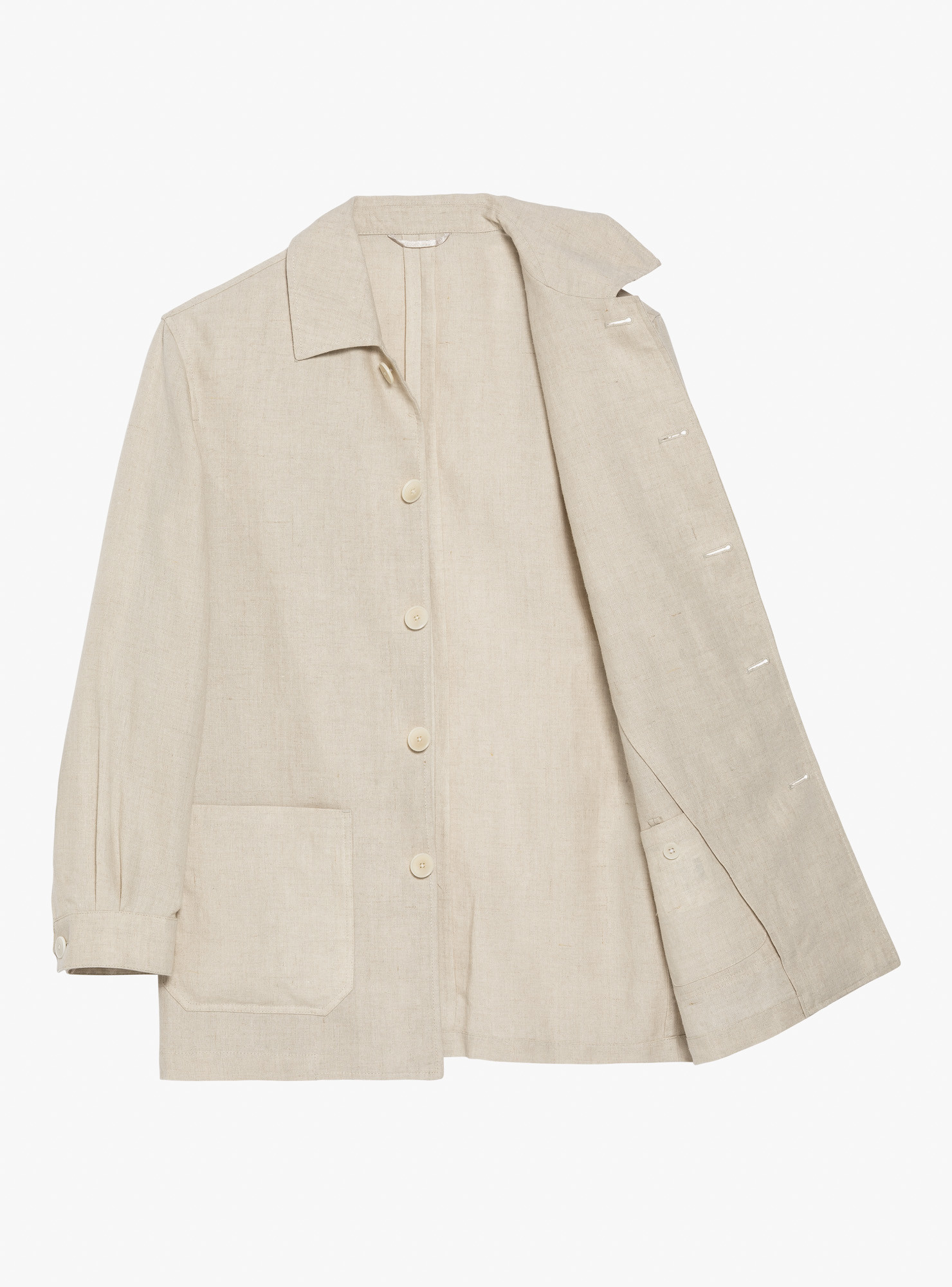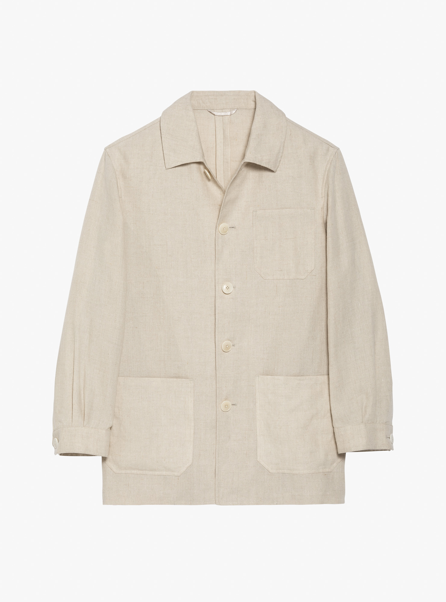 Beige Linen Work Jacket, crafted with a shirt collar and five-button front, complemented by a patch chest pocket and patch hip pockets. Sleeves with two pleats and buttoned cuffs, offering a relaxed yet structured silhouette.