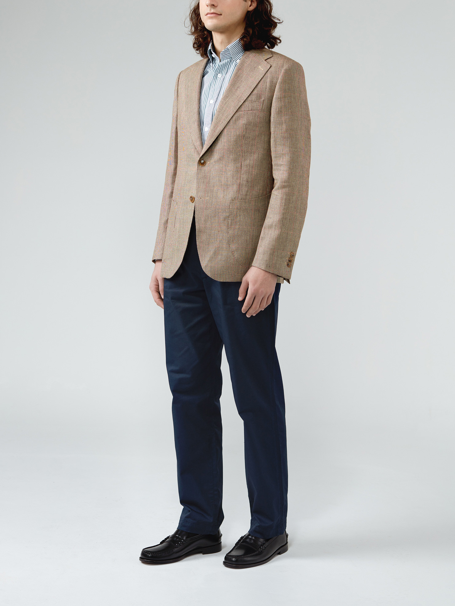 Wool and linen jacket with brown and beige Gun Club pattern, classic notch lapel, flap side pockets, two back slits, traditional napolitan shoulder, horn buttons.