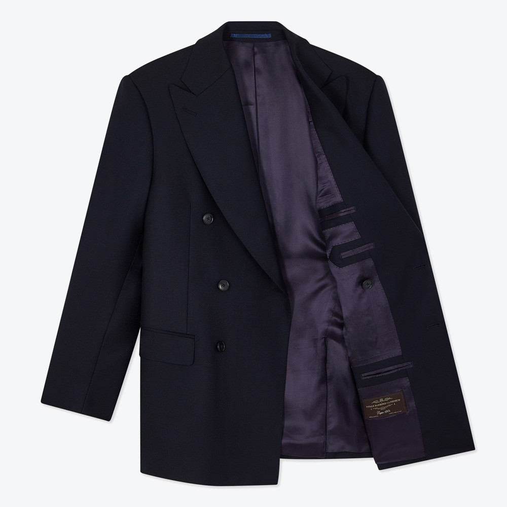 Navy Double-breasted Jacket - Six-button double-breasted jacket, wide notch lapel, classic shoulder padding, barchetta chest pocket, two straight flap pockets, two back slits