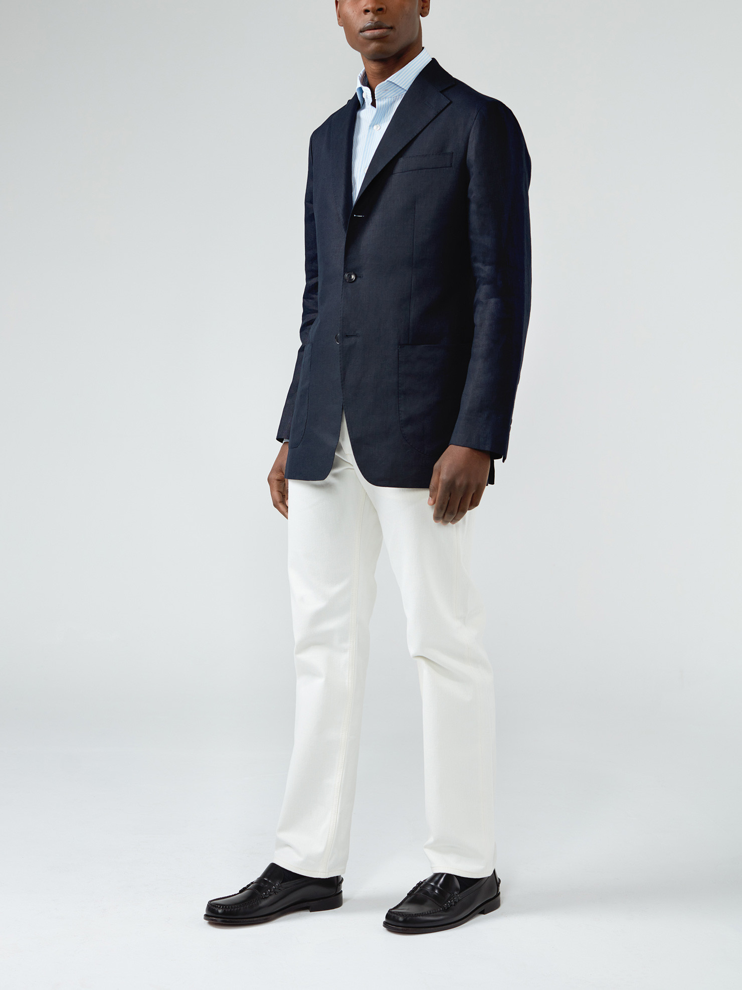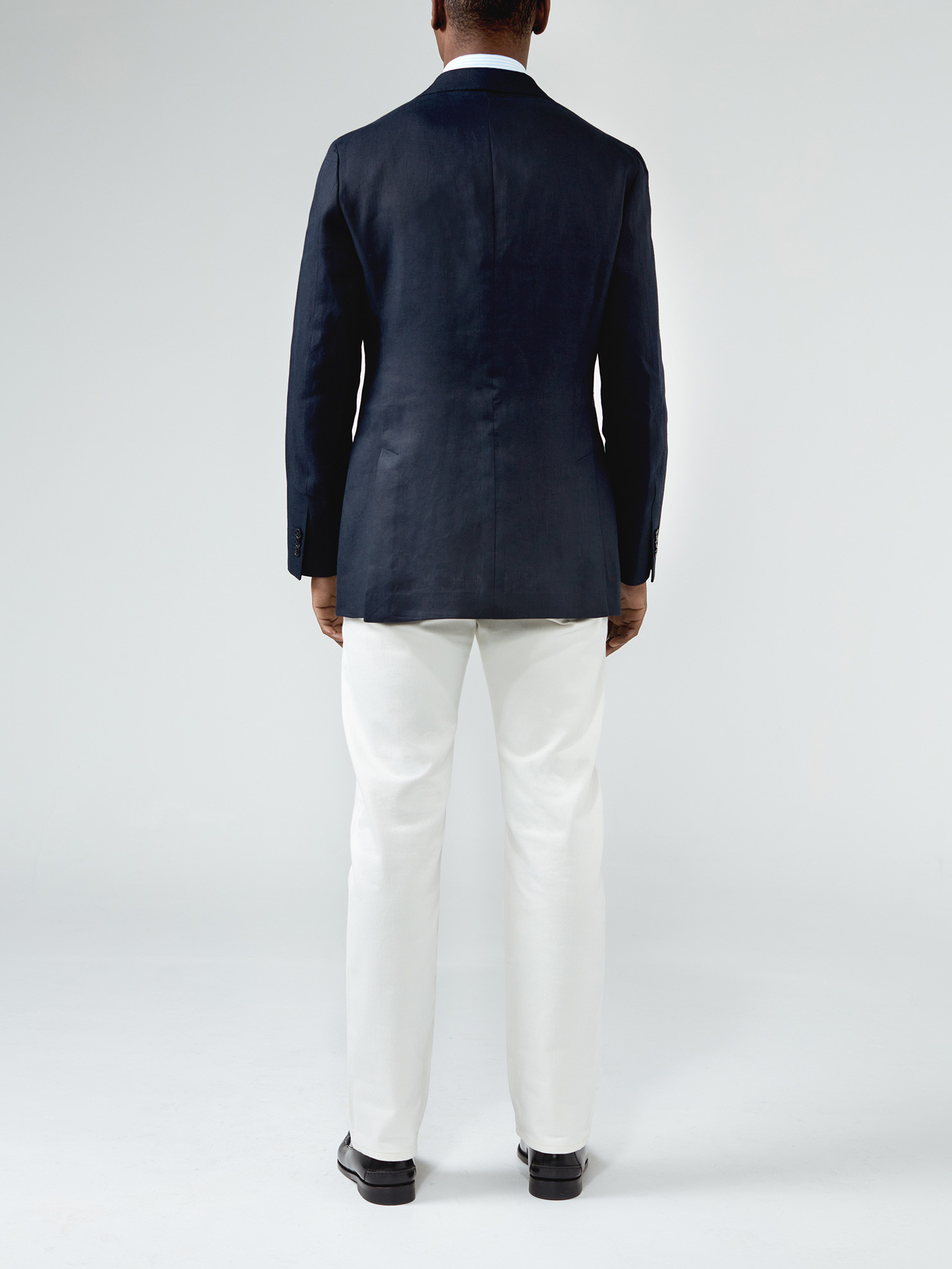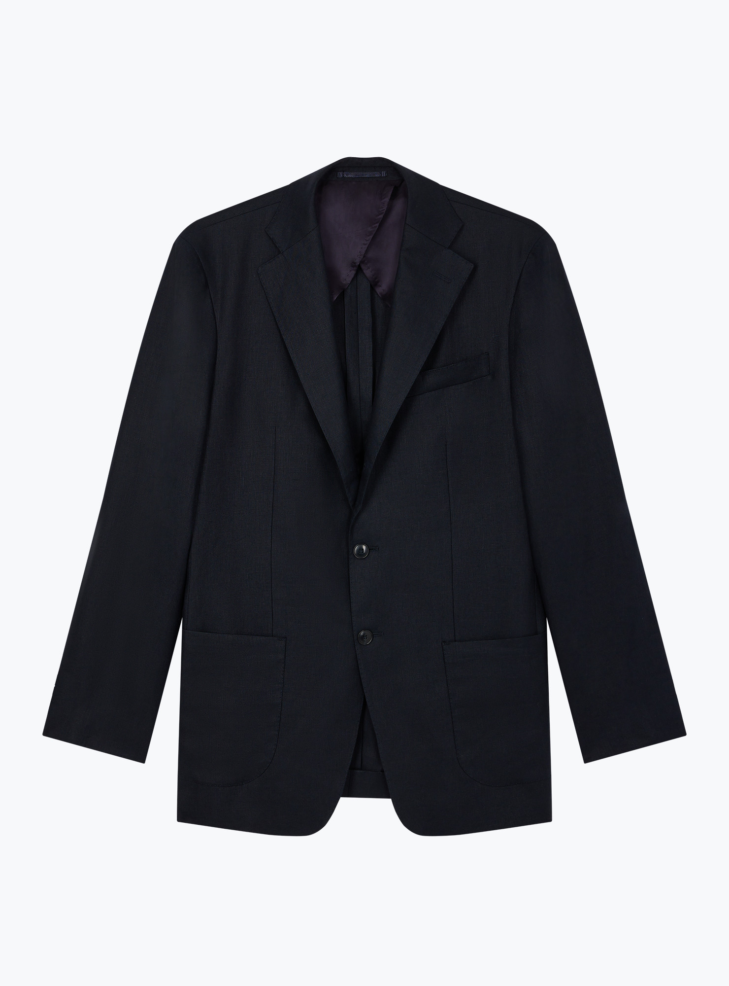 Navy Irish linen jacket, unconstructed, semi-lined, 2.5 button closure, unconstructed shoulders, classic chest pocket, straight patch side pockets, two back slits.