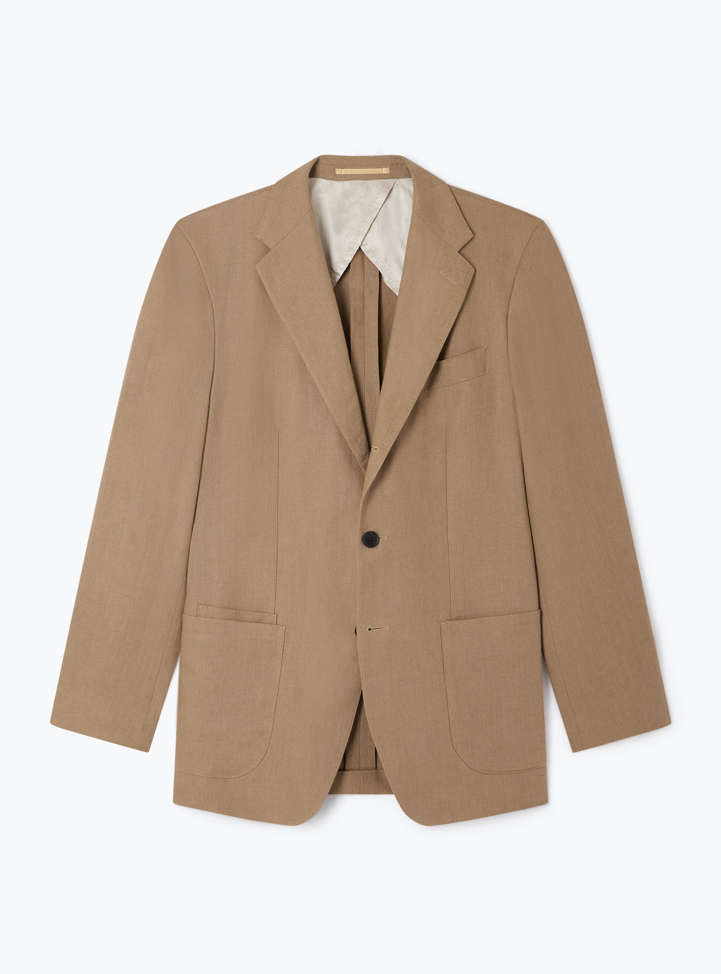 2.5 buttons with notch lapel straight jacket in taupe linen. Unconstructed make, unconstructed shoulders, patch side pockets with double patch pocket on right, 2 back vents, half-lined inner lining.
