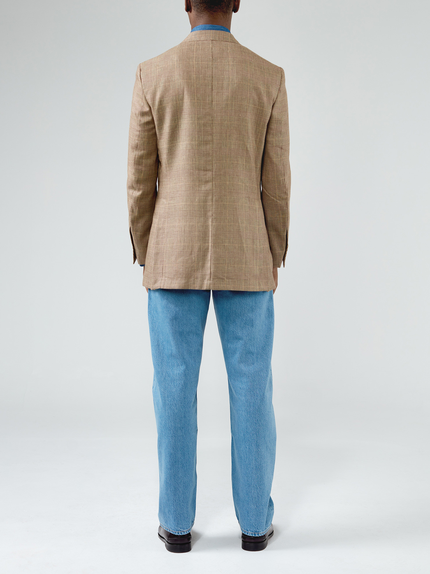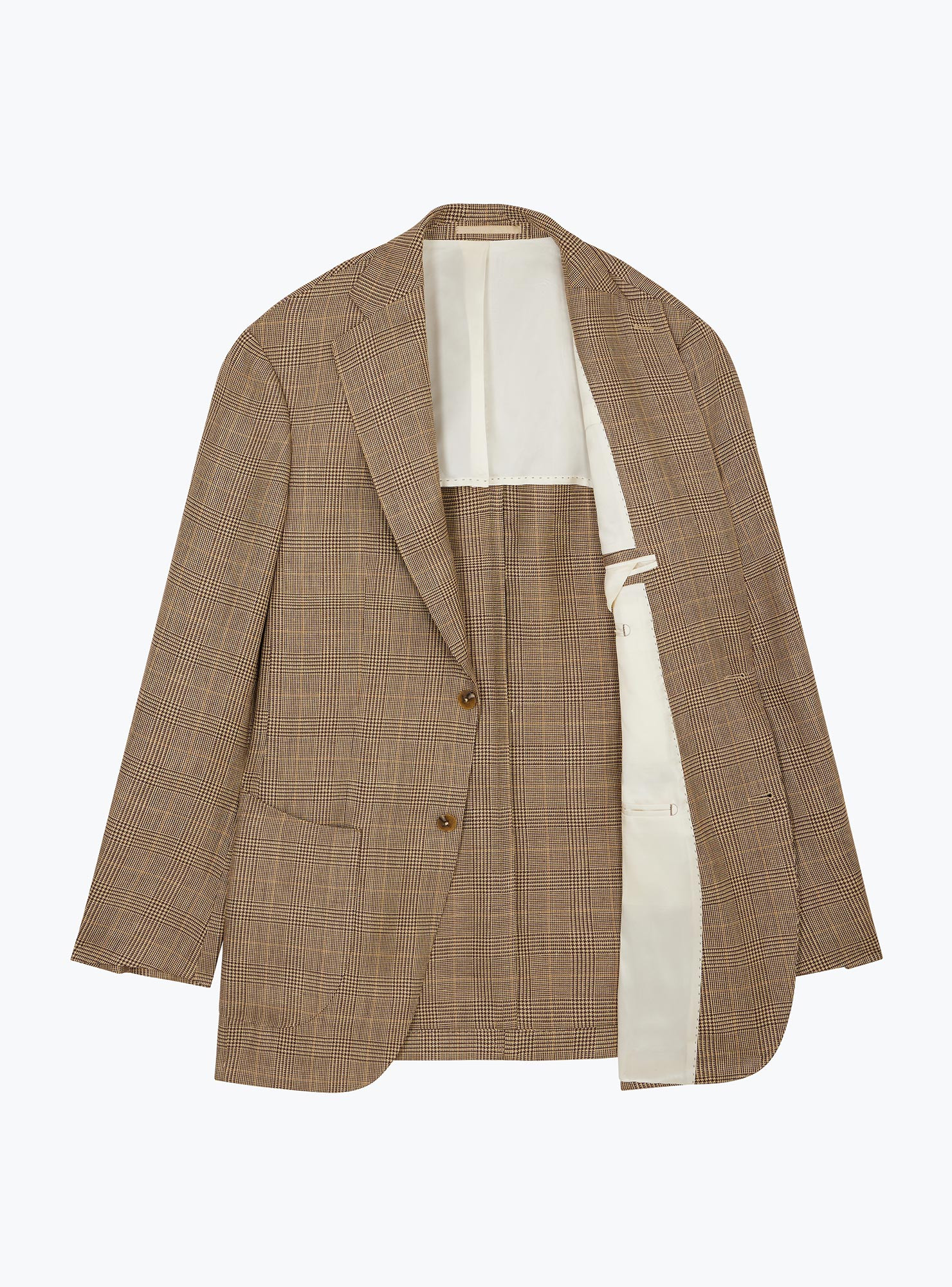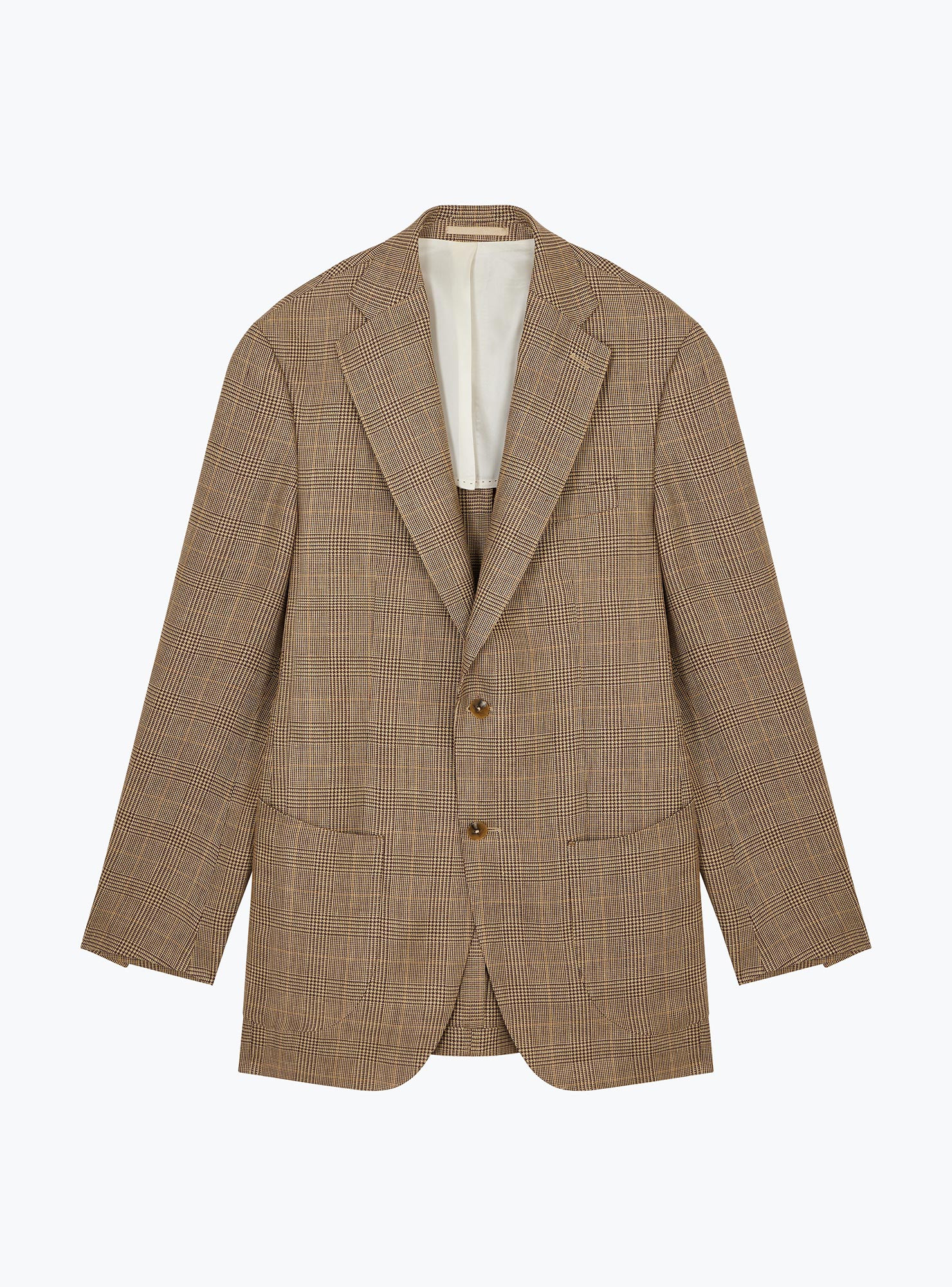 Brown and beige Glencheck patterned wool and linen jacket, classic notch lapel, flap side pockets, two back slits, traditional napolitan shoulder, horn buttons.