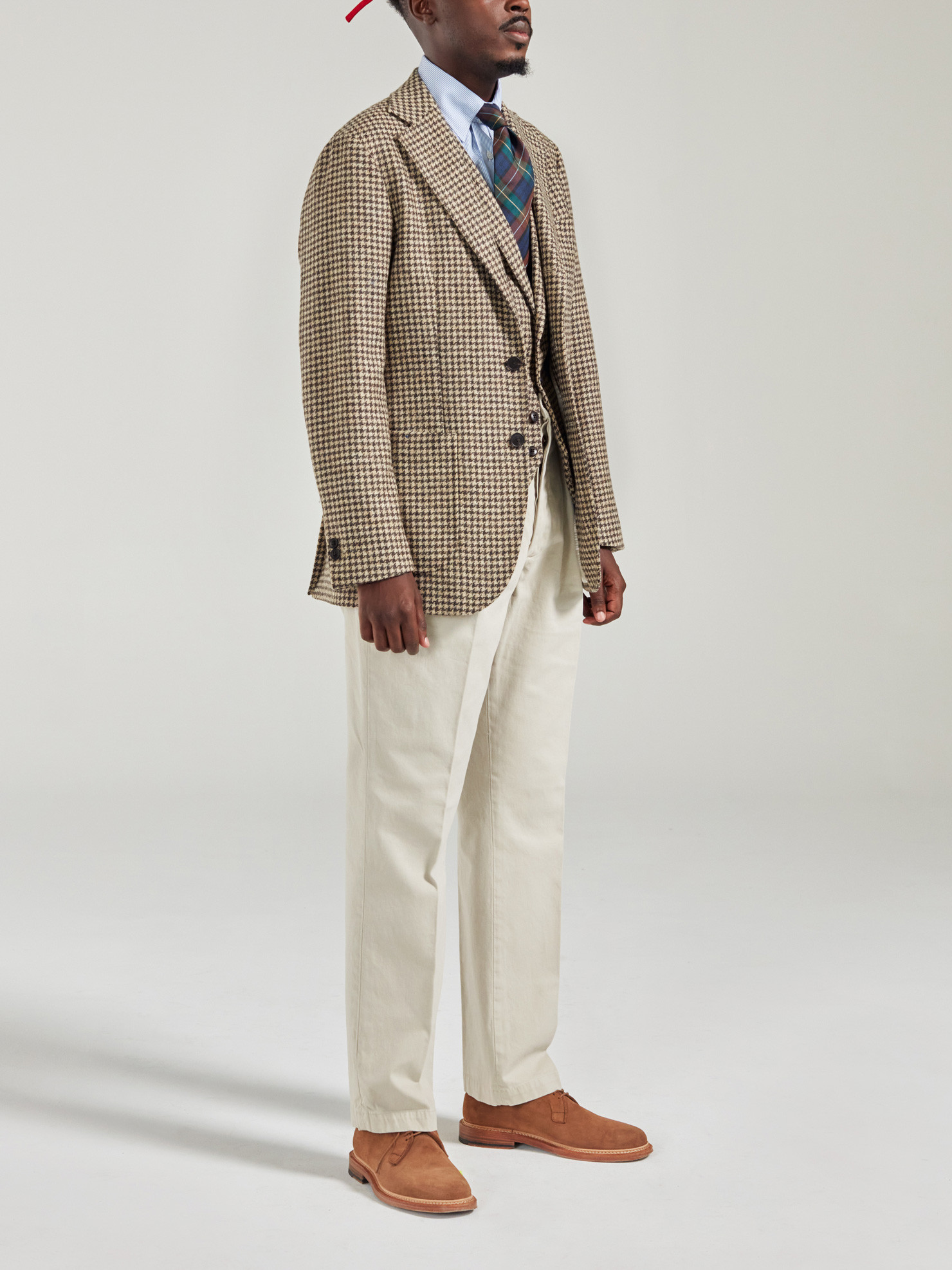 English tweed, houndstooth pattern, tartan tie, thick cotton canvas pants. The shirt collar is "English" too.