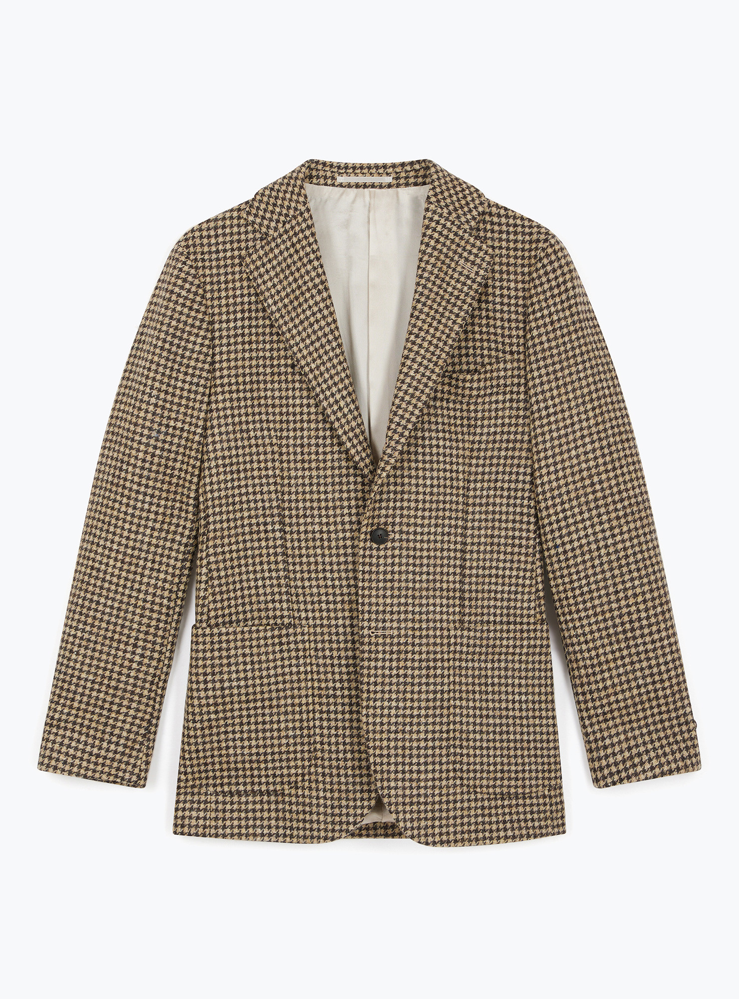 Brown 2.5-button houndstooth jacket in wool and cashmere from Moon. Unconstructed assembly, unconstructed shoulders, 2 side patch pockets, 2 back slits and full inner lining.