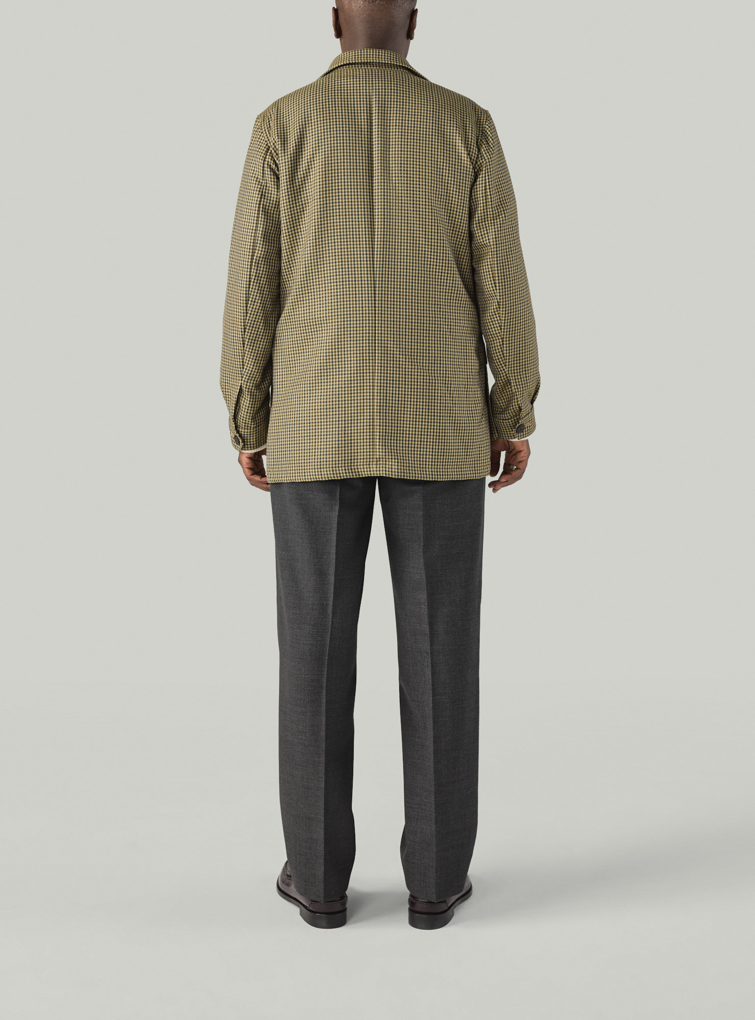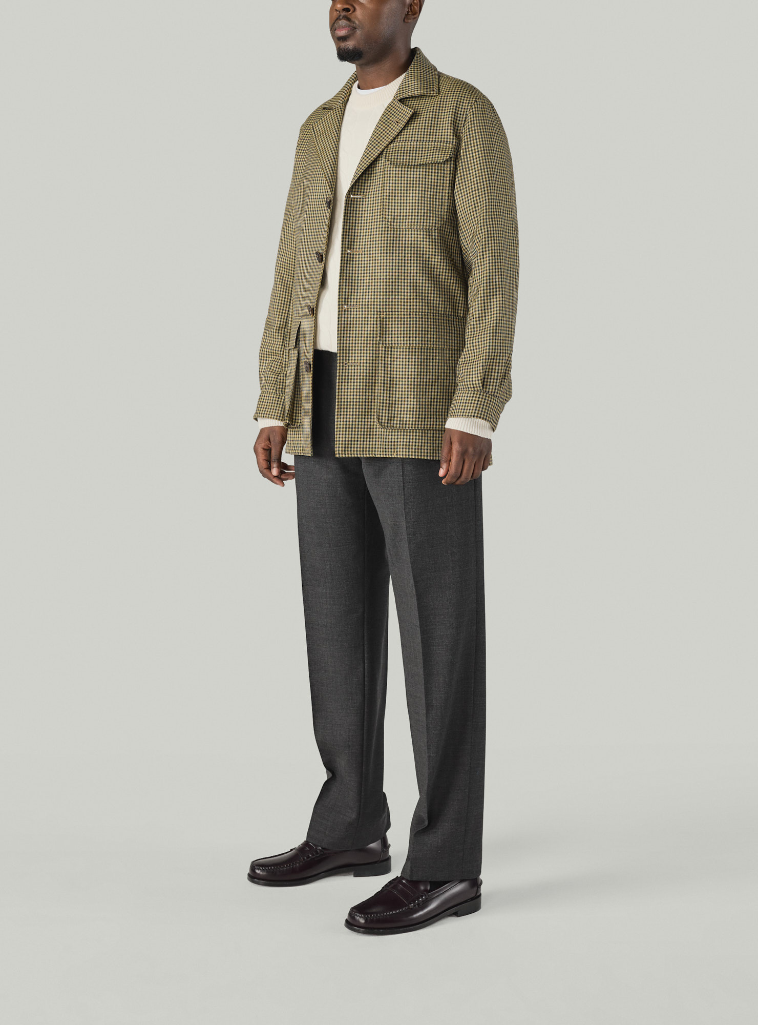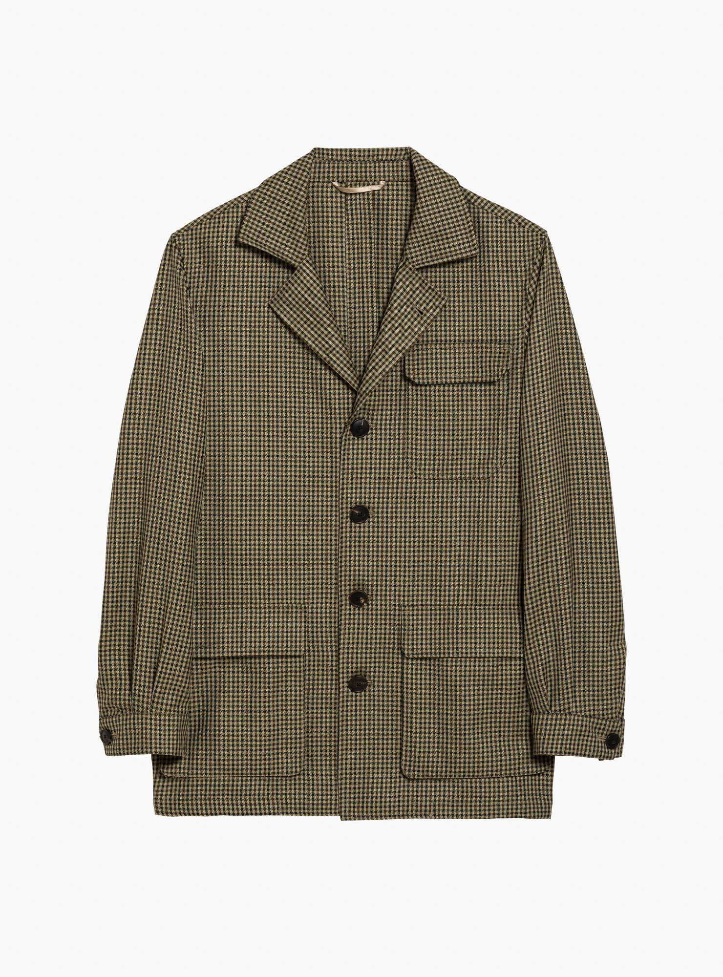 Gun Club Safari Jacket, a four-button unlined sport jacket, featuring a single flap chest pocket and two straight flap hip pockets. Sleeves with pleats and buttoned cuffs for a refined finish.