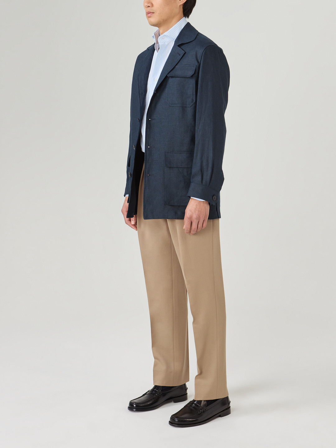 Designed as a travel jacket with generous pockets, it pairs effortlessly with chinos, jeans, or more tailored trousers — like these beige, double-pleated Japanese wool twills.