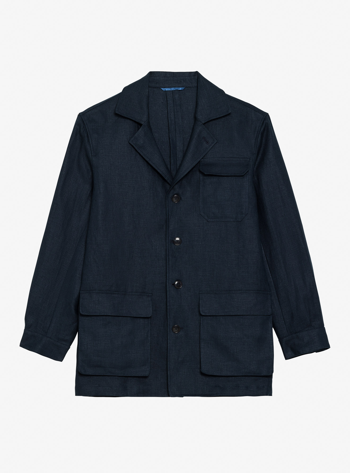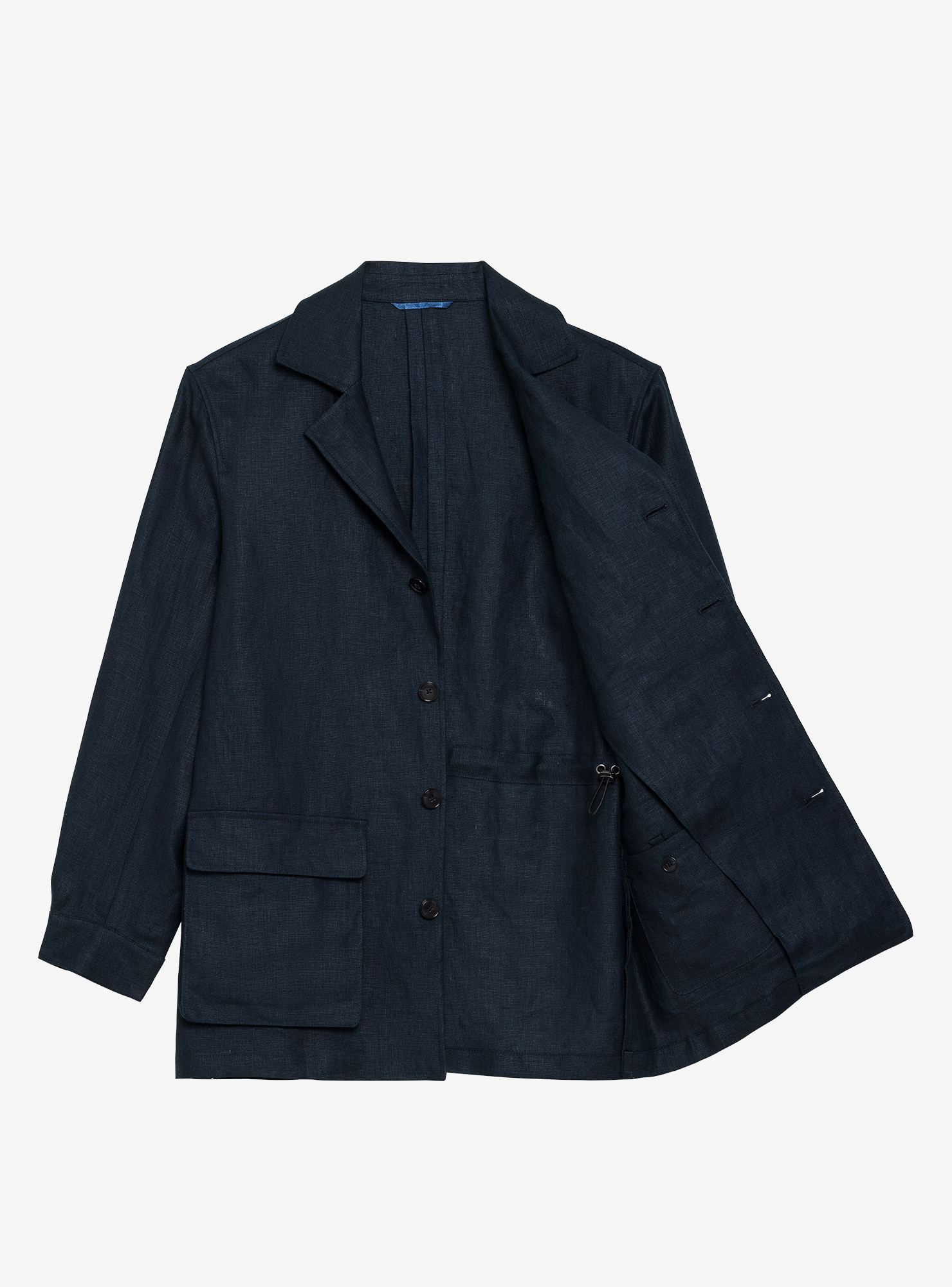 Safari Jacket Linen Navy - Four-button sports jacket, fully unlined, 1 breast pocket with flap, 2 side pockets with flaps. Folded sleeve and buttoned cuffs.