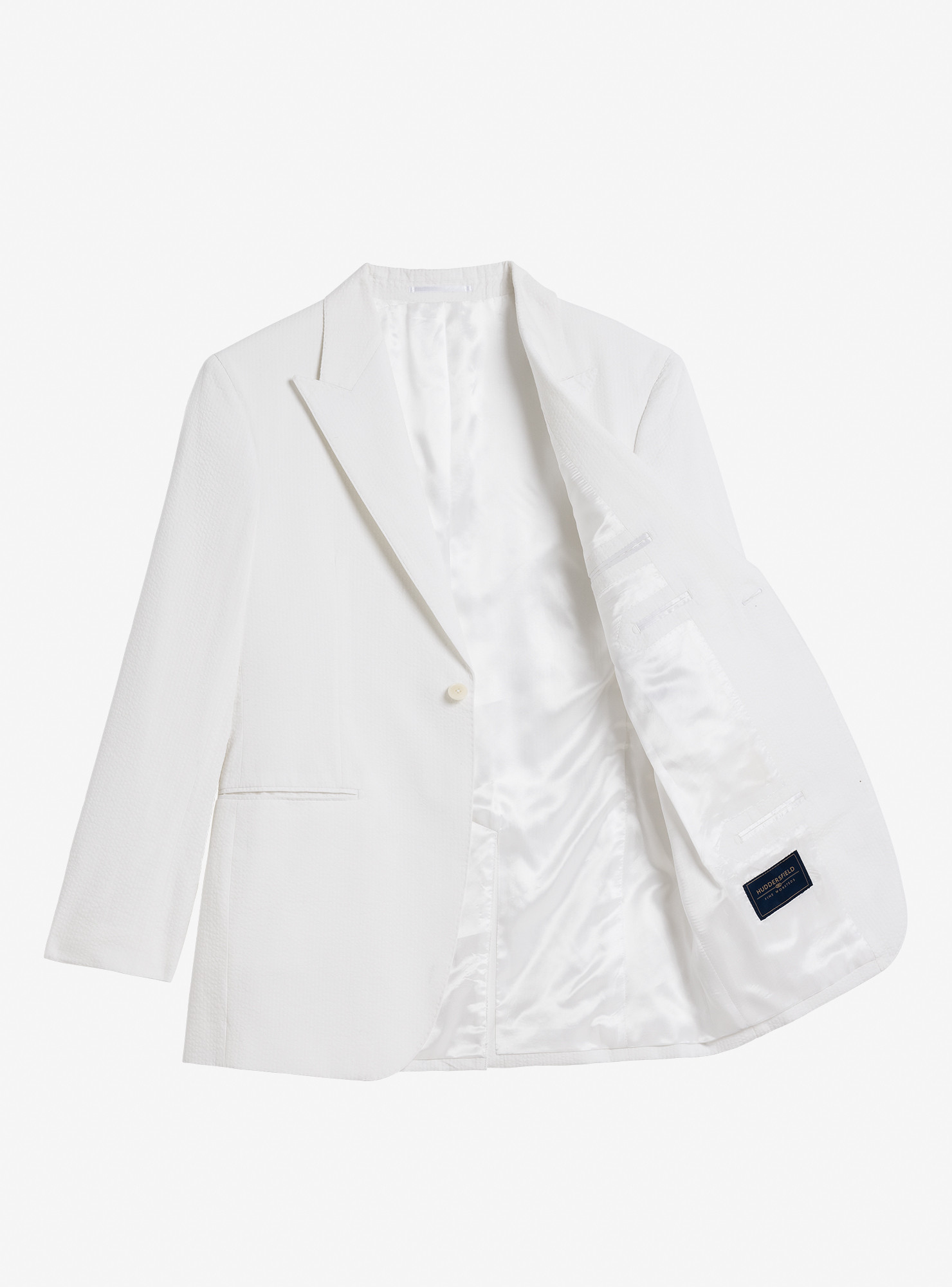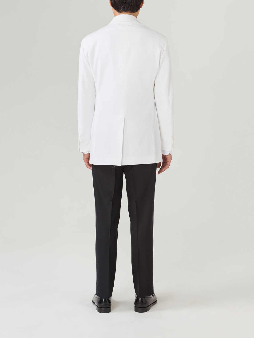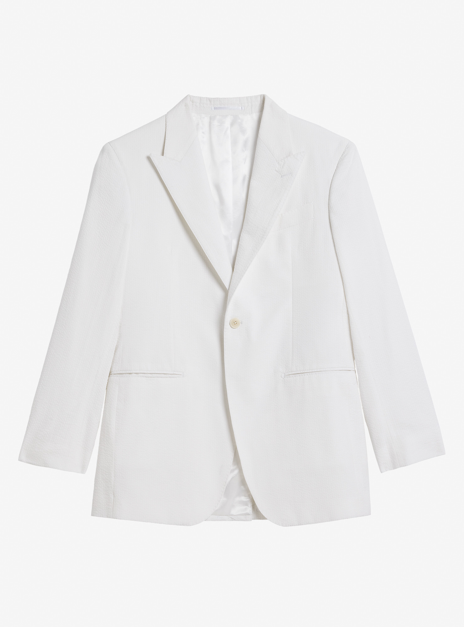 Single breasted jacket 1 notch lapel button. Traditional construction, soft shoulders, jet side pockets, 1 back vent, half-lined inner lining.