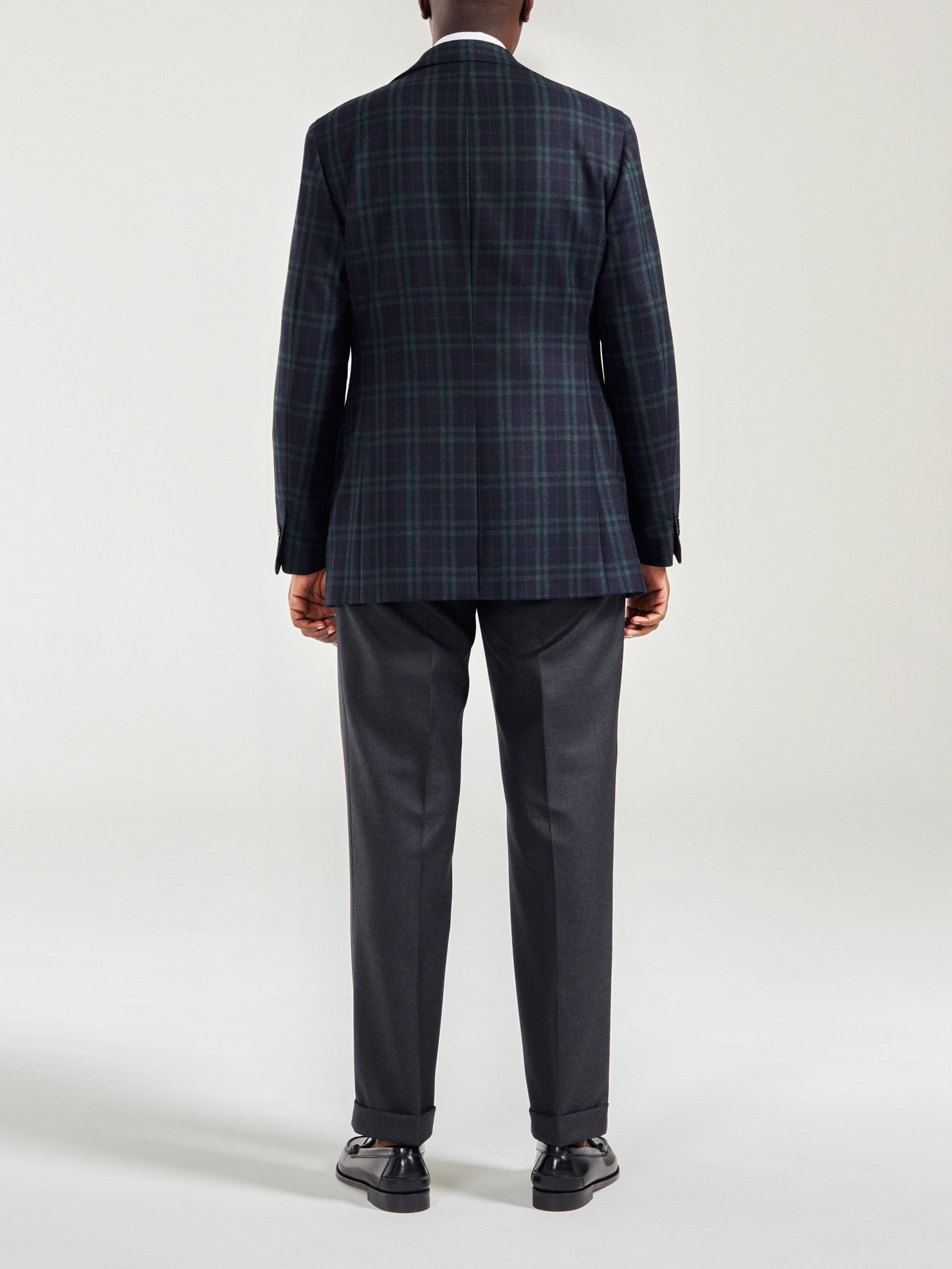 A lovely thick flannel, a centuries-old tartan pattern, quality and simplicity guarantee exceptional durability. This jacket is a tribute to the past while being a symbol of constancy for the future. As the years go by, it will always be there, comforting, beautiful and warm. Cheerful even when paired with this pale yellow cashmere. Bold again with this pretty striped poplin shirt with white collar and club tie. The pants are cut from a thick wool, with double French darts and low lapels.